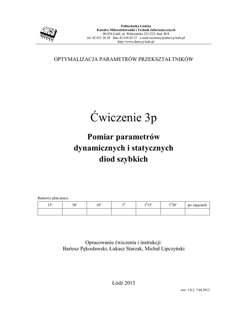Politechnika Łódzka Katedra Mikroelektroniki i Technik Informatycznych 90-924 Łódź, ul. Wólczańska 221/223, bud. B18 tel. 42 631 26 28 faks 42 636 03 27 e-mail [email protected] http://www.dmcs.p.lodz.pl OPTYMALIZACJA PARAMETRÓW PRZEKSZTAŁTNIKÓW Ćwiczenie 3p Pomiar parametrów dynamicznych i statycznych diod szybkich Ramowy plan pracy 15′ 30′ 45′ 1h 1h15′ 1h30′ po zajęciach Opracowanie ćwiczenia i instrukcji: Bartosz Pękosławski, Łukasz Starzak, Michał Lipczyński Łódź 2013 wer. 1.0.2. 7.04.2013 Spis treści B Wprowadzenie do ćwiczenia..............................................................................................................5 1. Cel i przebieg ćwiczenia....................................................................................................................5 2. Podstawy teoretyczne ........................................................................................................................7 2.1. Wprowadzenie .........................................................................................................................7 C Doświadczenie.....................................................................................................................................8 3. Pomiary..............................................................................................................................................8 3.1. Układ pomiarowy ....................................................................................................................8 3.2. Wykonanie pomiarów............................................................................................................11 D Wyniki ...............................................................................................................................................13 4. Opracowanie i analiza wyników......................................................................................................13 E Informacje.........................................................................................................................................15 5. Literatura .........................................................................................................................................15 © 2012 Katedra Mikroelektroniki i Technik Informatycznych Politechniki Łódzkiej B Wprowadzenie do ćwiczenia 1. Cel i przebieg ćwiczenia Celem ćwiczenia jest poznanie parametrów dynamicznych i statycznych diod szybkich oraz zasady pomiaru tych parametrów. Badana jest ultraszybka krzemowa dioda PIN (MUR460) oraz dioda Schottky’ego wykonana z węglika krzemu (C3D04060A). © 2012 Katedra Mikroelektroniki i Technik Informatycznych Politechniki Łódzkiej 2. Podstawy teoretyczne 2.1. Wprowadzenie Szybkie diody mocy są istotnym składnikiem impulsowych przekształtników elektronicznych. Ich parametry statyczne i dynamiczne w znaczący sposób wpływają na osiągi całego układu: maksymalną częstotliwość przełączania, sprawność, poziom emisji zaburzeń itd. Znajdują one szerokie zastosowanie w przemysłowych układach zasilania oraz sieciach trakcyjnych, w związku z czym niezbędna jest ich niezawodność. Kolejne postępy czynione w technologii węglika krzemu dają szansę na dynamiczny rozwój elektroniki mocy, w tym przyrządów takich jak diody. © 2012 Katedra Mikroelektroniki i Technik Informatycznych Politechniki Łódzkiej C Doświadczenie 3. Pomiary 3.1. Układ pomiarowy Układ pomiarowy, którego schemat jest pokazany poniżej, składa się z obwodu mocy z diodą i zewnętrznym dławikiem 130mH, programowalnego zasilacza DC Chroma 62012P-600-8, źródła prądowego GW-Instek PSH-3630A, oscyloskopu z sondą prądową, układu sterowania z optoizolacją i zasilaniem z zasilacza 18V (zasilacz laboratoryjny) oraz portu USB komputera. Dławik Programowalny zasilacz DC Obwód mocy Źródło prądowe Zasilacz 18V Dioda Sonda prądowa Układ sterowania Oscyloskop USB Komputer Rys. 1. Schemat układu pomiarowego © Katedra Mikroelektroniki i Technik Informatycznych Politechniki Łódzkiej Obwód mocy został przestawiony na rysunku 2 i działa na opisanej poniżej zasadzie. Rys. 2. Schemat obwodu mocy Rys. 3. Przebiegi sygnałów sterujących tranzystorami Q1 oraz Q2 Do momentu t1 cały prąd wypływający ze źródła IF płynie przez załączony tranzystor IGBT Q w pętli I (rys. 2). W chwili t1 tranzystor MOSFET M zostaje załączony i cały prąd omijając gałąź z tranzystorem IGBT płynie w pętli II (rys. 2). Tranzystor IGBT jest wtedy jeszcze wysterowany, jednak prąd omija go ze względu na dużo niższą rezystancję tranzystora MOSFET. Napięcie, jakie odkłada się na tranzystorze MOSFET i niewielkiej cewce LQ jest niższe niż napięcie progowe UF(TO) obwodu wyjściowego tranzystora IGBT: UM(IF) < UF(TO) (1) Zależność tę przestawia rysunek 3. W chwili t2 wyłączany jest tranzystor IGBT. Tranzystor MOSFET zostaje wyłączony w chwili t3, badana dioda zostaje wówczas spolaryzowana w kierunku przewodzenia, cały prąd ze źródła IF płynie od tego momentu przez nią. Czas, w którym dioda przewodzi, musi być dostatecznie krótki, aby nie doprowadzić do zbytniego jej nagrzania. W momencie t4 tranzystor MOSFET zostaje ponownie załączony, prąd nie płynie już przez badaną © Katedra Mikroelektroniki i Technik Informatycznych Politechniki Łódzkiej diodę i ponownie płynie w pętli II. Tranzystor IGBT zostaje załączony w chwili t5, jednak nie przewodzi prądu, który dalej płynie w pętli II, gdyż warunek jest ponownie spełniony. MOSFET jest wyłączany w chwili t6. Od tego momentu cały prąd płynie w pętli I, przez tranzystor IGBT. Układ sterowania można podzielić na kilka zasadniczych części. Głównym elementem układu sterowania jest mikrokontroler ATmega 16. Generuje on sygnały sterujące bramkami tranzystorów w obwodzie mocy, realizuje także nastawę stromości diF/dt. Mik