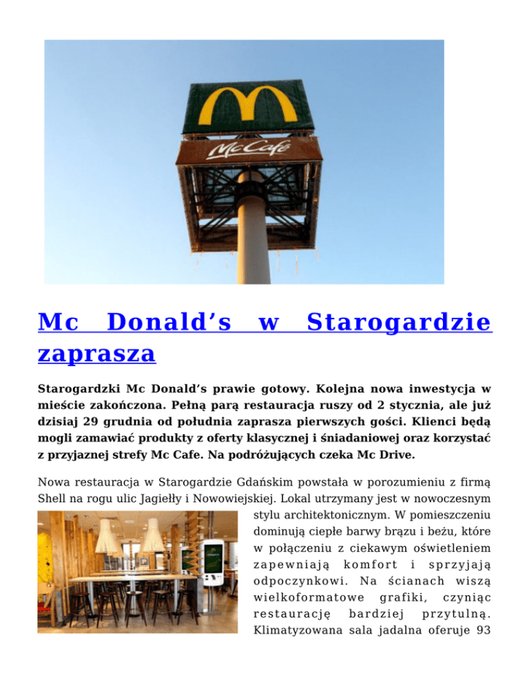 Mc Donald’s zaprasza w Starogardzie Starogardzki Mc Donald’s prawie gotowy. Kolejna nowa inwestycja w mieście zakończona. Pełną parą restauracja ruszy od 2 stycznia, ale już dzisiaj 29 grudnia od południa zaprasza pierwszych gości. Klienci będą mogli zamawiać produkty z oferty klasycznej i śniadaniowej oraz korzystać z przyjaznej strefy Mc Cafe. Na podróżujących czeka Mc Drive. Nowa restauracja w Starogardzie Gdańskim powstała w porozumieniu z firmą Shell na rogu ulic Jagiełły i Nowowiejskiej. Lokal utrzymany jest w nowoczesnym stylu architektonicznym. W pomieszczeniu dominują ciepłe barwy brązu i beżu, które w połączeniu z ciekawym oświetleniem zapewniają komfort i sprzyjają odpoczynkowi. Na ścianach wiszą wielkoformatowe grafiki, czyniąc restaurację bardziej przytulną. Klimatyzowana sala jadalna oferuje 93 miejsca siedzące i dostęp do bezpłatnego wi-fi. Dodatkowo 40 miejsc przygotowano w zewnętrznym ogródku przy restauracji. Tam też znajduje się plac zabaw dla najmłodszych. – Poza klasyczną ofertą Mc Donald’sa na klientów czeka także specjalnie wydzielona strefa kawiarniana Mc Cafe z oddzielnym kontuarem i wygodnymi fotelami – mówi szef restauracji Jerzy Miąsko. – Goście będą mogli wybierać z szerokiej gamy wysokiej jakości gorących i mrożonych kaw oraz ulubionych deserów. Restauracja będzie czynna od 2 stycznia codziennie w godzinach od 6.00 do 24.00. W tych samych godzinach będzie działać linia Mc Drive. Do końca grudnia restauracja będzie otwarta od południa. Nowy Mc Donald’s w Starogardzie zatrudnia 50 osób w tym 9 managerów.
