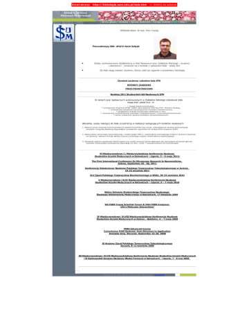 Zrzut strony: http://histologia.sum.edu.pl/kolo.htm <--kliknij na adresie Katedra i Zakład Histologii i Embriologii • Strona główna • Kontakty • Sprawy studenckie • Foreign students • Koło • Atlas • OPIEKUN KOŁA: Dr hab. Piotr Czekaj Przewodniczący SKN - 2012/13: Kamil Sołtysik Osoby zainteresowane działalnością w Kole Naukowym przy Zakładzie Histologii – studenci i absolwenci - proszone są o kontakt z opiekunem Koła - pokój 303 Do Koła mogą należeć studenci, którzy zdali już egzamin z przedmiotu histologia Dorobek naukowy członków koła STN REFERATY ZJAZDOWE PRACE PEŁNOTEKSTOWE Ranking 2011 Studenckich Kół Naukowych STN W ramach prac badawczych wykonywanych w Zakładzie Histologii członkowie Koła mogą brać udział m.in. w: * izolacji frak cji k om órk owych, * oznaczeniach ek spresji m RNA i białek wyk onywanych technik ą PCR i W estern blotting, * oznaczeniach ak tywności enzym atycznych m etodam i biochem icznym i, * prowadzeniu hodowli k om órk owej i badaniach in vitro, * oznaczeniach enzym atycznych m etodam i histochem icznym i i im m unohistochem icznym i, * ocenie uzysk anych wynik ów m etodam i densytom etrycznym i. Aktualnie, osoby należące do Koła uczestniczą w realizacji następujących tematów naukowych: 1. Badania zm ian ek spresji horm onozależnych cytochrom ów P450 oraz innych, niepożądanych sk utk ów desensytyzacji przysadk i m ózgowej wywołanej długotrwałym podawaniem agonistów lub antagonistów receptora GnRH. 2. W pływ efek tu ochronnego preconditioningu, m ałych dawek TNF-α i niedok rwienia przerywanego k rótk im i ok resam i reperfuzji na struk turę i wybrane funk cje wątroby szczura w przebiegu zespołu niedok rwienno-reperfuzyjnego. 3. Ak tywność szlak ów sygnałowych Notch/Ligand oraz profile ek spresji genów właściwych dla różnicowania pluripotencjalnych k om órek m acierzystych pochodzenia szpik owego do ek to-, endo- i m ezoderm alnych linii k om órk owych. VI Międzynarodowa i L Międzywydziałowa Konferencja Naukowa Studentów Uczelni Medycznych w Katowicach – Ligocie, 5 – 6 maja 2011r The First International Conference On Microscopy Research In Nanomedicine, Zabrze, September 29 - 30, 2011, Konferencja Szkoleniowo-Naukowa Polskiego Towarzystwa Toksykologicznego w Juracie, 19-22 września 2011 XLV Zjazd Polskiego Towarzystwa Biochemicznego w Wiśle, 20-23 września 2010 V Międzynarodowa i XLIX Międzywydziałowa Konferencja Naukowa Studentów Uczelni Medycznych w Katowicach – Ligocie, 6 – 7 maja 2010 Walne Zebranie Studenckiego Towarzystwa Naukowego Śląskiego Uniwersytetu Medycznego w Katowicach, 17 listopada 2009 9th FEBS Young Scientist Forum & 34th FEBS Congress: ‘Life’s Molecular Interactions’ IV Międzynarodowa i XLVIII Międzywydziałowa Konferencja Naukowa Studentów Uczelni Medycznych w Zabrzu – Rokitnicy, 6 – 7 maja 2009 FEBS Advanced Course Cytochrome P450 Systems: from Structure to Application Kranjska Gora, Slovenia, September 23-28, 2008 IX Krajowy Zjazd Polskiego Towarzystwa Toksykologicznego Szczyrk, 8-12 września 2008 III Międzynarodowa i XLVII Międzywydziałowa Konferencja Naukowa Studentów Uczelni Medycznych i II Ogólnopolski Kongres Naukowy Młodej Farmacji w Katowicach – Ligocie, 7 - 8 maj 2008 Copyright © 2007 Śląski Uniw ersytet Medyczny W ebm aster