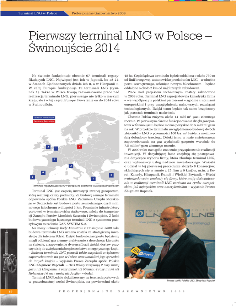Terminal LNG w Polsce Profesjonalne Gazownictwo 2009 Pierwszy terminal LNG w Polsce – Świnoujście 2014 Na świecie funkcjonuje obecnie 67 terminali regazyfikujących LNG. Najwięcej jest ich w Japonii, bo aż 24, w Stanach Zjednoczonych działa ich 8, a w Hiszpanii 6. W całej Europie funkcjonuje 19 terminali LNG (rysunek 1). Także w Polsce trwają zaawansowane prace nad realizacją terminalu LNG, pierwszego nie tylko w naszym kraju, ale i w tej części Europy. Powstanie on do 2014 roku w Świnoujściu. Działające terminale (19) Terminal w Świnoujściu 3 1 1 3 2 6 2 1 1 Terminale regazyfikujące LNG w Europie, na podstawie www.globallnginfo.com Terminal LNG jest częścią inwestycji zwanej gazoportem, którą realizują cztery podmioty. Za budowę samego terminalu odpowiada spółka Polskie LNG. Zadaniem Urzędu Morskiego w Szczecinie jest budowa portu zewnętrznego, czyli m.in. nowego falochronu o długości 3 km. Powstanie infrastruktury portowej, w tym stanowiska statkowego, należy do kompetencji Zarządu Portów Morskich Szczecin i Świnoujście. Z kolei budowa gazociągu łączącego terminal LNG z systemem przesyłowym to zadanie GAZ-SYSTEM S.A. Na mocy uchwały Rady Ministrów z 19 sierpnia 2008 roku budowa terminalu LNG uznana została za strategiczną inwestycję dla interesu Polski. Dzięki budowie gazoportu będziemy mogli odbierać gaz ziemny praktycznie z dowolnego kierunku na świecie, a zapewnienie dywersyfikacji źródeł dostaw przyczyni się do zwiększenia bezpieczeństwa energetycznego kraju. – Budowa terminalu LNG pozwoli także zaspokoić zwiększone zapotrzebowanie na gaz w Polsce oraz umożliwi jego sprzedaż do innych krajów – wyjaśnia Prezes Zarządu spółki Polskie LNG Zbigniew Rapciak. – Dziś Polacy zużywają 2 razy mniej gazu niż Hiszpanie, 3 razy mniej niż Niemcy, 4 razy mniej niż Holendrzy i 6 razy mniej niż Anglicy – dodał. Terminal LNG będzie zlokalizowany na terenach portowych w prawobrzeżnej części Świnoujścia, na powierzchni około 86 P R O F E S J O N A L N E G A 48 ha. Część lądowa terminalu będzie oddalona o około 750 m od linii brzegowej, a stanowisko przeładunku LNG – w obrębie portu zewnętrznego, osłonięte nowym falochronem – będzie oddalone o około 2 km od najbliższych zabudowań. Prace nad projektem technicznym zostały zakończone w 2009 roku. Terminal LNG zaprojektowała kanadyjska firma – we współpracy z polskimi partnerami – zgodnie z normami europejskimi i przy uwzględnieniu najnowszych rozwiązań technologicznych. Dzięki temu będzie tak samo bezpieczny jak pozostałe terminale na świecie. Obecnie Polska zużywa około 14 mld m3 gazu ziemnego rocznie. W pierwszym okresie funkcjonowania dzięki gazoportowi w Świnoujściu będzie można pozyskać do 5 mld m3 gazu na rok. W projekcie terminalu uwzględnionoo budowę dwóch zbiorników LNG o pojemności 160 tys. m3 każdy, z możliwością dobudowy trzeciego. Dzięki temu w razie zwiększonego zapotrzebowania na gaz wydajność gazportu wzrośnie do 7,5 mld m3 gazu ziemnego rocznie. W 2009 roku nastąpiło znacznie przyspieszenie realizacji inwestycji. W decydującej fazie znajdują się postępowania dotyczące wyboru firmy, która zbuduje terminal LNG, oraz wykonawcy usług nadzoru inwestorskiego. Wnioski o udział w tej pierwszej procedurze złożyło 8 konsorcjów, składających się w sumie z 25 firm z 9 krajów, m.in. z Korei, Kanady, Hiszpanii, Francji i Wielkiej Brytanii. – Wśród wnioskodawców znalazły się firmy, które mają doświadczenie w realizacji terminali LNG zarówno na rynku europejskim, jak azjatyckim oraz amerykańskim – wyjaśnia Prezes Zbigniew Rapciak. Prezes spółki Polskie LNG Zbigniew Rapciak Z O W N I C T W O 2 0 0 9