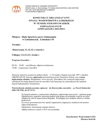 ŁÓDZKI SZKOLNY ZWIĄZEK SPORTOWY 90-542 Łódź, ul. Żeromskiego 115 tel/fax (042) 6307345, (042) 6307346 NIP 725-10-87-580 REGON 470963007 e-mail:[email protected] KOMUNIKAT ORGANIZACYJNY FINAŁU WOJEWÓDZTWA ŁODZKIEGO W TENISIE STOŁOWYM SZKÓŁ GIMNAZJALNYCH GIMNAZJADA 2012/2013. Miejsce : Hala Sportowa przy Gimnazjum w Łobudzicach, Łobudzice 54 Termin : Dziewczęta 11.12.12 ( wtorek ) Chłopcy 12.12.12 ( środa ) Program Zawodów : 09.30 - 10.00 – weryfikacja, odprawa techniczna 10.00 – rozpoczęcie zawodów Drużynę stanowią uczniowie jednej szkoły – I i II zespół z Rejonu (rocznik 1997 i młodsi). OBOWIĄZUJE imienne zgłoszenie potwierdzone przez Dyrektora Szkoły oraz ważna legitymacja szkolna. (Regulamin: www.lszs.pl). Zawodnicy bez ważnych legitymacji szkolnych nie będą dopuszczeni do zawodów (nie honoruje się zaświadczeń ani żadnych innych dokumentów tożsamości). Potwierdzenie udziału prosimy zgłaszać do Kierownika zawodów – p. Paweł Siekierski (606 340 256), do 07.12.12 · · · · · · Za bezpieczeństwo i zachowanie młodzieży odpowiada nauczyciel - opiekun grupy. Opiekunowie zespołów sprawują nadzór nad grupą od momentu wejścia na teren obiektu do chwili opuszczenia budynku. Wymagane jest miękkie obuwie o białej podeszwie. Za rzeczy pozostawione bez opieki organizator (zaginięcie, kradzież) nie ponosi odpowiedzialności. Opiekunów obowiązuje zmiana obuwia. Opłata startowa wynosi 3 PLN od uczestnika Koordynator Wojewódzki ŁSZS Mariusz Kuświk