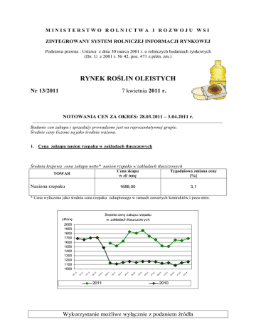 MINISTERSTWO ROLNICTWA I ROZWOJU WSI ZINTEGROWANY SYSTEM ROLNICZEJ INFORMACJI RYNKOWEJ Podstawa prawna : Ustawa z dnia 30 marca 2001 r. o rolniczych badaniach rynkowych (Dz. U. z 2001 r. Nr 42, poz. 471 z późn. zm.) RYNEK ROŚLIN OLEISTYCH Nr 13/2011 7 kwietnia 2011 r. NOTOWANIA CEN ZA OKRES: 28.03.2011 – 3.04.2011 r. Badanie cen zakupu i sprzedaży prowadzone jest na reprezentatywnej grupie. Średnie ceny liczone są jako średnia ważona. 1. Cena zakupu nasion rzepaku w zakładach tłuszczowych Średnia krajowa cena zakupu netto* nasion rzepaku w zakładach tłuszczowych TOWAR Nasiona rzepaku Cena skupu w zł/ tonę Tygodniowa zmiana ceny [%] 1688,00 3,1 * Cena wyliczona jako średnia cena rzepaku zakupionego w ramach zawartych kontraktów i poza nimi. Średnie ceny zakupu rzepaku w zakładach tłuszczow ych zł/tonę 4 03 .0 3 27 .0 3 20 .0 3 13 .0 3 06 .0 2 2 2 27 .0 2 20 .0 13 .0 06 .0 1 1 1 30 .0 1 23 .0 16 .0 1 2 2 2 2011 09 .0 02 .0 26 .1 19 .1 12 .1 05 .1 2 2000 1900 1800 1700 1600 1500 1400 1300 1200 1100 1000 2010 Wykorzystanie możliwe wyłącznie z podaniem źródła 2. Ceny sprzedaży oleju rzepakowego, śruty rzepakowej oraz makuchu rzepakowego Średnia krajowa cena sprzedaży netto oleju rafinowanego TOWAR Cena sprzedaży w zł/ tonę Tygodniowa zmiana ceny [%] Olej rzepakowy rafinowany 4092,00 -1,7 Średnie ceny sprzedaży oleju rzepakow ego rafinow anego w zakładach tłuszczow ych zł/tonę 4300 4100 3900 3700 3500 3300 3100 2900 3 03 .0 4 3 27 .0 3 2011 20 .0 3 13 .0 2 06 .0 2 27 .0 20 .0 2 13 .0 2 06 .0 1 30 .0 1 1 23 .0 1 16 .0 1 09 .0 2 2 02 .0 26 .1 19 .1 2 05 .1 12 .1 2 2700 2010 Średnia krajowa cena sprzedaży netto śruty rzepakowej TOWAR Cena sprzedaży Tygodniowa zmiana ceny w zł/ tonę [%] 778,00 9,0 Śruta rzepakowa Średnie ceny sprzedaży śruty rzepakow ej w zakładach tłuszczow ych zł/tonę 800 750 700 650 600 550 3 .0 .0 4 03 20 27 .0 3 3 13 .0 3 06 .0 2 27 .0 2 .0 2 .0 13 20 2 .0 1 .0 06 30 1 .0 1 .0 2011 23 1 .0 16 .0 1 09 2 02 26 .1 2 2 .1 19 .1 12 05 .1 2 500 450 400 2010 Wykorzystanie możliwe wyłącznie z podaniem źródła Średnia krajowa cena sprzedaży netto makuchu rzepakowego Cena sprzedaży TOWAR w zł/ tonę Makuch rzepakowy Tygodniowa zmiana ceny [%] 893,00 0,0 Średnie ceny sprzedaży makuchu rzepakow ego w zakładach tłuszczow ych zł/tonę 950 900 850 800 750 700 650 600 550 3 4 03 .0 3 3 27 .0 20 .0 3 13 .0 2 2 06 .0 27 .0 2 1 2 20 .0 13 .0 06 .0 30 .0 1 1 23 .0 1 16 .0 09 .0 2 2 02 .0 1 26 .1 19 .1 2 05 .1 12 .1 2 500 2011 2010 Polski handel nasionami rzepaku (CN 1205) w styczniu 2011 r. (dane wstępne ) według ważniejszych krajów. EKSPORT IMPORT I 2010r. Kraj OGÓŁEM Niemcy Republika Czeska I 2011r. Wartość Wolumen [tys. EUR] [tony] 3 561 2 657 904 13 394 9 943 3 451 Kraj OGÓŁEM Niemcy Republika Czeska Wielka Brytania Francja I 2010r. Wartość Wolumen [tys. EUR] [tony] 7 422 6 561 352 267 138 22 358 19 893 1 064 807 419 Kraj OGÓŁEM Niemcy Słowacja Republika Czeska Ukraina I 2011r. Wartość Wolumen [tys. EUR] [tony] 3 123 1 332 762 496 389 11 442 4 917 2 670 1 823 1 525 Kraj OGÓŁEM Ukraina Republika Czeska Słowacja Źródło: Dane CIHZ , MF Wykorzystanie możliwe wyłącznie z podaniem źródła Wartość Wolumen [tys. EUR] [tony] 2 680 1 680 469 287 5 866 3 900 930 830 Polski handel olejem rzepakowym (CN 1514) w styczniu 2011 r. (dane wstępne) według ważniejszych krajów. EKSPORT IMPORT I 2010r. Kraj OGÓŁEM Niemcy Republika Czeska Austria Wielka Brytania Litwa Słowacja I 2011r. Wartość Wolumen [tys. EUR] [tony] 13 682 8 593 1 556 1 501 1 333 353 193 21 719 13 784 2 442 2 461 2 077 496 267 Kraj OGÓŁEM Niemcy Austria Republika Czeska Litwa Wielka Brytania Słowacja I 2010r. Wartość Wolumen [tys. EUR] [tony] 8 305 5 354 1 029 930 324 242 167 7 710 4 646 1 118 1 043 259 290 144 Kraj OGÓŁEM Republika Czeska Niemcy Hiszpania I 2011r. Wartość Wolumen [tys. EUR] [tony] 1 029 321 182 182 1 083 465 173 136 Kraj OGÓŁEM Niemcy Belgia Republika Czeska Słowacja Źródło: Dane CIHZ , MF Biuletyn „Rynek roślin oleistych” ukazuje się w każdy czwartek o godz. 13 Wydawca: Ministerstwo Rolnictwa i Rozwoju Wsi, ul. Wspólna 30; 00-930 Warszawa Departament Rynków Rolnych tel. (022) 623-16-33, fax (022) 623-27-06 Internet: strona ZSRIR; E-mail: [email protected] Autor: Anna Pankiewicz, tel. (022) 623-16-33; E -mail: [email protected] Warunki otrzymywania biuletynu: Biuletyn udostępniany jest wszystkim zainteresowanym bezpłatnie. Wykorzystanie możliwe wyłącznie z podaniem źródła Wartość Wolumen [tys. EUR] [tony] 1 753 705 569 267 166 1 731 748 640 238 79