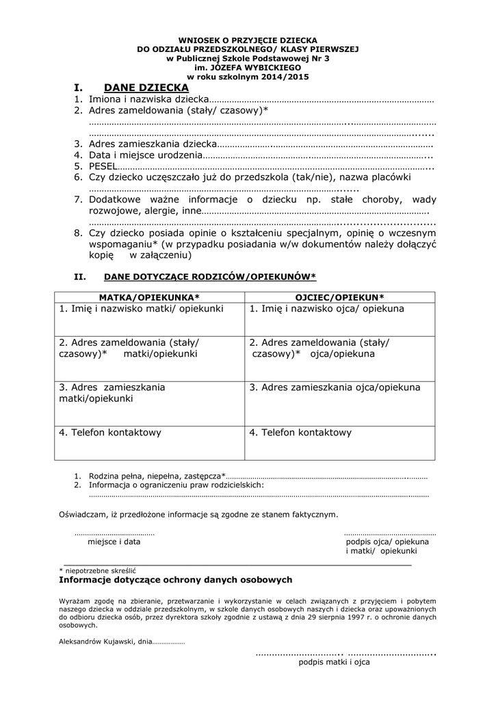 WNIOSEK O PRZYJĘCIE DZIECKA DO ODZIAŁU PRZEDSZKOLNEGO/ KLASY PIERWSZEJ w Publicznej Szkole Podstawowej Nr 3 im. JÓZEFA WYBICKIEGO w roku szkolnym 2014/2015 I. DANE DZIECKA II. DANE DOTYCZĄCE RODZICÓW/OPIEKUNÓW* 1. Imiona i nazwiska dziecka……………………………………………………………………………… 2. Adres zameldowania (stały/ czasowy)* …………………………………………………………………………………………...…………………………… …………………………………………………………………………………………………………………....... 3. Adres zamieszkania dziecka………………….………………………………………………………. 4. Data i miejsce urodzenia…………………………………….………………………………………... 5. PESEL……………………………………………………………………………………………………………... 6. Czy dziecko uczęszczało już do przedszkola (tak/nie), nazwa placówki ………………………………………………………………………………………....... 7. Dodatkowe ważne informacje o dziecku np. stałe choroby, wady rozwojowe, alergie, inne………………………………………………………………………………. ……………………………………………………………………………………….............................. 8. Czy dziecko posiada opinie o kształceniu specjalnym, opinię o wczesnym wspomaganiu* (w przypadku posiadania w/w dokumentów należy dołączyć kopię w załączeniu) MATKA/OPIEKUNKA* OJCIEC/OPIEKUN* 1. Imię i nazwisko matki/ opiekunki 1. Imię i nazwisko ojca/ opiekuna 2. Adres zameldowania (stały/ czasowy)* matki/opiekunki 2. Adres zameldowania (stały/ czasowy)* ojca/opiekuna 3. Adres zamieszkania matki/opiekunki 3. Adres zamieszkania ojca/opiekuna 4. Telefon kontaktowy 4. Telefon kontaktowy 1. Rodzina pełna, niepełna, zastępcza*……………………………………………………………………………..……… 2. Informacja o ograniczeniu praw rodzicielskich: ………………………………………………………………………………………………………………………………………….……… Oświadczam, iż przedłożone informacje są zgodne ze stanem faktycznym. ………………………………… miejsce i data ……………………………………… podpis ojca/ opiekuna i matki/ opiekunki ____________________________________________________________ * niepotrzebne skreślić Informacje dotyczące ochrony danych osobowych Wyrażam zgodę na zbieranie, przetwarzanie i wykorzystanie w celach związanych z przyjęciem i pobytem naszego dziecka w oddziale przedszkolnym, w szkole danych osobowych naszych i dziecka oraz upoważnionych do odbioru dziecka osób, przez dyrektora szkoły zgodnie z ustawą z dnia 29 sierpnia 1997 r. o ochronie danych osobowych. Aleksandrów Kujawski, dnia……………… ………………………….. ………………………….. podpis matki i ojca