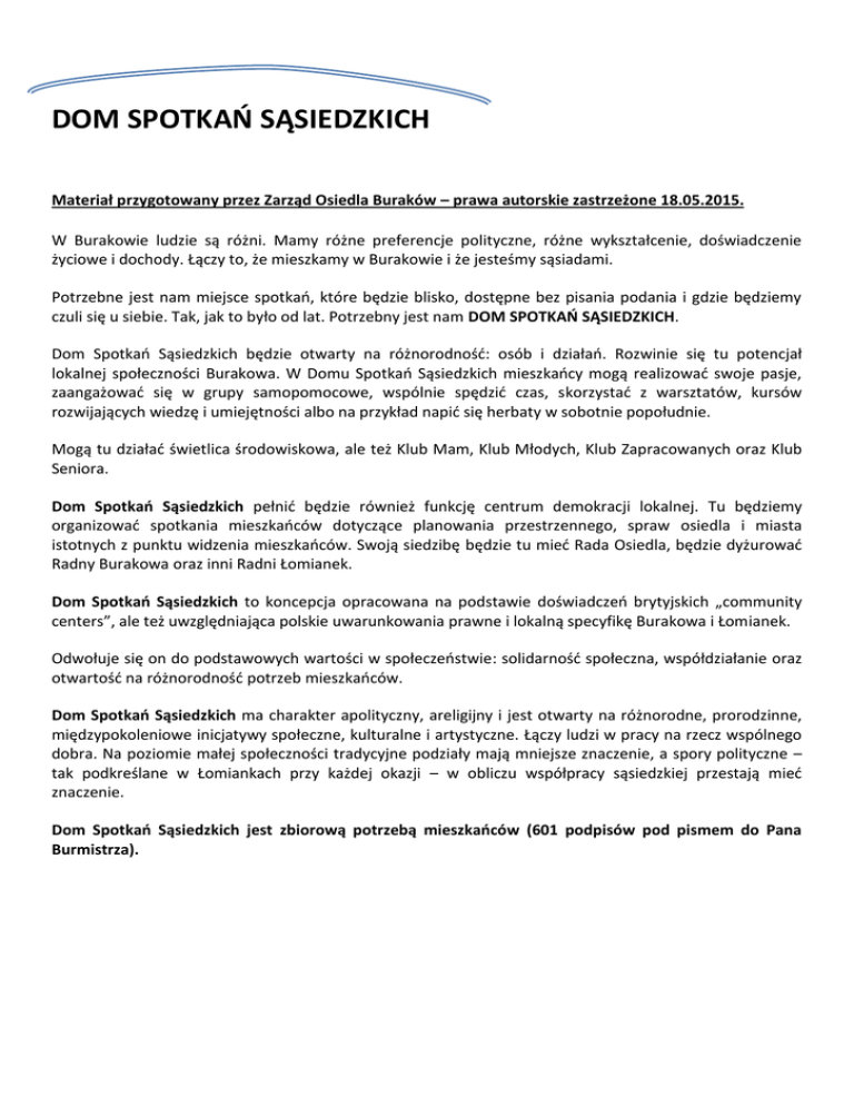 DOM SPOTKAŃ SĄSIEDZKICH Materiał przygotowany przez Zarząd Osiedla Buraków – prawa autorskie zastrzeżone 18.05.2015. W Burakowie ludzie są różni. Mamy różne preferencje polityczne, różne wykształcenie, doświadczenie życiowe i dochody. Łączy to, że mieszkamy w Burakowie i że jesteśmy sąsiadami. Potrzebne jest nam miejsce spotkań, które będzie blisko, dostępne bez pisania podania i gdzie będziemy czuli się u siebie. Tak, jak to było od lat. Potrzebny jest nam DOM SPOTKAŃ SĄSIEDZKICH. Dom Spotkań Sąsiedzkich będzie otwarty na różnorodność: osób i działań. Rozwinie się tu potencjał lokalnej społeczności Burakowa. W Domu Spotkań Sąsiedzkich mieszkańcy mogą realizować swoje pasje, zaangażować się w grupy samopomocowe, wspólnie spędzić czas, skorzystać z warsztatów, kursów rozwijających wiedzę i umiejętności albo na przykład napić się herbaty w sobotnie popołudnie. Mogą tu działać świetlica środowiskowa, ale też Klub Mam, Klub Młodych, Klub Zapracowanych oraz Klub Seniora. Dom Spotkań Sąsiedzkich pełnić będzie również funkcję centrum demokracji lokalnej. Tu będziemy organizować spotkania mieszkańców dotyczące planowania przestrzennego, spraw osiedla i miasta istotnych z punktu widzenia mieszkańców. Swoją siedzibę będzie tu mieć Rada Osiedla, będzie dyżurować Radny Burakowa oraz inni Radni Łomianek. Dom Spotkań Sąsiedzkich to koncepcja opracowana na podstawie doświadczeń brytyjskich „community centers”, ale też uwzględniająca polskie uwarunkowania prawne i lokalną specyfikę Burakowa i Łomianek. Odwołuje się on do podstawowych wartości w społeczeństwie: solidarność społeczna, współdziałanie oraz otwartość na różnorodność potrzeb mieszkańców. Dom Spotkań Sąsiedzkich ma charakter apolityczny, areligijny i jest otwarty na różnorodne, prorodzinne, międzypokoleniowe inicjatywy społeczne, kulturalne i artystyczne. Łączy ludzi w pracy na rzecz wspólnego dobra. Na poziomie małej społeczności tradycyjne podziały mają mniejsze znaczenie, a spory polityczne – tak podkreślane w Łomiankach przy każdej okazji – w obliczu współpracy sąsiedzkiej przestają mieć znaczenie. Dom Spotkań Sąsiedzkich jest zbiorową potrzebą mieszkańców (601 podpisów pod pismem do Pana Burmistrza).
