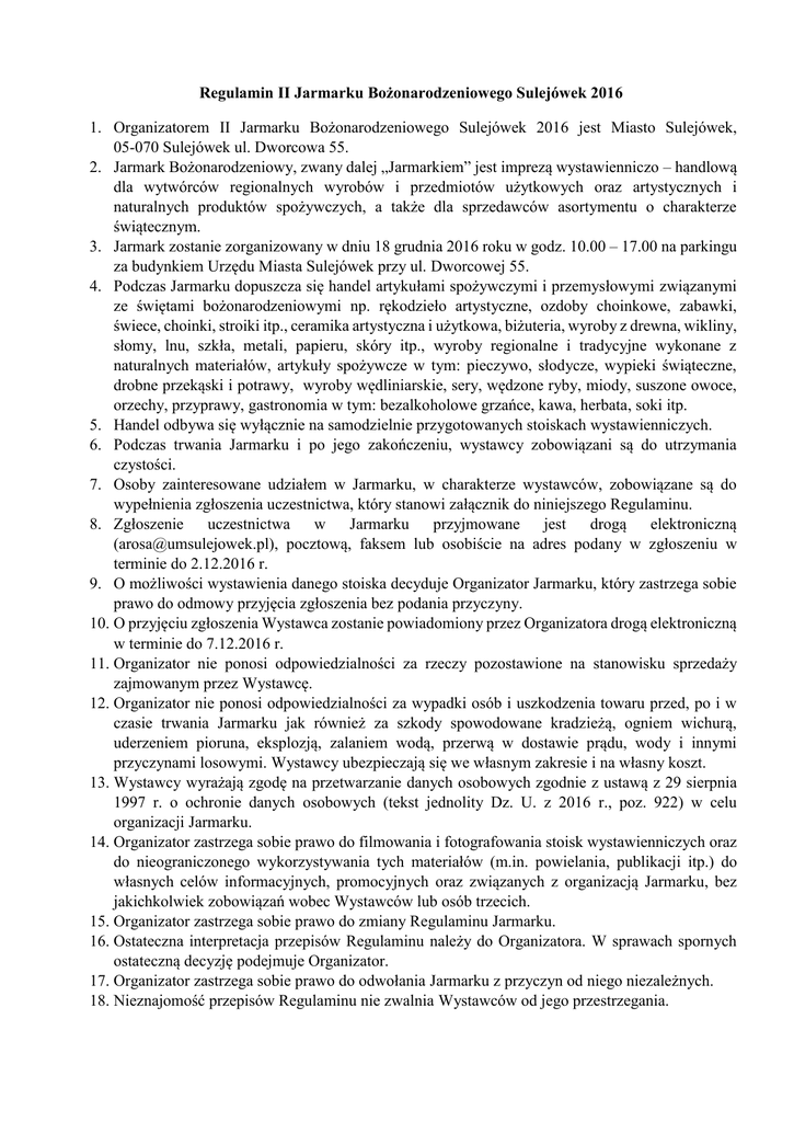 Regulamin II Jarmarku Bożonarodzeniowego Sulejówek 2016 1. Organizatorem II Jarmarku Bożonarodzeniowego Sulejówek 2016 jest Miasto Sulejówek, 05-070 Sulejówek ul. Dworcowa 55. 2. Jarmark Bożonarodzeniowy, zwany dalej „Jarmarkiem” jest imprezą wystawienniczo – handlową dla wytwórców regionalnych wyrobów i przedmiotów użytkowych oraz artystycznych i naturalnych produktów spożywczych, a także dla sprzedawców asortymentu o charakterze świątecznym. 3. Jarmark zostanie zorganizowany w dniu 18 grudnia 2016 roku w godz. 10.00 – 17.00 na parkingu za budynkiem Urzędu Miasta Sulejówek przy ul. Dworcowej 55. 4. Podczas Jarmarku dopuszcza się handel artykułami spożywczymi i przemysłowymi związanymi ze świętami bożonarodzeniowymi np. rękodzieło artystyczne, ozdoby choinkowe, zabawki, świece, choinki, stroiki itp., ceramika artystyczna i użytkowa, biżuteria, wyroby z drewna, wikliny, słomy, lnu, szkła, metali, papieru, skóry itp., wyroby regionalne i tradycyjne wykonane z naturalnych materiałów, artykuły spożywcze w tym: pieczywo, słodycze, wypieki świąteczne, drobne przekąski i potrawy, wyroby wędliniarskie, sery, wędzone ryby, miody, suszone owoce, orzechy, przyprawy, gastronomia w tym: bezalkoholowe grzańce, kawa, herbata, soki itp. 5. Handel odbywa się wyłącznie na samodzielnie przygotowanych stoiskach wystawienniczych. 6. Podczas trwania Jarmarku i po jego zakończeniu, wystawcy zobowiązani są do utrzymania czystości. 7. Osoby zainteresowane udziałem w Jarmarku, w charakterze wystawców, zobowiązane są do wypełnienia zgłoszenia uczestnictwa, który stanowi załącznik do niniejszego Regulaminu. 8. Zgłoszenie uczestnictwa w Jarmarku przyjmowane jest drogą elektroniczną ([email protected]), pocztową, faksem lub osobiście na adres podany w zgłoszeniu w terminie do 2.12.2016 r. 9. O możliwości wystawienia danego stoiska decyduje Organizator Jarmarku, który zastrzega sobie prawo do odmowy przyjęcia zgłoszenia bez podania przyczyny. 10. O przyjęciu zgłoszenia Wystawca zostanie powiadomiony przez Organizatora drogą elektroniczną w terminie do 7.12.2016 r. 11. Organizator nie ponosi odpowiedzialności za rzeczy pozostawione na stanowisku sprzedaży zajmowanym przez Wystawcę. 12. Organizator nie ponosi odpowiedzialności za wypadki osób i uszkodzenia towaru przed, po i w czasie trwania Jarmarku jak również za szkody spowodowane kradzieżą, ogniem wichurą, uderzeniem pioruna, eksplozją, zalaniem wodą, przerwą w dostawie prądu, wody i innymi przyczynami losowymi. Wystawcy ubezpieczają się we własnym zakresie i na własny koszt. 13. Wystawcy wyrażają zgodę na przetwarzanie danych osobowych zgodnie z ustawą z 29 sierpnia 1997 r. o ochronie danych osobowych (tekst jednolity Dz. U. z 2016 r., poz. 922) w celu organizacji Jarmarku. 14. Organizator zastrzega sobie prawo do filmowania i fotografowania stoisk wystawienniczych oraz do nieograniczonego wykorzystywania tych materiałów (m.in. powielania, publikacji itp.) do własnych celów informacyjnych, promocyjnych oraz związanych z organizacją Jarmarku, bez jakichkolwiek zobowiązań wobec Wystawców lub osób trzecich. 15. Organizator zastrzega sobie prawo do zmiany Regulaminu Jarmarku. 16. Ostateczna interpretacja przepisów Regulaminu należy do Organizatora. W sprawach spornych ostateczną decyzję podejmuje Organizator. 17. Organizator zastrzega sobie prawo do odwołania Jarmarku z przyczyn od niego niezależnych. 18. Nieznajomość przepisów Regulaminu nie zwalnia Wystawców od jego przestrzegania.