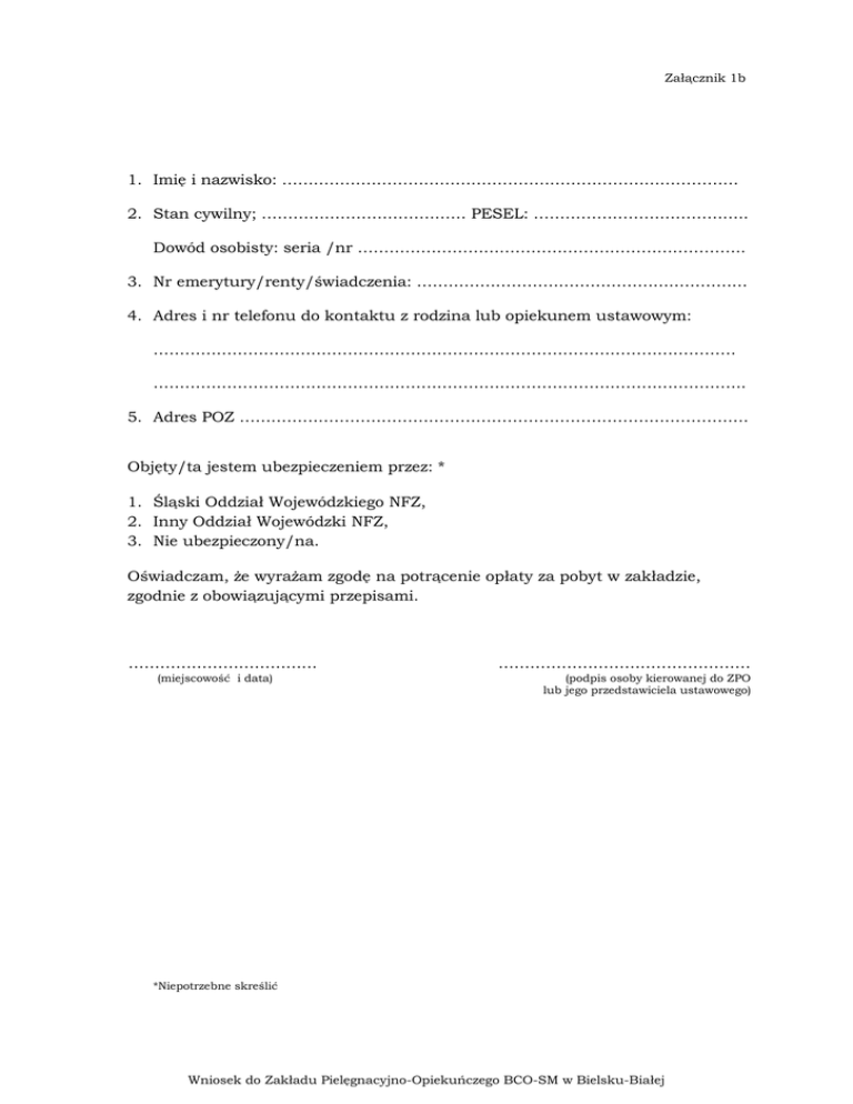Załącznik 1b 1. Imię i nazwisko: …………………………………………………………………………… 2. Stan cywilny; ………………………………… PESEL: ………………………………….. Dowód osobisty: seria /nr ……………………………………………………………….. 3. Nr emerytury/renty/świadczenia: ……………………………………………………… 4. Adres i nr telefonu do kontaktu z rodzina lub opiekunem ustawowym: ………………………………………………………………………………………………… ………………………………………………………………………………………………….. 5. Adres POZ ……………………………………………………………………………………. Objęty/ta jestem ubezpieczeniem przez: * 1. Śląski Oddział Wojewódzkiego NFZ, 2. Inny Oddział Wojewódzki NFZ, 3. Nie ubezpieczony/na. Oświadczam, że wyrażam zgodę na potrącenie opłaty za pobyt w zakładzie, zgodnie z obowiązującymi przepisami. ……………………………… (miejscowość i data) ………………………………………… (podpis osoby kierowanej do ZPO lub jego przedstawiciela ustawowego) *Niepotrzebne skreślić Wniosek do Zakładu Pielęgnacyjno-Opiekuńczego BCO-SM w Bielsku-Białej