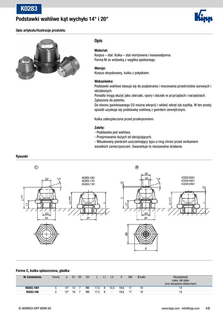 K0283 Podstawki wahliwe kąt wychyłu 14° i 20° Opis artykułu/ilustracje produktu Opis Materiał: Korpus – stal. Kulka – stal nierdzewna i kwasoodporna. Forma M ze wstawką z węglika spiekanego. Wersja: Korpus oksydowany, kulka z połyskiem. Wskazówka: Podstawki wahliwe stosuje się do podpierania i mocowania przedmiotów surowych i obrobionych. Ponadto mogą służyć jako zderzaki, opory i dociski w przyrządach i narzędziach. Zgłoszone do patentu. Do otworu gwintowanego D3 można wkręcić i wkleić wkręt lub szpilkę. W ten prosty sposób uzyskuje się podstawkę wahliwą z gwintem zewnętrznym. Kulka zabezpieczona przed przekręceniem. Zalety: - Podstawka jest wahliwa. - Przejmowanie dużych sił obciążających. - Wbudowany pierścień uszczelniający typu o-ring chroni przed wnikaniem wszelkich zanieczyszczeń. Gwarantuje to niezawodne działanie. Rysunki Forma C, kulka spłaszczona, gładka Nr Zamówienia Forma α K0283.1061 K0283.106 C C 14° 14° © HEINRICH KIPP WERK KG D1 D2 D3 L L1 L3 E SW Ø kulki 12 16 M6 M6 17,5 17,5 6 6 12,5 - 19,6 19,6 17 17 10 10 7 7 Obciążalność maks. kN (tylko przy obciążeniu statycznym) 14 14 www.kipp.com · [email protected] 1/2 K0283 Podstawki wahliwe kąt wychyłu 14° i 20° Nr Zamówienia Forma α K0283.108 K0283.1101 K0283.110 K0283.112 K0283.1161 K0283.116 K0283.120 C C C C C C C 20° 20° 20° 20° 20° 20° 20° D1 D2 22 18 22 22 26 34 34 11 11 11 11 18 18 18 D3 L L1 L3 E SW Ø kulki M8 M10 M10 M12 M16 M16 M20 26 26 26 26 40 40 40 9 9 9 9 15 15 15 20 30 - 27,7 27,7 27,7 27,7 41,6 41,6 41,6 24 24 24 24 36 36 36 16 16 16 16 25 25 25 Obciążalność maks. kN (tylko przy obciążeniu statycznym) 34 34 34 34 90 90 90 Forma M, kulka spłaszczona, w kratkę ze stopu twardego Nr Zamówienia Forma α K0283.9061 K0283.906 K0283.908 K0283.9101 K0283.910 K0283.912 K0283.9161 K0283.916 K0283.920 M M M M M M M M M 14° 14° 20° 20° 20° 20° 20° 20° 20° © HEINRICH KIPP WERK KG D1 D2 12 16 22 18 22 22 26 34 34 7 7 11 11 11 11 18 18 18 D3 D4 M6 M6 M8 M10 M10 M12 M16 M16 M20 5 5 7,5 7,5 7,5 7,5 13 13 13 L L1 L2 17,5 6 0,6 17,5 6 0,6 26 9 0,8 26 9 0,8 26 9 0,8 26 9 0,8 40 15 0,9 40 15 0,9 40 15 0,9 L3 E SW Ø kulki 12,5 20 30 - 19,6 19,6 27,7 27,7 27,7 27,7 41,6 41,6 41,6 17 17 24 24 24 24 36 36 36 10 10 16 16 16 16 25 25 25 Obciążalność maks. kN (tylko przy obciążeniu statycznym) 14 14 34 34 34 34 90 90 90 www.kipp.com · [email protected] 2/2