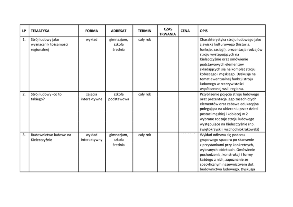 CENA OPIS cały rok CZAS TRWANIA 45 minut 100,00 zł szkoła podstawowa cały rok 45 minut 100,00 zł gimnazjum, szkoła średnia cały rok 60 minut 100,00 zł Charakterystyka stroju ludowego jako zjawiska kulturowego (historia, funkcje, zasięgi), prezentacja rodzajów stroju występujących na Kielecczyźnie oraz omówienie podstawowych elementów składających się na komplet stroju kobiecego i męskiego. Dyskusja na temat ewentualnej funkcji stroju ludowego w rzeczywistości współczesnej wsi i regionu. Przybliżenie pojęcia stroju ludowego oraz prezentacja jego zasadniczych elementów oraz zabawa edukacyjna polegająca na ubieraniu przez dzieci postaci męskiej i kobiecej w 2 wybrane rodzaje stroju ludowego występujące na Kielecczyźnie (np. świętokrzyski i wschodniokrakowski) Wykład odbywa się podczas grupowego spaceru po skansenie z przystankami przy konkretnych, wybranych obiektach. Omówienie pochodzenia, konstrukcji i formy każdego z nich, zapoznanie ze specyficznym nazewnictwem dot. budownictwa ludowego. Dyskusja LP TEMATYKA FORMA ADRESAT TERMIN 1. Strój ludowy jako wyznacznik tożsamości regionalnej wykład gimnazjum, szkoła średnia 2. Strój ludowy -co to takiego? zajęcia interaktywne 3. Budownictwo ludowe na Kielecczyźnie wykład interaktywny 4. Wyposażenie tradycyjnej chałupy chłopskiej z terenu Kielecczyzny 5. Wybrane prace domowe w tradycyjnym gospodarstwie chłopskim wykład wszystkie grupy wiekowe cały rok 45 minut 100,00 zł zajęcia interaktywne szkoła podstawowa, gimnazjum kwiecień październik 45 minut 100,00 zł na temat domniemanych przyczyn różnic i podobieństw między obiektami. Zajęcia prowadzone w zabytkowej chałupie w celu bezpośredniego zapoznania z warunkami, w jakich żyli kiedyś ludzie, prezentacja sprzętów i narzędzi jakich używali na co dzień, podkreślenie ich pomysłowości w radzeniu sobie z bytowaniem w takich warunkach oraz uwrażliwienie na estetykę oglądanego wnętrza. Zajęcia prowadzone we wnętrzu zabytkowej chałupy i na jej podwórzu. Zapoznanie ze sposobami zachowania porządku i dbaniem o higienę w tradycyjnym chłopskim gospodarstwie domowym, prezentacja narzędzi i omówienie wybranych prac domowych ; zajęcia praktyczne – uczestnicy sami wykonują te prace (np. pranie, prasowanie, maglowanie, noszenie wody) używając tradycyjnych narzędzi i sprzętów. 6. Tradycyjne garncarstwo ludowe 7. „W kuźni wiejskiej” kowalstwo ludowe na Kielecczyźnie warsztaty wszystkie grupy wiekowe kwiecień październik 90 minut 300,00 zł Pokaz interaktywny wszystkie grupy wiekowe kwiecień październik 90 minut 300,00 zł Wstępem do zajęć jest pokaz wyrobu ceramiki na kole garncarskim prowadzony przez garncarza, z omówieniem poszczególnych etapów tej techniki ; następnie uczestnicy próbują sami pod okiem fachowca wykonywać naczynia na kole ; wykonują też ręcznie inne formy z gliny (np. figurki zwierząt) ; swoje wyroby zabierają na pamiątkę Pokaz pracy kowala prowadzony w tradycyjnej kuźni w skansenie, któremu towarzyszy omówienie zarówno elementów wyposażenia kuźni i wybranych narzędzi jak również poszczególnych etapów wykonywania przedmiotu (np. podkowy) metodą kucia. Uczestnicy mogą pomagać kowalowi w prostych i bezpiecznych pracach (miechowanie, przytrzymywanie kleszczami kutego przedmiotu, itp.). Dla chętnych zwiedzanie grupowe wystawy wyrobów kowalstwa ludowego. 8. „Bijże chłopie cepem z góry...” -czyli droga od kłosa do chleba Wykład interaktywny kl. IV-VI SP, gimnazjum, liceum kwiecień październik 60 minut 200,00 zł 9. Kapliczki przydrożne na Kielecczyźnie Wykład gimnazjum, szkoła średnia cały rok 45 minut 100,00 zł 10. Dwór ziemiański – mieszkańcy i ich Wykład z elementami Gimnazjum, szkoła średnia Cały rok 60 mim 100,00 codzienność (XIX / XX w.) interaktywnymi Zapoznanie z tradycyjnymi metodami siewu, zbioru, młócenia i oczyszczania zboża oraz przerobu ziarna na mąkę i kaszę. Uczestnicy spróbują swoich sił w młóceniu capem i zobaczą jak działa stępa do młócenia koszy oraz poznają technikę mielenia ziarna na mąkę w żarnach; na koniec grupowe zwiedzanie wystawy młynarskiej w wiatraku z Grzmucina. Omówienie tradycji stawiania kapliczek i figur przydrożnych na Kielecczyźnie oraz ich form, lokalizacji w terenie a także związanych z nimi podań i wierzeń ludowych Wykład ilustrowany bogatym materiałem zdjęciowym Zajęcia maja przybliżyć uczestnikom życie codzienne mieszkańców średniozamożnego dworu szlacheckiego (zwyczaje, zajęcia, zainteresowania) a także ukazać je na tle relacji panujących między dworem a wsią na przełomie XIX i XX 11. „Wynieśliśmy Marzaneczkę ze wsi” -tradycyjne pożegnanie zimy w kulturze ludowej Zajęcia interaktywne szkoła podstawowa II poł. marca 90 minut 200,00 zł wieku; zajęcia odbywają się we wnętrzach zabytkowego dworu z Suchedniowa, które prezentowane są uczestnikom w trakcie wykładu ; na konic zajęć – krótka inscenizacja teatralna z udziałem uczestników (komiczna „Rozmowa dworska przy stole”, tekst z 1908 roku). Krótkie wprowadzenie na temat zwyczaju topienia (lub palenia) kukły zwanej Marzanną, wykonanie przez uczestników z przygotowanych materiałów Marzanny a następnie przejście z nią przez skansen nad brzeg Czarnej Nidy, gdzie zostanie ona wrzucona do rzeki. 12. Tradycyjne ozdoby wiejskich wnętrz mieszkalnych Warsztaty wszystkie grupy wiekowe cały rok 60 minut 200,00 zł 13. Siano, światy, podłaźniki ludowe ozdoby bożonarodzeniowe Warsztaty wszystkie grupy wiekowe grudzień 60 minut 200,00 zł 14. Kraszanki, pisanki, cukrowe baranki – Wielkanoc w kulturze ludowej Zajęcia szkoła 2 tygodnie 60 minut 200,00 zł interaktywne podstawowa, gimnazjum Poprzedzające Wielkanoc Nauka wyrobu bibułowych kwiatów lub wycinanek (do wyboru), stanowiących tradycyjne ozdoby wnętrza chałupy chłopskiej, wzorowanych na dawnych, oryginalnyc
