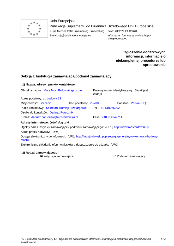 Unia Europejska Publikacja Suplementu do Dziennika Urzędowego Unii Europejskiej 2, rue Mercier, 2985 Luxembourg, Luksemburg Faks: +352 29 29 42 670 E-mail: [email protected] Informacje i formularze on-line: http:// simap.europa.eu Ogłoszenie dodatkowych informacji, informacje o niekompletnej procedurze lub sprostowanie Sekcja I: Instytucja zamawiająca/podmiot zamawiający I.1) Nazwa, adresy i punkty kontaktowe: Oficjalna nazwa: Mars Most Brdowski sp. z o.o. Krajowy numer identyfikacyjny: (jeżeli jest znany) _____ Adres pocztowy: ul. Ludowa 13 Miejscowość: Szczecin Kod pocztowy: 71-700 Punkt kontaktowy: Sekretarz Komisji Przetargowej Państwo: Polska (PL) Tel.: +48 510075202 Osoba do kontaktów: Dariusz Porucznik E-mail: [email protected] Faks: +48 914242714 Adresy internetowe: (jeżeli dotyczy) Ogólny adres instytucji zamawiającej/ podmiotu zamawiającego: (URL) http://www.mostbrdowski.pl Adres profilu nabywcy: (URL) _____ Dostęp elektroniczny do informacji: (URL) http://mostbrdowski.pl/przetargi/generalny-wykonawca-budowymostu/ Elektroniczne składanie ofert i wniosków o dopuszczenie do udziału: (URL) _____ I.2) Rodzaj zamawiającego: Instytucja zamawiająca Podmiot zamawiający PL Formularz standardowy 14 - Ogłoszenie dodatkowych informacji, informacje o niekompletnej procedurze lub sprostowanie 1/4 Sekcja II: Przedmiot zamówienia II.1.1) Nazwa nadana zamówieniu: Wykonanie robót budowlanych polegających na budowie mostu drogowego nad rzeką Odrą wraz z przebudową kolidującej infrastruktury w ramach projektu „Połączenie mostowo – drogowe w celu skomunikowania terenów inwestycyjnych Gryfia Biznes Park” Etap I. II.1.2) Krótki opis zamówienia lub zakupu: (podano w pierwotnym ogłoszeniu) Przedmiotem zamówienia są roboty budowlane polegające na budowie mostu drogowego nad rzeką Odrą w ramach Projektu pn.: „Połączenie mostowo – drogowe w celu skomunikowania terenów inwestycyjnych Gryfia Biznes Park”, w Szczecinie, wraz z uzyskaniem w imieniu Zamawiającego pozwolenia na użytkowanie. Szczegółowo opis przedmiotu zamówienia został opisany w Dziale IV SIWZ. II.1.3) Wspólny Słownik Zamówień (CPV) Główny przedmiot Dodatkowe przedmioty Słownik główny 45221111 45233120 45232460 45231400 45316110 45315300 45311000 45314300 45312310 Słownik uzupełniający (jeżeli dotyczy) PL Formularz standardowy 14 - Ogłoszenie dodatkowych informacji, informacje o niekompletnej procedurze lub sprostowanie 2/4 Sekcja IV: Procedura IV.1)Rodzaj procedury (podano w pierwotnym ogłoszeniu) Otwarta Ograniczona Ograniczona przyspieszona Negocjacyjna Negocjacyjna przyspieszona Dialog konkurencyjny Negocjacyjna z uprzednim ogłoszeniem Negocjacyjna bez uprzedniego ogłoszenia Negocjacyjna z publikacją ogłoszenia o zamówieniu Negocjacyjna bez publikacji ogłoszenia o zamówieniu Udzielenie zamówienia bez uprzedniej publikacji ogłoszenia o zamówieniu w Dzienniku Urzędowym Unii Europejskiej IV.2)Informacje administracyjne IV.2.1)Numer referencyjny: (podano w pierwotnym ogłoszeniu) MMB/1/2013 IV.2.2)Dane referencyjne ogłoszenia w przypadku ogłoszeń przesłanych drogą elektroniczną: Pierwotne ogłoszenie przesłane przez eNotices TED eSender Login: ENOTICES_MARSMOSTBRDOWSKIDP Dane referencyjne ogłoszenia: 2013-111579 rok i numer dokumentu IV.2.3)Ogłoszenie, którego dotyczy niniejsza publikacja: Numer ogłoszenia w Dz.U.: 2013/S 159-277056 z dnia: 17/08/2013 (dd/mm/rrrr) IV.2.4)Data wysłania pierwotnego ogłoszenia: 14/08/2013 (dd/mm/rrrr) PL Formularz standardowy 14 - Ogłoszenie dodatkowych informacji, informacje o niekompletnej procedurze lub sprostowanie 3/4 Sekcja VI: Informacje uzupełniające VI.1) Ogłoszenie dotyczy: Procedury niepełnej Sprostowania Informacji dodatkowych VI.2) Informacje na temat niepełnej procedury udzielenia zamówienia: Postępowanie o udzielenie zamówienia zostało przerwane Postępowanie o udzielenie zamówienia uznano za nieskuteczne Zamówienia nie udzielono Zamówienie może być przedmiotem ponownej publikacji VI.3) Informacje do poprawienia lub dodania : VI.3.1) Zmiana oryginalnej informacji podanej przez instytucję zamawiającą Publikacja w witrynie TED niezgodna z oryginalną informacją, przekazaną przez instytucję zamawiającą Oba przypadki VI.3.2) W ogłoszeniu pierwotnym W odpowiedniej dokumentacji przetargowej (więcej informacji w odpowiedniej dokumentacji przetargowej) W obu przypadkach (więcej informacji w odpowiedniej dokumentacji przetargowej) VI.3.3) Tekst, który należy poprawić w pierwotnym ogłoszeniu Miejsce, w którym znajduje się Zamiast: zmieniany tekst: Powinno być: VI.3.4) Daty, które należy poprawić w pierwotnym ogłoszeniu Miejsce, w którym znajdują się Zamiast: zmieniane daty: 25/10/2013 Godzina: 09:59 IV.3.3) (dd/mm/rrrr) Powinno być: 25/11/2013 Godzina: 09:59 (dd/mm/rrrr) Miejsce, w którym znajdują się zmieniane daty: IV.3.4) Zamiast: 25/10/2013 Godzina: 10:00 (dd/mm/rrrr) Powinno być: 25/11/2013 Godzina: 10:00 (dd/mm/rrrr) Miejsce, w którym znajdują się zmieniane daty: IV.3.8) Zamiast: 25/10/2013 Godzina: 11:00 (dd/mm/rrrr) Powinno być: 25/11/2013 Godzina: 11:00 (dd/mm/rrrr) VI.3.5) Adresy i punkty kontaktowe, które należy poprawić VI.3.6) Tekst, który należy dodać do pierwotnego ogłoszenia Miejsce, w którym należy dodać tekst: Tekst do dodania: VI.4) Inne dodatkowe informacje: _____ VI.5) Data wysłania niniejszego ogłoszenia: 18/10/2013 (dd/mm/rrrr) - ID:2013-142153 PL Formularz standardowy 14 - Ogłoszenie dodatkowych informacji, informacje o niekompletnej procedurze lub sprostowanie 4/4