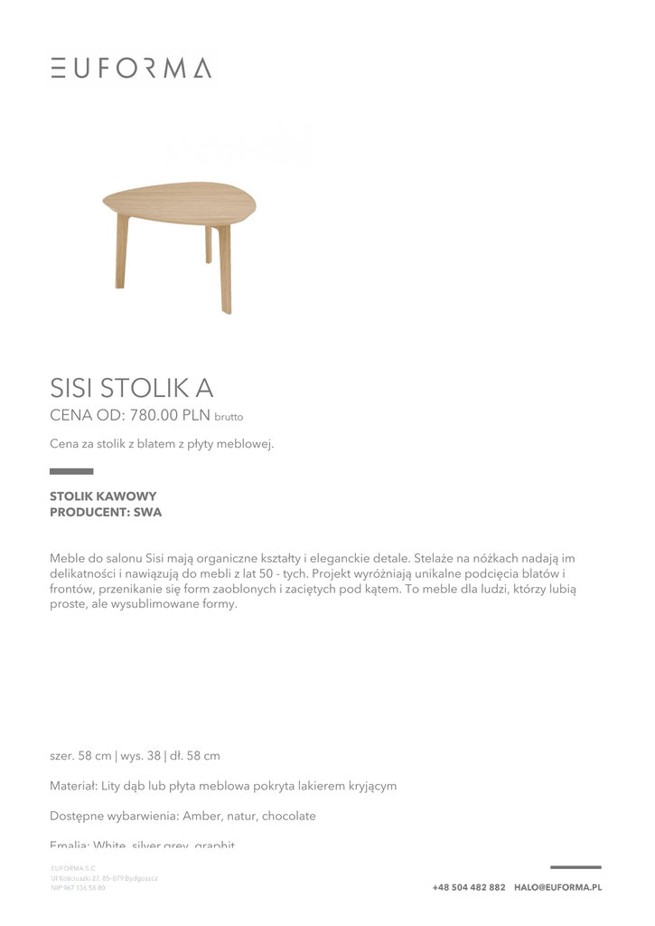 SISI STOLIK A CENA OD: 780.00 PLN brutto Cena za stolik z blatem z płyty meblowej. STOLIK KAWOWY PRODUCENT: SWA Meble do salonu Sisi mają organiczne kształty i eleganckie detale. Stelaże na nóżkach nadają im delikatności i nawiązują do mebli z lat 50 - tych. Projekt wyróżniają unikalne podcięcia blatów i frontów, przenikanie się form zaoblonych i zaciętych pod kątem. To meble dla ludzi, którzy lubią proste, ale wysublimowane formy. szer. 58 cm | wys. 38 | dł. 58 cm Materiał: Lity dąb lub płyta meblowa pokryta lakierem kryjącym Dostępne wybarwienia: Amber, natur, chocolate Emalia: White, silver grey, graphit Powered by TCPDF (www.tcpdf.org)