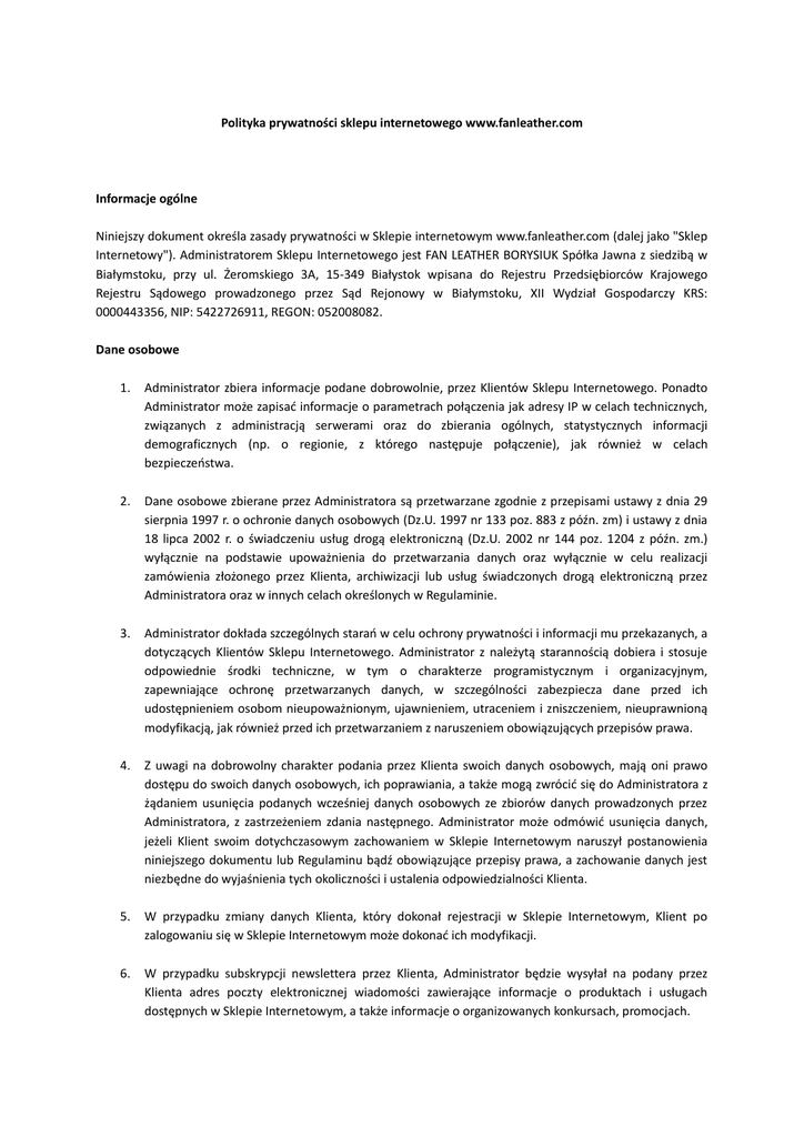 Polityka prywatności sklepu internetowego www.fanleather.com Informacje ogólne Niniejszy dokument określa zasady prywatności w Sklepie internetowym www.fanleather.com (dalej jako "Sklep Internetowy"). Administratorem Sklepu Internetowego jest FAN LEATHER BORYSIUK Spółka Jawna z siedzibą w Białymstoku, przy ul. Żeromskiego 3A, 15-349 Białystok wpisana do Rejestru Przedsiębiorców Krajowego Rejestru Sądowego prowadzonego przez Sąd Rejonowy w Białymstoku, XII Wydział Gospodarczy KRS: 0000443356, NIP: 5422726911, REGON: 052008082. Dane osobowe 1. Administrator zbiera informacje podane dobrowolnie, przez Klientów Sklepu Internetowego. Ponadto Administrator może zapisać informacje o parametrach połączenia jak adresy IP w celach technicznych, związanych z administracją serwerami oraz do zbierania ogólnych, statystycznych informacji demograficznych (np. o regionie, z którego następuje połączenie), jak również w celach bezpieczeństwa. 2. Dane osobowe zbierane przez Administratora są przetwarzane zgodnie z przepisami ustawy z dnia 29 sierpnia 1997 r. o ochronie danych osobowych (Dz.U. 1997 nr 133 poz. 883 z późn. zm) i ustawy z dnia 18 lipca 2002 r. o świadczeniu usług drogą elektroniczną (Dz.U. 2002 nr 144 poz. 1204 z późn. zm.) wyłącznie na podstawie upoważnienia do przetwarzania danych oraz wyłącznie w celu realizacji zamówienia złożonego przez Klienta, archiwizacji lub usług świadczonych drogą elektroniczną przez Administratora oraz w innych celach określonych w Regulaminie. 3. Administrator dokłada szczególnych starań w celu ochrony prywatności i informacji mu przekazanych, a dotyczących Klientów Sklepu Internetowego. Administrator z należytą starannością dobiera i stosuje odpowiednie środki techniczne, w tym o charakterze programistycznym i organizacyjnym, zapewniające ochronę przetwarzanych danych, w szczególności zabezpiecza dane przed ich udostępnieniem osobom nieupoważnionym, ujawnieniem, utraceniem i zniszczeniem, nieuprawnioną modyfikacją, jak również przed ich przetwarzaniem z naruszeniem obowiązujących przepisów prawa. 4. Z uwagi na dobrowolny charakter podania przez Klienta swoich danych osobowych, mają oni prawo dostępu do swoich danych osobowych, ich poprawiania, a także mogą zwrócić się do Administratora z żądaniem usunięcia podanych wcześniej danych osobowych ze zbiorów danych prowadzonych przez Administratora, z zastrzeżeniem zdania następnego. Administrator może odmówić usunięcia danych, jeżeli Klient swoim dotychczasowym zachowaniem w Sklepie Internetowym naruszył postanowienia niniejszego dokumentu lub Regulaminu bądź obowiązujące przepisy prawa, a zachowanie danych jest niezbędne do wyjaśnienia tych okoliczności i ustalenia odpowiedzialności Klienta. 5. W przypadku zmiany danych Klienta, który dokonał rejestracji w Sklepie Internetowym, Klient po zalogowaniu się w Sklepie Internetowym może dokonać ich modyfikacji. 6. W przypadku subskrypcji newslettera przez Klienta, Administrator będzie wysyłał na podany przez Klienta adres poczty elektronicznej wiadomości zawierające informacje o produktach i usługach dostępnych w Sklepie Internetowym, a także informacje o organizowanych konkursach, promocjach. 7. Administrator może powierzyć przetwarzanie danych osobowych Klientów podmiotom trzecim realizującym niektóre usługi, a w szczególności realizację dostawy zamówienia, realizację płatności, badanie poziomu satysfakcji Klienta w Sklepie Internetowym, tj.: a. Operatorowi DPD sp. z o.o. z siedzibą w Warszawie (ul. Mineralna 15, 02-274 Warszawa) jako administratorowi danych wpisanemu do Rejestru Przedsiębiorców prowadzonego przez Sąd Rejonowy dla m.st. Warszawy, Wydział XIII Gospodarczy Krajowego Rejestru Sądowego, pod numerem 0000028368, o kapitale zakładowym 228.604.000,00 złotych, posiadającym NIP:526-02-04-110, będącym pomiotem świadczącym usługi pocztowe w rozumieniu ustawy z dnia 29 grudnia 2012 roku prawo pocztowe (Dz. U. 2012.1529). Przekazanie dotyczy danych niezbędnych do zrealizowania zamówienia, a w szczególności: imię, nazwisko, adres. b. Operatorowi systemu płatności on-line firmie Dotpay S.A., z siedzibą w Krakowie, 30-552 Kraków, przy ulicy Wielickiej 72 jako administratorowi danych, wpisanemu do rejestru przedsiębiorców prowadzonego przez Sąd Rejonowy Kraków-Śródmieście w Krakowie, Wydział XI Gospodarczy Krajowego Rejestru Sądowego pod numerem 0000296790, o kapitale zakładowym 4.000.000,00 PLN, opłacony w całości gotówką, posiadająca numer NIP 634-2661-860, NIP EU PL6342661860, będącym podmiotem świadczącym usługi płatnicze w rozumieniu ustawy z dnia 19 sierpnia 2011 roku o usługach płatniczych (Dz. U. 2011.199.1175 ze zm.). Przekazanie dotyczy danych niezbędnych do zrealizowania płatności przez Dotpay, a w szczególności: imię i nazwisko, adres poczty elektronicznej, numer telefonu. c. W zakresie niezbędnym dla realizacji umowy sprzedaży firmie Santander Consumer Bank S.A. z siedzibą we Wrocławiu, ul. Strzegomska 42c, zarejestrowana w Krajowym Rejestrze Sądowym przez Sąd Rejonowy dla Wrocławia-Fabrycznej we Wrocławiu, VI Wydział Gospodarczy Krajowego Rejestru Sądowego pod numerem KRS 0000040562, o kapitale zakładowym wpłaconym w całości w wysokości 520.000.000,00 zł, REGON: 012736938, NIP: 527-20-46-102, jeżeli Klient dokonał wyboru płatności poprzez system płatności e-Raty Santander Consumer Finanse.