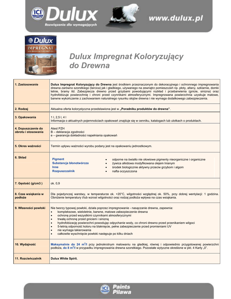 Dulux Impregnat Koloryzujący do Drewna 1. Zastosowanie Dulux Impregnat Koloryzujący do Drewna jest środkiem przeznaczonym do dekoracyjnego i ochronnego impregnowania drewna zarówno szorstkiego (tarcica) jak i gładkiego, używanego na zewnątrz pomieszczeń np. płoty, altany, szklarnie, domki letnie, bramy itd. Zabezpiecza drewno przed grzybami powodującymi rozkład i przebarwienia (gnicie, sinizna) oraz hydrofobizuje powierzchnię i chroni przed czynnikami atmosferycznymi. Impregnowana powierzchnia uzyskuje matowe, barwne wykończenie z zachowaniem naturalnego rysunku słojów drewna i nie wymaga dodatkowego zabezpieczenia. 2. Rodzaj Aktualna oferta kolorystyczna przedstawiona jest w „Poradniku produktów do drewna”. 3. Opakowania 1 l, 2,5 l, 4 l Informacja o aktualnych pojemnościach opakowań znajduje się w cenniku, katalogach lub ulotkach o produktach. 4. Dopuszczenie do obrotu i stosowania Atest PZH B – deklaracja zgodności e – gwarancja dokładności napełniania opakowań 5. Okres ważności Termin upływu ważności wyrobu podany jest na opakowaniu jednostkowym. 6. Skład Pigment Substancja błonotwórcza Inne Rozpuszczalnik • • • • odporne na światło nie ołowiowe pigmenty nieorganiczne i organiczne żywica alkidowa modyfikowana olejem lnianym środek biologicznie aktywny przeciw grzybom i algom nafta oczyszczona 7. Gęstość (g/cm3 ) ok. 0,9 8. Czas wsiąkania w podłoże Dla pojedynczej warstwy, w temperaturze ok. +20°C, wilgotności względnej ok. 50%, przy dobrej wentylacji: 1 godzina. Obniżenie temperatury i/lub wzrost wilgotności oraz rodzaj podłoża wpływa na czas wsiąkania. 9. Własności powłoki Nie tworzy typowej powłoki, działa poprzez impregnowanie - nasączanie drewna, zapewnia: • kompleksowe, wieloletnie, barwne, matowe zabezpieczenie drewna • ochronę przed wszystkimi czynnikami atmosferycznymi • trwałą ochronę przed gniciem i sinizną • hydrofobizację powierzchni powodując odpychanie wody, co chroni drewno przed przenikaniem wilgoci • 5-letnią odporność koloru na blaknięcie, pełne zabezpieczenie przed promieniami UV • nie wymaga lakierowania • całkowite wyschnięcie powłoki następuje po kilku dniach 10. Wydajność Maksymalnie do 24 m /l przy jednokrotnym malowaniu na gładkiej, równej i odpowiednio przygotowanej powierzchni 2 podłoża, do 8 m /l w przypadku impregnowania drewna szorstkiego. Pozostałe wytyczne określone w pkt. 4 Karty „0”. 11. Rozcieńczalnik Dulux White Spirit. 2 12. Stosowanie 12.1. Przygotowanie podłoża 12.2. Przygotowanie wyrobu 12.3. Malowanie Podłoża do malowania muszą spełniać wymagania określone w pkt. 1 Karty „0”. Standardowy sposób przygotowania podłoża opisano w pkt. 2 Karty „0”. Ponadto: Szlifowanie drewna szorstkiego (tarcicy) • nie jest wymagane Usuwanie nalotów organicznych • na drewno porażone stosować środek Dulux Impregnat do Leczenia Drewna (owady i pleśnie) lub Dulux OwadKiler (tylko owady drążące drewno) Usunięcie powłok • powłoki farb, lakierów i bejcy usunąć całkowicie • • • • dokładnie wymieszać przed użyciem! do mieszania najlepiej stosować drewnianą łopatkę lub specjalne mieszadło nie dodawać obcych składników nie rozcieńczać przed malowaniem Warunki malowania Temperatura otoczenia i malowanej powierzchni nie powinna być niższa niż +5°C. Pozostałe wytyczne określone w pkt. 5 Karty „0”. Zalecane metody malowania Pędzel, natrysk hydrodynamiczny (bezpowietrzny). Dobór narzędzi Pędzle - według informacji w pkt. 3 Karty „0”. Natrysk hydrodynamiczny - wysokociśnieniowy. Parametry malowania 1. Impregnowanie - wcześniej niemalowane lub odsłonięte drewno (np. po usunięciu starej, słabo przyczepnej powłoki), nietrwałe drewno, powierzchnie cięte oraz miejsca, w których były wiercone otwory, jeśli istnieje zagrożenie porażeniem przez grzyby, pleśnie czy owady zabezpieczyć produktem Dulux Impregnat do Konstrukcji Drewnianych - bezbarwny 2. Malowanie właściwe (tzn. nawierzchniowe) wykonuje się na podłożach: • wcześniej niemalowanych • odsłoniętych np. po usunięciu starej, słabo przyczepnej powłoki • wcześniej impregnowanych Jak? Malowanie pędzlem, natryskiem • nakładać 2 lub 3 warstwy Impregnatu, kolejną warstwę Impregnatu nakładać po wsiąknięciu poprzedniej, ale przed całkowitym jej wyschnięciem • rozprowadzać dokładnie do postaci równomiernej i jednolitej warstwy 3. Następne wymalowania - nie dotyczy Rozszerzone wytyczne z zakresu malowania umieszczone w Informacjach ogólnych (Karta „0”). 12.4. Czyszczenie narzędzi malarskich Po zakończeniu malowania zaleca się usunąć z narzędzi jak największą ilość wyrobu, a następnie umyć rozcieńczalnikiem Dulux White Spirit. 13. Przechowywanie i transport Zgodnie z normą PN-89/C-81400, w oryginalnych i szczelnie zamkniętych opakowaniach, najkorzystniej w temperaturze nieprzekraczającej +30°C, w pomieszczeniach zamkniętych, z dala od ognia i źródeł ciepła. Uwaga: Produkt łatwopalny. 14. Środki ostrożności Pozostałe informacje dostępne w Karcie charakterystyki produktu. 15. Informacje uzupełniające Informacje ogólne zawarte w Karcie „0” stanowią integralną część niniejszej Karty Technicznej. Zastrzegamy sobie prawo zmiany treści Karty Technicznej bez uprzedniego zawiadomienia. Wszelkie uwagi i pytania prosimy kierować: • pod numer bezpłatnej infolinii: 0800 120 277 (poniedziałek - piątek) • pod adres e-mail: [email protected] • pod adres: ICI Polska Sp. z o.o. Oddział w Pilawie, 08-440 Pilawa, ul. Przemysłowa 3 Data wydania: wrzesień 2004r.