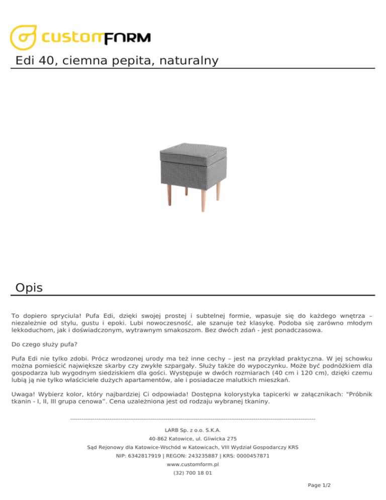 Edi 40, ciemna pepita, naturalny Opis To dopiero spryciula! Pufa Edi, dzięki swojej prostej i subtelnej formie, wpasuje się do każdego wnętrza – niezależnie od stylu, gustu i epoki. Lubi nowoczesność, ale szanuje też klasykę. Podoba się zarówno młodym lekkoduchom, jak i doświadczonym, wytrawnym smakoszom. Bez dwóch zdań - jest ponadczasowa. Do czego służy pufa? Pufa Edi nie tylko zdobi. Prócz wrodzonej urody ma też inne cechy – jest na przykład praktyczna. W jej schowku można pomieścić największe skarby czy zwykłe szpargały. Służy także do wypoczynku. Może być podnóżkiem dla gospodarza lub wygodnym siedziskiem dla gości. Występuje w dwóch rozmiarach (40 cm i 120 cm), dzięki czemu lubią ją nie tylko właściciele dużych apartamentów, ale i posiadacze malutkich mieszkań. Uwaga! Wybierz kolor, który najbardziej Ci odpowiada! Dostępna kolorystyka tapicerki w załącznikach: "Próbnik tkanin - I, II, III grupa cenowa”. Cena uzależniona jest od rodzaju wybranej tkaniny. ----------------------------------------------------------------------------------------------------------------------------------LARB Sp. z o.o. S.K.A. 40-862 Katowice, ul. Gliwicka 275 Sąd Rejonowy dla Katowice-Wschód w Katowicach, VIII Wydział Gospodarczy KRS NIP: 6342817919 | REGON: 243235887 | KRS: 0000457871 www.customform.pl (32) 700 18 01 Page 1/2 Drewniane elementy wykończenia produktu możemy wykonać w kolorach: naturalny - jasne drewno, orzech ciemne drewno, biały oraz czarny. Specyfikacja Wysokość 50 cm Szerokość 40 cm Głębokość 40 cm Wykończenie tkanina: 33% PES i 67% Olefin Siedzisko tkanina Podstawa drewno Dodatkowe zdjęcia ----------------------------------------------------------------------------------------------------------------------------------LARB Sp. z o.o. S.K.A. 40-862 Katowice, ul. Gliwicka 275 Sąd Rejonowy dla Katowice-Wschód w Katowicach, VIII Wydział Gospodarczy KRS NIP: 6342817919 | REGON: 243235887 | KRS: 0000457871 www.customform.pl (32) 700 18 01 Page 2/2 Powered by TCPDF (www.tcpdf.org)