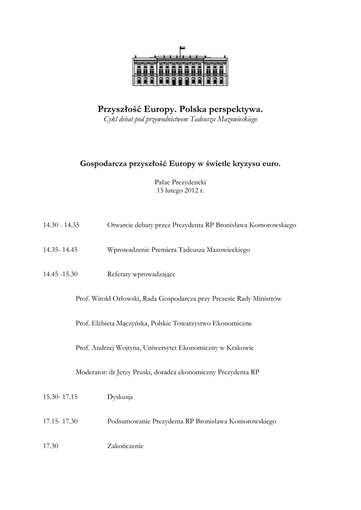 Przyszłość Europy. Polska perspektywa. Cykl debat pod przewodnictwem Tadeusza Mazowieckiego Gospodarcza przyszłość Europy w świetle kryzysu euro. Pałac Prezydencki 15 lutego 2012 r. 14.30 - 14.35 Otwarcie debaty przez Prezydenta RP Bronisława Komorowskiego 14.35- 14.45 Wprowadzenie Premiera Tadeusza Mazowieckiego 14.45 -15.30 Referaty wprowadzające Prof. Witold Orłowski, Rada Gospodarcza przy Prezesie Rady Ministrów Prof. Elżbieta Mączyńska, Polskie Towarzystwo Ekonomiczne Prof. Andrzej Wojtyna, Uniwersytet Ekonomiczny w Krakowie Moderator: dr Jerzy Pruski, doradca ekonomiczny Prezydenta RP 15.30- 17.15 Dyskusja 17.15- 17.30 Podsumowanie Prezydenta RP Bronisława Komorowskiego 17.30 Zakończenie