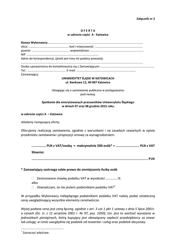 Załącznik nr 2 OFERTA w zakresie części A - Katowice Nazwa Wykonawcy:.................................................................................................................... ulica: .............................................…. kod i miejscowość: .......................................................... powiat: .............................................. województwo: ................................................................. NIP ........................................................................................ Adres do korespondencji, (jeżeli jest inny niż podany powyżej): ..................................................................................................................................................... Osoba upoważniona do kontaktowania się z Zamawiającym: ................................................................. Tel.: ............................................... E-mail: …………………………………………………………….……… Zamawiający: UNIWERSYTET ŚLĄSKI W KATOWICACH ul. Bankowa 12, 40-007 Katowice Ubiegając się o zamówienie publiczne w postępowaniu pod nazwą: Spotkanie dla emerytowanych pracowników Uniwersytetu Śląskiego w dniach 07 oraz 08 grudnia 2015 roku. w zakresie części A – Katowice składamy następującą ofertę: Oferujemy realizację zamówienia, zgodnie z warunkami i na zasadach zawartych w opisie przedmiotu zamówienia i propozycji umowy za wynagrodzeniem: ………..…… PLN z VAT/osobę × maksymalnie 500 osób* = ………………….…… PLN z VAT Słownie: ........................................................................................................................... PLN * Zamawiający zastrzega sobie prawo do zmniejszenia liczby osób Zastosowano stawkę podatku VAT w wysokości ……………% albo Oświadczam, że nie jestem podatnikiem podatku VAT1 W przypadku Wykonawcy niebędącego podatnikiem podatku VAT należy podać ostateczną cenę uwzględniającą wszystkie elementy cenotwórcze. Wyżej podana cena jest ceną łączną, zgodnie z art. 3 ust 1 pkt 1 ustawy z dnia 5 lipca 2001r. o cenach (Dz. U. z 11 września 2001 r. Nr 97, poz. 1050), tzn. jest to wartość wyrażona w jednostkach pieniężnych, którą kupujący jest obowiązany zapłacić przedsiębiorcy za towar lub usługę; w cenie uwzględnia się podatek od towarów i usług oraz podatek akcyzowy. 1 Zaznaczyć właściwe. 1. Rodzaj dokumentu, na podstawie którego zostanie zrealizowana płatność: rachunek/faktura (niepotrzebne skreślić). 2. Oświadczam, iż cena podana w ofercie jest sumą kwot wszystkich elementów składających się na przedmiot zamówienia, a także wszelkie elementy ryzyka związane z realizacją przedmiotowego zamówienia. Cena obejmuje realizację usługi gastronomicznej jak również wszelkie podatki i inne należności płatne przez Wykonawcę oraz koszt oprawy muzycznej spotkania. 3. Zobowiązuję się do realizacji przedmiotu zamówienia w terminach określonych w opisie przedmiotu zamówienia. 4. Akceptuję warunki płatności podane w ogłoszeniu. 5. Oświadczam, iż zapoznałem się z opisem przedmiotu zamówienia, w pełni akceptuję jego treść, nie wnoszę do niego zastrzeżeń oraz zdobyłem konieczne informacje do przygotowania oferty i zobowiązuję się spełnić wszystkie wymagania Zamawiającego wymienione w opisie. 6. Oświadczam, iż: 1) posiadam uprawnienia do wykonywania określonej działalności lub czynności, jeżeli przepisy prawa nakładają obowiązek ich posiadania, 2) posiadam niezbędną wiedzę i doświadczenie, 3) dysponuję odpowiednim potencjałem technicznym oraz osobami zdolnymi do wykonania zamówienia, 4) jestem w sytuacji ekonomicznej i finansowej pozwalającej na wykonanie zamówienia. 7. Spotkania odbędą się w Katowicach w lokalu: nazwa:……………………………………………………………………………………………………………………………. adres:……………………………………………………………………………………………………………………………… . Lokal spełnia wymogi Zamawiającego. ..............................................……………………… data i czytelny podpis lub podpis na pieczęci imiennej osoby upoważnionej do składania oświadczeń w imieniu Wykonawcy