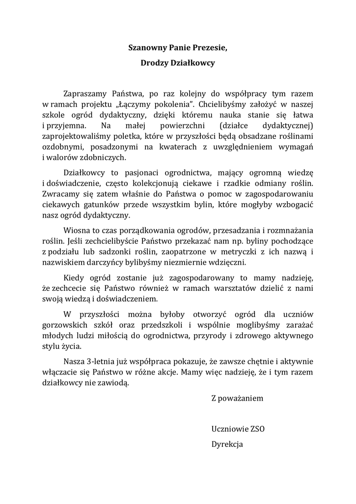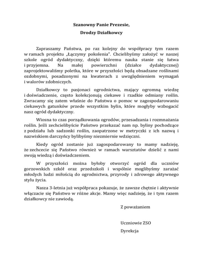 Szanowny Panie Prezesie, Drodzy Działkowcy Zapraszamy Państwa, po raz kolejny do współpracy tym razem w ramach projektu „Łączymy pokolenia”. Chcielibyśmy założyć w naszej szkole ogród dydaktyczny, dzięki któremu nauka stanie się łatwa i przyjemna. Na małej powierzchni (działce dydaktycznej) zaprojektowaliśmy poletka, które w przyszłości będą obsadzane roślinami ozdobnymi, posadzonymi na kwaterach z uwzględnieniem wymagań i walorów zdobniczych. Działkowcy to pasjonaci ogrodnictwa, mający ogromną wiedzę i doświadczenie, często kolekcjonują ciekawe i rzadkie odmiany roślin. Zwracamy się zatem właśnie do Państwa o pomoc w zagospodarowaniu ciekawych gatunków przede wszystkim bylin, które mogłyby wzbogacić nasz ogród dydaktyczny. Wiosna to czas porządkowania ogrodów, przesadzania i rozmnażania roślin. Jeśli zechcielibyście Państwo przekazać nam np. byliny pochodzące z podziału lub sadzonki roślin, zaopatrzone w metryczki z ich nazwą i nazwiskiem darczyńcy bylibyśmy niezmiernie wdzięczni. Kiedy ogród zostanie już zagospodarowany to mamy nadzieję, że zechcecie się Państwo również w ramach warsztatów dzielić z nami swoją wiedzą i doświadczeniem. W przyszłości można byłoby otworzyć ogród dla uczniów gorzowskich szkół oraz przedszkoli i wspólnie moglibyśmy zarażać młodych ludzi miłością do ogrodnictwa, przyrody i zdrowego aktywnego stylu życia. Nasza 3-letnia już współpraca pokazuje, że zawsze chętnie i aktywnie włączacie się Państwo w różne akcje. Mamy więc nadzieję, że i tym razem działkowcy nie zawiodą. Z poważaniem Uczniowie ZSO Dyrekcja