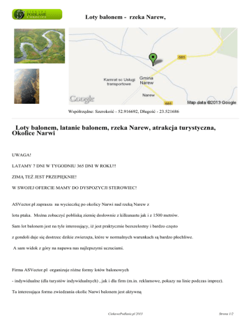 Loty balonem - rzeka Narew, Współrzędne: Szerokość - 52.916692, Długość - 23.521686 Loty balonem, latanie balonem, rzeka Narew, atrakcja turystyczna, Okolice Narwi UWAGA! LATAMY 7 DNI W TYGODNIU 365 DNI W ROKU!! ZIMĄ TEŻ JEST PRZEPIĘKNIE! W SWOJEJ OFERCIE MAMY DO DYSPOZYCJI STEROWIEC! ASVector.pl zaprasza na wycieczkę po okolicy Narwi nad rzeką Narew z lotu ptaka. Można zobaczyć pobliską ziemię dosłownie z kilkunastu jak i z 1500 metrów. Sam lot balonem jest na tyle interesujący, iż jest praktycznie bezszelestny i bardzo często z gondoli daje się dostrzec dzikie zwierzęta, które w normalnych warunkach są bardzo płochliwe. A sam widok z góry na napawa nas najlepszymi uczuciami. Firma ASVector.pl organizuje różne formy lotów balonowych - indywidualne (dla turystów indywidualnych) , jak i dla firm (m.in. reklamowe, pokazy na linie podczas imprez). Ta interesująca forma zwiedzania okolic Narwi balonem jest aktywną CiekawePodlasie.pl 2013 Strona 1/2 Loty balonem - rzeka Narew, formą spędzania urlopu, wakacji oraz eventów i szkoleń, po której na długo w pamięci pozostaną wspaniałe wspomnienia. W sprawie rezerwacji terminu i wyceny prosimy o kontakt: 509 077 549 [email protected] www.asvector.pl CiekawePodlasie.pl 2013 Strona 2/2