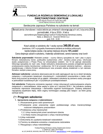 FUNDACJA ROZWOJU DEMOKRACJI LOKALNEJ ŚWIĘTOKRZYSKIE CENTRUM Laureat Nagrody Premiera Pro Publico Bono 2000 Laureat Nagrody Honorowe Skrzydła 2003 Serdecznie zaprasza Państwa na szkolenie na temat: Świadczenia chorobowe i rodzicielskie po zmianach obowiązujących od 2 stycznia 2016 poniedziałek, 4 lipca 2016 r. Kielce sala konferencyjna Świętokrzyskiego Centrum Fundacji Rozwoju Demokracji Lokalnej, Kielce, ul. Żelazna 22 – Budynek HOSSA (I p.) godz. 9.30 – 14.30 Koszt udziału w szkoleniu dla 1 osoby wynosi 349,00 zł netto (zwolnione z VAT w przypadku finansowania szkolenia ze środków publicznych) każda kolejna osoba z tej samej instytucji otrzyma 10% zniżki! Cena obejmuje udział w szkoleniu, materiały szkoleniowe, serwis kawowy oraz lunch Szkolenie poprowadzi: Wieloletni praktyk – czynny Główny specjalista ds. kadr i płac w pięciu firmach, doświadczony trener, publicystka wydawnictwa „Infor”, doradca prawa pracy. Ukończyła studia podyplomowe z Prawa Pracy na Uniwersytecie Łódzkim. Od 13 lat zajmuje stanowisko Głównego specjalisty ds. kadr i płac. Dzięki zdobytemu doświadczeniu posiada umiejętność łączenia przekazywania wiedzy teoretycznej i praktycznej. Od 5 lat prowadzi szkolenia kadrowo – płacowe, współpracując z kilkoma firmami szkoleniowymi oraz prowadzi własną działalność w tym zakresie. Doradca i audytor prawa pracy. Adresaci szkolenia: szkolenie skierowane jest do osób zajmujących się na co dzień tematyką związaną z rozliczaniem świadczeń chorobowych i rodzicielskich pracowników a także osób, które chcą poznać tą tematykę lub ją zgłębić. Adresatami szkolenia są zarówno osoby pracujące w jednostkach budżetowych jak i w prywatnych przedsiębiorstwach. Cel szkolenia: Praktyczne omówienie regulacji i zmian dotyczących wykorzystywania urlopów związanych z rodzicielstwem, które wejdą w życie od 2 stycznia 2016 r. Na szkoleniu zostaną omówione najnowsze interpretacje i stanowiska organów kontrolujących. Zostaną wskazane najczęściej popełniane błędy, które organy kontrolujące uważają jako rażące i za które grożą sankcje karne. 1 Program szkolenia: 1. Uprawnienia związane z rodzicielstwem 1.1.Rozszerzenie grona osób uprawnionych 1.2.Przekazanie przez pracownicę części podstawowego urlopu macierzyńskiego rodzicowi niebędącemu pracownikiem 1.3.Podstawowy urlop macierzyński 1.3.1.Urlop macierzyński przed narodzinami dziecka 1.3.2.Kiedy można zrezygnować z urlopu macierzyńskiego 1.4.Urlop rodzicielski 1.5.Dokumenty do uzyskania świadczeń rodzicielskich 1.6.Terminy na składanie wniosków o świadczenia rodzicielskie 1.7.Rezygnacja z urlopu rodzicielskiego Fundacja Rozwoju Demokracji Lokalnej, Świętokrzyskie Centrum ul. Żelazna 22, I piętro, 25-014 Kielce tel. (41) 344 66 30, 343-00-38, 344-41-60 / fax (41) 243 62 63 www.frdl.kielce.pl, e-mail: [email protected] 1.8.Łączenie urlopu fakultatywnego z wykonywaniem pracy na część etatu 1.9.Terminy na wykorzystanie fakultatywnych urlopów 1.10.Wydłużenie terminu wnioskowania o urlopy fakultatywne 1.11.Urlop ojcowski – termin wykorzystania urlopu ojcowskiego, sposób wykorzystania urlopu ojcowskiego 1.12.Urlop macierzyński a zgon matki 1.13.Urlop macierzyński a zgon dziecka 1.14.Urlop macierzyński a poronienie 1.15.Kto ma prawo do zasiłku macierzyńskiego 1.16.Urodzenie dziecka na urlopie wychowawczym 1.17.Urlop wychowawczy 1.18.Urlop wypoczynkowy po urlopach rodzicielskich 1.19.Przysposobienie dziecka a świadczenia związane z rodzicielstwem 1.20.Zwolnienie od pracy w związku z wychowywaniem dziecka do 14 lat 2. Świadczenia zawiązane z rodzicielstwem 2.1.Wysokość zasiłku macierzyńskiego 2.2.Wyrównanie zasiłku macierzyńskiego w przypadku rezygnacji z urlopu rodzicielskiego 2.3.Ustalenie podstawy do zasiłku macierzyńskiego 3. Świadczenia pieniężne w razie choroby i macierzyństwa z ubezpieczenia chorobowego i wypadkowego 3.1.Wynagrodzenie za czas choroby finansowane przez pracodawcę 3.2.Rozliczanie świadczeń chorobowych na przełomie roku 3.3.Świadczenia chorobowe z kilku tytułów do ubezpieczeń 3.4.Okres wyczekiwania na prawo do zasiłku chorobowego przy ubezpieczeniu obowiązkowym i dobrowolnym 3.5.Ustalanie okresu zasiłkowego 3.6.Metodyka obliczania świadczeń chorobowych 3.7.Składniki wynagrodzenia uwzględniane i nieuwzględniane w podstawie zasiłku chorobowego 3.8.Prywatne wyjścia z pracy a ustalenie podstawy zasiłku chorobowego 3.9.Sposób uzupełniania wynagrodzenia w podstawie zasiłku chorobowego 3.10.Uzupełnienie wynagrodzenia za miesiąc, w którym nastąpiło przekroczenie limitu podstawy wymiaru składek na ubezpieczenie emerytalne i rentowe 3.11.Składniki okresowe w podstawie zasiłku chorobowego 3.12.Składniki roczne, kwartalne w podstawie zasiłku chorobowego 3.13.Wysokość świadczeń chorobowych 3.14.Zasiłek opiekuńczy, dodatkowy zasiłek opiekuńczy 3.15.Wyliczanie wynagrodzenia za przepracowaną część miesiąca spowodowaną absencją chorobową 3.16.Ustalenie wynagrodzenia za pracę oraz świadczenia chorobowego za ten sam dzień 3.17.Najniższa podstawa świadczeń chorobowych 3.18.Nowe zasady wystawiania zwolnień lekarskich, tzw. e – zwolnienia, obowiązki płatnika składek do utworzenia profilu informacyjnego. 3.19.Kody literowe na zwolnieniach lekarskich 3.20.Ustalanie nowej podstawy zasiłku chorobowego 3.21.Świadczenie rehabilitacyjne 3.22.Świadczenia chorobowe z umów cywilnoprawnych Fundacja Rozwoju Demokracji Lokalnej, Świętokrzyskie Centrum ul. Żelazna 22, I piętro, 25-014 Kielce tel. (41) 344 66 30, 343-00-38, 344-41-60 / fax (41) 243 62 63 www.frdl.kielce.pl, e-mail: [email protected] Każdy uczestnik szkolenia otrzyma ZAŚWIADCZENIE uczestnictwa Zgłoszenia należy kierować do FRDL mailem ([email protected]) lub faxem (41 243 62 63) na „formularzu zgłoszenia” w terminie do 29.06.2016 r. Po otrzymaniu zgłoszenia odeślemy Państ