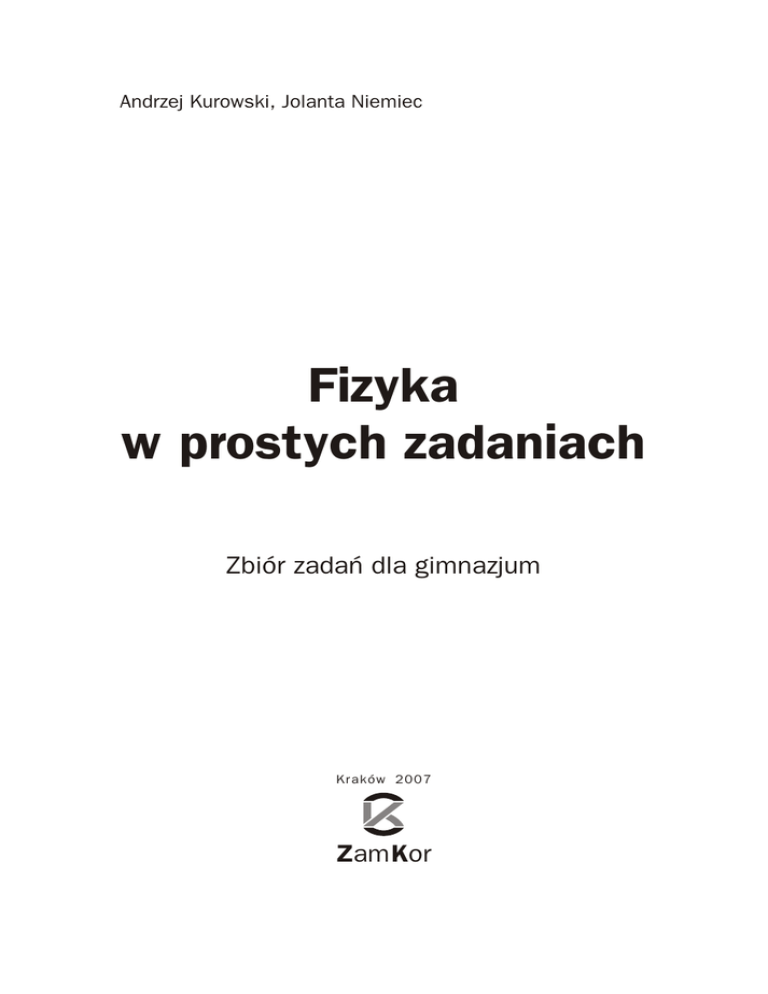 Andrzej Kurowski, Jolanta Niemiec Fizyka w prostych zadaniach Zbiór zadañ dla gimnazjum Kraków 2007 ZamKor Projekt ok³adki: Joanna Wypiór Konsultacja merytoryczna: Barbara Sagnowska © Copyright by ZamKor, Spó³ka Jawna ul. Tetmajera 19, 31-352 Kraków tel.: (0 prefiks 12) 623-25-00 faks: (0 prefiks 12) 623-25-13 e-mail: [email protected] http://www.zamkor.pl ISBN 978-83-88830-41-9 Druk i oprawa: P.W. STABIL, Kraków, (0 prefiks 12), 410-28-20, 21 Spis treœci Od Wydawnictwa . . . . . . . . . . . . . . . . . . . . . . 5 1. Wykonujemy pomiary . . . . . . . . . . . . . . . . . . 7 2. Niektóre w³aœciwoœci substancji . . . . . . . . . . . . 15 3. Cz¹steczkowa budowa materii . . . . . . . . . . . . . 21 4. Jak opisujemy ruch. . . . . . . . . . . . . . . . . . . 25 5. Si³y w przyrodzie . . . . . . . . . . . . . . . . . . . . 35 6. Wyruszamy w kosmos . . . . . . . . . . . . . . . . . 47 7. Praca, moc, energia . . . . . . . . . . . . . . . . . . 51 8. Przemiany energii w zjawiskach cieplnych . . . . . . . . 59 9. Drgania i fale . . . . . . . . . . . . . . . . . . . . . 65 10. Elektrostatyka . . . . . . . . . . . . . . . . . . . . . 71 11. Pr¹d elektryczny . . . . . . . . . . . . . . . . . . . . 81 12. Zjawiska magnetyczne . . . . . . . . . . . . . . . . . 93 13. Optyka, czyli nauka o œwietle . . . . . . . . . . . . . . 99 14. Tajemniczy œwiat atomów . . . . . . . . . . . . . . . 105 15. Przygotowujemy siê do egzaminu i dalszej nauki fizyki . 107 Odpowiedzi. . . . . . . . . . . . . . . . . . . . . . . . 115 Od Wydawnictwa Zbiór „Fizyka w prostych zadaniach” zosta³ przygotowany z myœl¹ o ka¿dym uczniu gimnazjum (niekoniecznie takim, który pragnie startowaæ w konkursach), bo ka¿dego przecie¿ czeka egzamin, który powinien zdaæ jak najlepiej. Wiele zadañ, to „wprawki” w wykonywaniu prostych obliczeñ, przekszta³caniu jednostek, sporzadzaniu wykresów. S¹ to umiejêtnoœci, które pocz¹tkowo wydaj¹ siê trudne, ale które, ze wzglêdu na powtarzalnoœæ stosowanych sposobów, mo¿na „wytrenowaæ”. Na taki trening, niestety, brak czasu na lekcjach. Skoro zbior jest przeznaczony do pracy domowej, zdecydowano zamieœciæ w nim odpowiedzi do wszystkich zadañ. W wielu przypadkach s¹ to równoczeœnie ich rozwi¹zania. Ostatni rozdzia³ zbioru zawiera zadania przekrojowe, pomagaj¹ce w powtórzeniu i usystematyzowaniu wiedzy przed egzaminem. Zadania w zbiorze obejmuj¹ ca³y zakres obowi¹zuj¹cej podstawy programowej. Ich samodzielne rozwi¹zanie wystarczy do ukszta³towania umiejêtnoœci potrzebnych do egzaminu i dalszej nauki fizyki w szkole ponadgimnazjalnej. 11 pr¹d elektryczny a) Spróbuj oszacowaæ bez wykonywania obliczeñ, który opór: R 1, czy R 2 jest wiêkszy. b) Oblicz stosunek wartoœci tych oporów. 11.21. Na schemacie obwodu zaznaczono symbol pewnego opornika (rys. 11.7). a) Jak nazywa siê taki opornik? b) W jakim celu stosujemy go w obwodzie? c) Jak bêdzie siê zmieniaæ natê¿enie pr¹du w obwodzie, podczas zwiêkszania oporu tego opornika? R A Rys. 11.7 11.22. Oblicz napiêcie przy³o¿one do koñców grza³ki o oporze 100W, je¿eli pop³yn¹³ przez ni¹ pr¹d elektryczny o natê¿eniu 2,3 A. 11.23. Oblicz natê¿enie pr¹du p³yn¹cego przez w³ókno ¿arówki o oporze 1150W w³¹czonej do napiêcia 230 V. 11.24. Przez spiralê grzejn¹ ¿elazka dostosowan¹ do napiêcia 230 V w czasie 8 s przep³yn¹³ ³adunek elektryczny 40 C. Oblicz opór elektryczny tej spirali. 11.25. Oblicz wskazanie woltomierza korzystaj¹c z danych umieszczonych na schemacie (rys. 11.8). I = 1,5 A A V R = 10 W Rys. 11.8 86 13 optyka, czyli nauka o œwietle 13.5. Dlaczego latem chêtnie nosimy bia³e ubrania? 13.6. Jakie zjawisko obserwujemy, gdy œwiat³o pada na lusterko, a jakie gdy pada na œcianê? 13.7. Dlaczego we mgle widaæ wi¹zkê œwiat³a reflektorów samochodowych, a w czystym powietrzu nie? 13.8. Na zwierciad³o pada promieñ œwiat³a. Narysuj dalszy jego bieg w sytuacji z rysunku 13.2 a) i b). Zaznacz i nazwij odpowiednie k¹ty. a) b) zwierciad³o zwierciad³o Rys. 13.2 13.9. Promieñ œwietlny padaj¹cy na zwierciad³o tworzy z promieniem odbitym k¹t 80°. Oblicz k¹t padania i k¹t odbicia œwiat³a. 13.10. Rowerowe œwiate³ko odblaskowe wykonane jest z czerwonego przeŸroczystego plastiku, a powierzchnie odbijaj¹ce tworz¹ k¹t prosty (rys. 13.3). Narysuj wi¹zkê promieni odbitych od szk³a odblaskowego. Rys. 13.3 100