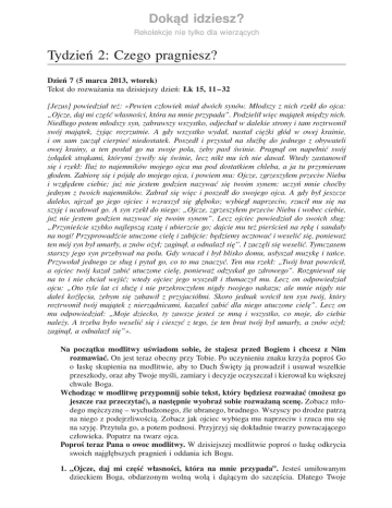 Dokąd idziesz? Rekolekcje nie tylko dla wierzących Tydzień 2: Czego pragniesz? Dzień 7 (5 marca 2013, wtorek) Tekst do rozważania na dzisiejszy dzień: Łk 15, 11–32 [Jezus] powiedział też: «Pewien człowiek miał dwóch synów. Młodszy z nich rzekł do ojca: „Ojcze, daj mi część własności, która na mnie przypada”. Podzielił więc majątek między nich. Niedługo potem młodszy syn, zabrawszy wszystko, odjechał w dalekie strony i tam roztrwonił swój majątek, żyjąc rozrzutnie. A gdy wszystko wydał, nastał ciężki głód w owej krainie, i on sam zaczął cierpieć niedostatek. Poszedł i przystał na służbę do jednego z obywateli owej krainy, a ten posłał go na swoje pola, żeby pasł świnie. Pragnął on napełnić swój żołądek strąkami, którymi żywiły się świnie, lecz nikt mu ich nie dawał. Wtedy zastanowił się i rzekł: Iluż to najemników mojego ojca ma pod dostatkiem chleba, a ja tu przymieram głodem. Zabiorę się i pójdę do mojego ojca, i powiem mu: Ojcze, zgrzeszyłem przeciw Niebu i względem ciebie; już nie jestem godzien nazywać się twoim synem: uczyń mnie choćby jednym z twoich najemników. Zabrał się więc i poszedł do swojego ojca. A gdy był jeszcze daleko, ujrzał go jego ojciec i wzruszył się głęboko; wybiegł naprzeciw, rzucił mu się na szyję i ucałował go. A syn rzekł do niego: „Ojcze, zgrzeszyłem przeciw Niebu i wobec ciebie, już nie jestem godzien nazywać się twoim synem”. Lecz ojciec powiedział do swoich sług: „Przynieście szybko najlepszą szatę i ubierzcie go; dajcie mu też pierścień na rękę i sandały na nogi! Przyprowadźcie utuczone cielę i zabijcie: będziemy ucztować i weselić się, ponieważ ten mój syn był umarły, a znów ożył; zaginął, a odnalazł się”. I zaczęli się weselić. Tymczasem starszy jego syn przebywał na polu. Gdy wracał i był blisko domu, usłyszał muzykę i tańce. Przywołał jednego ze sług i pytał go, co to ma znaczyć. Ten mu rzekł: „Twój brat powrócił, a ojciec twój kazał zabić utuczone cielę, ponieważ odzyskał go zdrowego”. Rozgniewał się na to i nie chciał wejść; wtedy ojciec jego wyszedł i tłumaczył mu. Lecz on odpowiedział ojcu: „Oto tyle lat ci służę i nie przekroczyłem nigdy twojego nakazu; ale mnie nigdy nie dałeś koźlęcia, żebym się zabawił z przyjaciółmi. Skoro jednak wrócił ten syn twój, który roztrwonił twój majątek z nierządnicami, kazałeś zabić dla niego utuczone cielę”. Lecz on mu odpowiedział: „Moje dziecko, ty zawsze jesteś ze mną i wszystko, co moje, do ciebie należy. A trzeba było weselić się i cieszyć z tego, że ten brat twój był umarły, a znów ożył; zaginął, a odnalazł się”». Na początku modlitwy uświadom sobie, że stajesz przed Bogiem i chcesz z Nim rozmawiać. On jest teraz obecny przy Tobie. Po uczynieniu znaku krzyża poproś Go o łaskę skupienia na modlitwie, aby to Duch Święty ją prowadził i usuwał wszelkie przeszkody, oraz aby Twoje myśli, zamiary i decyzje oczyszczał i kierował ku większej chwale Boga. Wchodząc w modlitwę przypomnij sobie tekst, który będziesz rozważać (możesz go jeszcze raz przeczytać), a następnie wyobraź sobie rozważaną scenę. Zobacz młodego mężczyznę – wychudzonego, źle ubranego, brudnego. Wszyscy po drodze patrzą na niego z podejrzliwością. Zobacz jak ojciec wybiega mu naprzeciw i rzuca mu się na szyję. Przytula go, a potem podnosi. Przyjrzyj się dokładnie twarzy powracającego człowieka. Popatrz na twarz ojca. Poproś teraz Pana o owoc modlitwy. W dzisiejszej modlitwie poproś o łaskę odkrycia swoich najgłębszych pragnień i oddania ich Bogu. 1. „Ojcze, daj mi część własności, która na mnie przypada”. Jesteś umiłowanym dzieckiem Boga, obdarzonym wolną wolą i dążącym do szczęścia. Dlatego Twoje serce podpowiada Ci, że należy Ci się „część własności” – spełnienie Twoich pragnień. To samo serce mówi także, że skoro Ojciec ma wszystko, to może dać Ci wszystko. Przyjrzyj się uważnie rezultatom pójścia za swoimi dotychczasowymi pragnieniami. Jakie skutki miało to dla Ciebie i dla Twojego otoczenia? Czy spełnione pragnienia dały Ci szczęście, poczucie sensu, przyczyniły się do Twojego wzrostu? A jaki wpływ miały na innych? Czy te niespełnione nie paraliżują Cię, nie zmniejszają Twojej ufności? Może rodzą w Tobie poczucie złości, gniewu albo lęku wobec siebie, ludzi lub Boga? A może powodują obojętność na sprawy duchowe? Może „odkładasz” Boga na później, gdy już zaspokoisz swoje własne potrzeby? Przypatrz się wartościom swoich pragnień. Nie potępiaj siebie, jeśli odkryjesz, że są i takie pragnienia, które są moralnie złe. Może dostrzeżesz też dobre lub obojętne, ale uświadomisz sobie, że do ich realizacji użyłeś niegodziwych środków. Pomyśl, co możesz zmienić, żeby wybierać te, które ostatecznie będą Cię kierowały ku Bogu, które pozwolą Ci żyć w pełni: być umiłowanym synem, umiłowaną córką Boga. Zwierz się z tego Bogu jak swojemu przyjacielowi. 2. „A gdy był jeszcze daleko, ujrzał go jego ojciec i wzruszył się głęboko...” Jeśli odkryłeś, że „roztrwoniłeś swoją własność” albo jakąś jej część, to teraz nadszedł czas, abyś „zabrał się” i „poszedł do swojego ojca”. On wygląda Ciebie z głęboką tęsknotą. Już z daleka widzi najmniejsze wychylenie Twojego serca w kierunku dobra, wybiega na spotkanie z Tobą. Przygotował dla Ciebie „najlepszą szatę” oraz „pierścień na rękę i sandały na nogi” – o wiele więcej, niż oczekiwałeś. Pełen radości mówi: „będziemy ucztować i weselić się, ponieważ ten mój syn był umarły, a znów ożył; zaginął, a odnalazł się”. Wspaniałomyślny Bóg pragnie Twojego szczęścia, bo do tego zostałeś stworzony. Gdy wracasz, Miłosierny Bóg nie