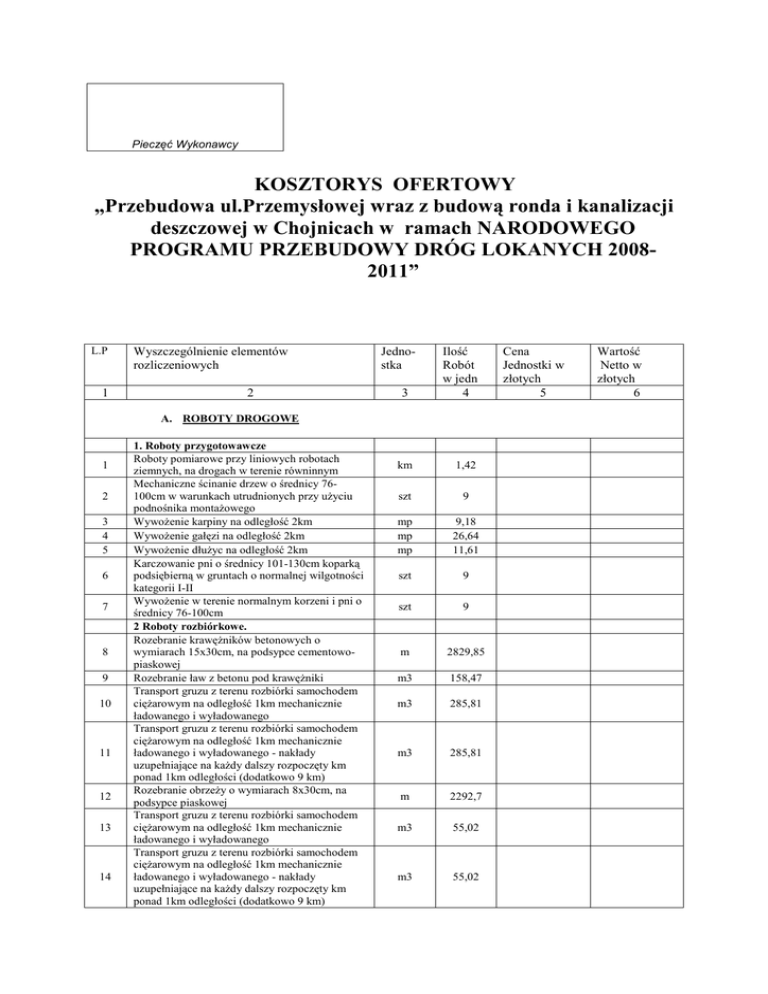 Pieczęć Wykonawcy KOSZTORYS OFERTOWY „Przebudowa ul.Przemysłowej wraz z budową ronda i kanalizacji deszczowej w Chojnicach w ramach NARODOWEGO PROGRAMU PRZEBUDOWY DRÓG LOKANYCH 20082011” L.P 1 Wyszczególnienie elementów rozliczeniowych 2 Jednostka 3 Ilość Robót w jedn 4 A. ROBOTY DROGOWE 1 2 3 4 5 6 7 8 9 10 11 12 13 14 1. Roboty przygotowawcze Roboty pomiarowe przy liniowych robotach ziemnych, na drogach w terenie równinnym Mechaniczne ścinanie drzew o średnicy 76100cm w warunkach utrudnionych przy uŜyciu podnośnika montaŜowego WywoŜenie karpiny na odległość 2km WywoŜenie gałęzi na odległość 2km WywoŜenie dłuŜyc na odległość 2km Karczowanie pni o średnicy 101-130cm koparką podsiębierną w gruntach o normalnej wilgotności kategorii I-II WywoŜenie w terenie normalnym korzeni i pni o średnicy 76-100cm 2 Roboty rozbiórkowe. Rozebranie krawęŜników betonowych o wymiarach 15x30cm, na podsypce cementowopiaskowej Rozebranie ław z betonu pod krawęŜniki Transport gruzu z terenu rozbiórki samochodem cięŜarowym na odległość 1km mechanicznie ładowanego i wyładowanego Transport gruzu z terenu rozbiórki samochodem cięŜarowym na odległość 1km mechanicznie ładowanego i wyładowanego - nakłady uzupełniające na kaŜdy dalszy rozpoczęty km ponad 1km odległości (dodatkowo 9 km) Rozebranie obrzeŜy o wymiarach 8x30cm, na podsypce piaskowej Transport gruzu z terenu rozbiórki samochodem cięŜarowym na odległość 1km mechanicznie ładowanego i wyładowanego Transport gruzu z terenu rozbiórki samochodem cięŜarowym na odległość 1km mechanicznie ładowanego i wyładowanego - nakłady uzupełniające na kaŜdy dalszy rozpoczęty km ponad 1km odległości (dodatkowo 9 km) km 1,42 szt 9 mp mp mp 9,18 26,64 11,61 szt 9 szt 9 m 2829,85 m3 158,47 m3 285,81 m3 285,81 m 2292,7 m3 55,02 m3 55,02 Cena Jednostki w złotych 5 Wartość Netto w złotych 6 15 16 17 18 19 20 21 22 23 24 25 26 27 28 29 30 31 Rozebranie nawierzchni chodników z płyt betonowych o wymiarach 35x35x5cm na podsypce cementowo-piaskowej Wywiezienie gruzu z terenu rozbiórki na odl. 1 km ładowanego koparko-ładowarką na samochody samowyładowcze i mechaniczne wyładowanie Transport gruzu z terenu rozbiórki samochodem cięŜarowym na odległość 1km mechanicznie ładowanego i wyładowanego - nakłady uzupełniające na kaŜdy dalszy rozpoczęty km ponad 1km odległości (dodatkowo 9 km) Rozebranie mechaniczne podbudowy betonowej o grubości 12cm Wywiezienie gruzu z terenu rozbiórki na odl. 1 km ładowanego koparko-ładowarką na samochody samowyładowcze i mechaniczne wyładowanie Transport gruzu z terenu rozbiórki samochodem cięŜarowym na odległość 1km mechanicznie ładowanego i wyładowanego - nakłady uzupełniające na kaŜdy dalszy rozpoczęty km ponad 1km odległości-(dodatkowo 9 km) Rozebranie ręczne nawierzchni z klinkieru na podsypce cementowo-piaskowej Wywiezienie gruzu z terenu rozbiórki na odl. 1 km ładowanego koparko-ładowarką na samochody samowyładowcze i mechaniczne wyładowanie Transport gruzu z terenu rozbiórki samochodem cięŜarowym na odległość 1km mechanicznie ładowanego i wyładowanego - nakłady uzupełniające na kaŜdy dalszy rozpoczęty km ponad 1km odległości (dodatkowo 9 km) Rozebranie nawierzchni z płyt drogowych betonowych o grubości 12cm z wypełnieniem spoin piaskiem Wywiezienie gruzu z terenu rozbiórki na odl. 1 km ładowanego koparko-ładowarką na samochody samowyładowcze i mechaniczne wyładowanie Transport gruzu z terenu rozbiórki samochodem cięŜarowym na odległość 1km mechanicznie ładowanego i wyładowanego - nakłady uzupełniające na kaŜdy dalszy rozpoczęty km ponad 1km odległości (dodatkowo 9 km) Rozebranie nawierzchni z płyt drogowych betonowych o grubości 12cm z wypełnieniem spoin piaskiem Wywiezienie gruzu z terenu rozbiórki na odl 1 km ładowanego koparko-ładowarką na samochody samowyładowcze i mechaniczne wyładowanie Transport gruzu z terenu rozbiórki samochodem cięŜarowym na odległość 1km mechanicznie ładowanego i wyładowanego - nakłady uzupełniające na kaŜdy dalszy rozpoczęty km ponad 1km odległości (dodatkowo 9 km) Rozebranie mechaniczne nawierzchni z mieszanek mineralno-bitumicznych o grubości 3cm Rozebranie mechaniczne nawierzchni z mieszanek mineralno-bitumicznych o grubości 3cm - dodatek za kaŜdy dalszy 1cm powyŜej 3cm grubości nawierzchni (dodatkowo 1 cm) m2 2665,55 m3 133,28 m3 133,28 m2 145,25 m3 17,43 m3 17,43 m2 225,5 m3 18,04 m3 18,04 m2 92 m3 11,04 m3 11,04 m2 172,5 m3 20,7 m3 20,7 m2 1277,31 m2 1277,31 32 33 34 35 36 37 38 39 40 41 42 43 44 45 46 47 Wywiezienie gruzu z terenu rozbiórki na odl. 1 km ładowanego koparko-ładowarką na samochody samowyładowcze i mechaniczne wyładowanie Transport gruzu z terenu rozbiórki samochodem cięŜarowym na odległość 1km mechanicznie ładowanego i wyładowanego - nakłady uzupełniające na kaŜdy dalszy rozpoczęty km ponad 1km odległości-(dodatkowo 9 km) Rozebranie mechaniczne podbudowy betonowej o grubości 12cm Rozebranie mechaniczne podbudowy betonowej o grubości 12cm - za kaŜdy dalszy 1cm ( dodatkowo 16 cm ) Wywiezienie gruzu z terenu rozbiórki na odl. 1 km ładowanego koparko-ładowarką na samochody samowyładowcze i mechaniczne wyładowanie Transport gruzu z terenu rozbiórki samochodem cięŜarowym na odległość 1km mechanicznie ładowanego i wyładowanego - nakłady uzupełniające na kaŜdy dalszy rozpoczęty km ponad 1km odległości (dodatkowo 9 km) Roboty remontowe z wywozem materiału z rozbiórki na odległość do 1km - frezowanie nawierzchni bitumicznej o grubości do 4cm 3. Roboty ziemne Roboty ziemne wykonywane koparkami podsiębiernymi o pojemności łyŜki 0,40m3 w gruncie kategorii III-IV z transportem urobku samochodami samowyładowczymi na odległość 1km (na nasyp) Ręczne formowanie nasypów z ziemi dowoŜonej samochodami samowyładowczymi, grunt kategorii I-II Zagęszcze