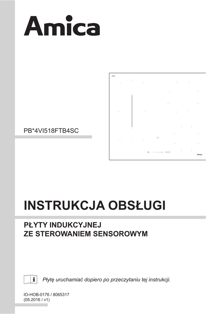 PB*4VI518FTB4SC INSTRUKCJA OBSŁUGI PŁYTY INDUKCYJNEJ ZE STEROWANIEM SENSOROWYM Płytę uruchamiać dopiero po przeczytaniu tej instrukcji. IO-HOB-0176 / 8065317 (05.2016 / v1) SZANOWNY KLIENCIE, Płyta Amica to połączenie wyjątkowej łatwości obsługi i doskonałej efektywności. Po przeczytaniu instrukcji, obsługa płyty nie będzie problemem. Płyta, która opuściła fabrykę była dokładnie sprawdzona przed zapakowaniem pod względem bezpieczeństwa i funkcjonalności na stanowiskach kontrolnych. Prosimy Państwa o uważną lekturę instrukcji obsługi przed uruchomieniem urządzenia. Przestrzeganie zawartych w niej wskazówek uchroni Państwa przed niewłaściwym użytkowaniem. Instrukcję należy zachować i przechowywać tak, aby mieć ją zawsze pod ręką. Należy dokładnie przestrzegać instrukcji obsługi w celu uniknięcia nieszczęśliwych wypadków. Uwaga! Urządzenie obsługiwać tylko po przeczytaniu niniejszej instrukcji. Urządzenie zostało zaprojektowane wyłącznie jako urządzenie do gotowania.Każde inne jego zastosowanie (np. do ogrzewania pomieszczeń) jest niezgodne z jego przeznaczeniem i może być niebezpieczne. Producent zastrzega sobie możliwość dokonywania zmian nie wpływających na działanie urządzenia. Oświadczenie producenta Producent deklaruje niniejszym, że wyrób ten spełnia zasadnicze wymagania wymienionych poniżej dyrektyw europejskich: ● dyrektywy niskonapięciowej 2006/95/WE, ● dyrektywy kompatybilności elektromagnetycznej 2004/108/WE, ● dyrektywy ekoprojektowania 2009/125/WE, i dlatego wyrób został oznakowany oraz została wystawiona dla niego deklaracja zgodności udostępniana organom nadzorującym rynek. Masz wątpliwości? Nie wszystko, co przeczytałeś w instrukcji jest zrozumiałe zadzwoń do Centrum Serwisowego, gdzie uzyskasz wszechstronną pomoc. tel. 801 801 800 2 SPIS TREŚCI Podstawowe informacje.........................................................................................2 Wskazówki dotyczące bezpieczeństwa użytkowania..............................................4 Opis wyrobu............................................................................................................9 Instalacja..................................................................................................................9 Obsługa..................................................................................................................15 Czyszczenie i konserwacja...................................................................................31 Postępowanie w sytuacjach awaryjnych............................................................33 Dane techniczne....................................................................................................35 Gwarancja, obsługa posprzedażna.....................................................................35 3 WSKAZÓWKI DOTYCZĄCE BEZPIECZEŃSTWA UŻYTKOWANIA Uwaga.Urządzenie i jego dostępne części stają się gorące podczas użycia. Możliwość dotknięcia elementów grzejnych powinno być objęte szczególną troską. Dzieci poniżej 8 roku życia powinny trzymać się z daleka, chyba że są pod stałą opieką. Niniejszy sprzęt może być używany przez dzieci w wieku od 8 lat i wyżej i osoby z ograniczeniami fizycznymi, czuciowymi albo umysłowymi albo brakiem doświadczenia i wiedzy, jeśli odbywa się pod nadzorem lub zgodnie z instrukcją użytkowania sprzętu, przekazanej przez osoby odpowiadające za ich bezpieczeństwo. Należy zwracać uwagę na dzieci, aby nie bawiły się sprzętem. Sprzątanie i czynności obsługowe nie powinny być robione przez dzieci bez nadzoru. Uwaga. Gotowanie bez nadzoru tłuszczu lub oleju na płycie kuchennej może być niebezpieczne i doprowadzić do pożaru. NIGDY nie próbuj gasić ognia wodą, ale wyłącz urządzenie i wtedy przykryj płomień np. pokrywką lub niepalnym kocem. Uwaga. Niebezpieczeństwo pożaru: nie gromadź rzeczy na powierzchni do gotowania. 4 WSKAZÓWKI DOTYCZĄCE BEZPIECZEŃSTWA UŻYTKOWANIA Uwaga. Jeżeli powierzchnia płyty jest pęknięta, wyłączyć prąd, aby uniknąć porażenia prądem elektrycznym. Przedmiotów metalowych, takich jak noże, widelce, łyżki i pokrywki oraz folii aluminiowej nie zaleca się kłaść na powierzchni płyty kuchennej, gdyż mogą się one stać gorące. Po użyciu wyłącz element grzejny płyty wyłącznikiem i nie polegaj na wskazaniach detektora naczyń. Urządzeniem nie należy sterować zewnętrznym zegarem lub niezależnym układem zdalnego sterowania. Do czyszczenia płyty nie wolno używać sprzętu do czyszczenia parą. 5 WSKAZÓWKI DOTYCZĄCE BEZPIECZEŃSTWA UŻYTKOWANIA ● Przed pierwszym użyciem płyty indukcyjnej należy przeczytać instrukcję użytkowania. W ten sposób zapewniamy sobie bezpieczeństwo oraz unikamy uszkodzenia płyty. ● Jeżeli płyta indukcyjna użytkowana jest w bezpośredniej bliskości radia, telewizora lub innego urządzenia emitującego, należy sprawdzić, czy zapewniona jest prawidłowość działania panelu sterującego płytą. ● Płytę winien podłączyć uprawniony instalator – elektryk. ● Nie wolno instalować płyty w pobliżu urządzeń chłodniczych. ● Meble w których zabudowywana jest płyta, muszą być odporne na temperatury ok 100oC. Dotyczy to oklein,krawędzi,powierzchni wykonanych z tworzyw sztucznych, klejów oraz lakierów. ● Płytę należy użytkować tylko po jej zabudowaniu. W ten sposób zabezpieczamy się przed dotknięciem części pozostających pod napięciem. ● Naprawy urządzeń elektrycznych mogą przeprowadzać tylko specjaliści. Niefachowe naprawy powodują poważne niebezpieczeństwo dla użytkownika. ● Urządzenie zostaje tylko wówczas odłączone od sieci elektrycznej, gdy zostanie wyłączony bezpiecznik lub wtyczka zostanie wyciągnięta z gniazdka. ● Wtyczka przewodu przyłączeniowego powinna być dostępna po zainstalowaniu pł
