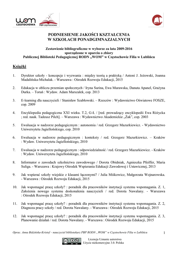 PODNIESIENIE JAKOŚCI KSZTAŁCENIA W SZKOŁACH PONADGIMNAZJALNYCH Zestawienie bibliograficzne w wyborze za lata 2009-2016 sporządzone w oparciu o zbiory Publicznej Biblioteki Pedagogicznej RODN „WOM” w Częstochowie Filia w Lublińcu Książki 1. Dyrektor szkoły - koncepcje i wyzwania : między teorią a praktyką / Antoni J. Jeżowski, Joanna Madalińska-Michalak. - Warszawa : Ośrodek Rozwoju Edukacji, 2015 2. Edukacja w obliczu przemian społecznych / Iryna Surina, Ewa Murawska, Danuta Apanel, Grażyna Durka. – Toruń : Wydaw. Adam Marszałek, cop. 2013 3. E-learning dla nauczycieli / Stanisław Szabłowski. – Rzeszów : Wydawnictwo Oświatowe FOSZE, cop. 2009 4. Encyklopedia pedagogiczna XXI wieku. T.2, G-Ł / [red. prowadzący encyklopedii Ewa Różycka ; red. nauk. Tadeusz Pilch]. – Warszawa : Wydawnictwo Akademickie „Żak”, cop. 2003 5. Ewaluacja w nadzorze pedagogicznym : autonomia / red. Grzegorz Mazurkiewicz. - Wydawnictwo Uniwersytetu Jagiellońskiego, cop. 2010 6. Ewaluacja w nadzorze pedagogicznym : konteksty / red. Grzegorz Mazurkiewicz. – Kraków : Wydaw. Uniwersytetu Jagiellońskiego, 2010 7. Ewaluacja w nadzorze pedagogicznym : odpowiedzialność / red. Grzegorz Mazurkiewicz. - Kraków : Wydaw. Uniwersytetu Jagiellońskiego, 2010 8. Informator o zawodach szkolnictwa zawodowego / Dorota Obidniak, Agnieszka Pfeiffer, Maria Suliga. - Warszawa : Krajowy Ośrodek Wspierania Edukacji Zawodowej i Ustawicznej, 2013 9. Jak wspierać szkoły wiejskie z klasami łączonymi? / Julia Miśkowicz, Małgorzata Wojnarowska. - Warszawa : Ośrodek Rozwoju Edukacji, 2015 10. Jak wspomagać pracę szkoły? : poradnik dla pracowników instytucji systemu wspomagania. Z. 1, Założenia nowego systemu doskonalenia nauczycieli / red. Dorota Nawalany. - Warszawa : Ośrodek Rozwoju Edukacji, 2015 11. Jak wspomagać pracę szkoły? : poradnik dla pracowników instytucji systemu wspomagania. Z. 2, Diagnoza pracy szkoły / red. Dorota Nawalany. - Warszawa : Ośrodek Rozwoju Edukacji, 2015 12. Jak wspomagać pracę szkoły? : poradnik dla pracowników instytucji systemu wspomagania. Z. 3, Planowanie działań / red. Dorota Nawalany. - Warszawa : Ośrodek Rozwoju Edukacji, 2015 Oprac. Anna Bidzińska-Kristof – nauczyciel bibliotekarz PBP RODN „WOM” w Częstochowie Filia w Lublińcu Licencja Uznanie autorstwa Użycie niekomercyjne 3.0. Polska 1 13. Jak wspomagać pracę szkoły? : poradnik dla pracowników instytucji systemu wspomagania. Z. 4, Realizacja i podsumowanie działań / red. Dorota Nawalany. - Warszawa : Ośrodek Rozwoju Edukacji, 2015 14. Kompetencje diagnostyczne i terapeutyczne nauczyciela / red. nauk. Danuta Wosik-Kawala, Teresa Zubrzycka-Maciąg. - Kraków : Oficyna Wydaw. Impuls, 2011 15. Metoda projektów nie tylko w gimnazjum : poradnik dla nauczycieli i dyrektorów szkół / Agnieszka Mikina, Bożena Zając. - Warszawa : Ośrodek Rozwoju Edukacji, 2012 16. Młodzieżowy Kwestionariusz Zainteresowań Zawodowych - MŁOKOZZ : podręcznik /Anna Paszkowska-Rogacz ; Fundacja Realizacji Programów Społecznych. - Warszawa : Fundacja Realizacji Programów Społecznych, cop. 2011 17. Nauczyciel andragog we współczesnym społeczeństwie / red. Wojciech Horyń, Jan Maciejewski. - Wrocław : Wydawnictwo Uniwersytetu Wrocławskiego, 2010 18. Nauczyciel w szkole uczącej się : informacje o nowym systemie wspomagania / red. meryt. Marianna Hajdukiewicz, Jadwiga Wysocka. - Warszawa : Ośrodek Rozwoju Edukacji, 2015 19. Nowa podstawa programowa z pomocą biblioteki szkolnej / Monika Nagowska. - Warszawa : Agencja Sukurs, 2010 20. Podstawy poradnictwa kariery : poradnik dla nauczycieli / Bożena Wojtasik. - Warszawa : Krajowy Ośrodek Wspierania Edukacji Zawodowej i Ustawicznej, 2011 21. Portret zbiorowy nauczycieli aktywnych : między zaangażowaniem a oporem wobec zmian / Anna Gajdzica. – Toruń : Wydaw. Adam Marszałek, cop. 2013 22. Przewodnik metodyczny dla koordynatorów sieci współpracy i samokształcenia / Maciej Kocurek, Iwona Sołtysińska, Maciej Świeży, Irmina Wachma-Sosin. - Wyd. 2 zm. i rozsz. - Warszawa : Ośrodek Rozwoju Edukacji, 2015 23. W drodze do przywództwa edukacyjnego : wybór materiałów z projektu Przywództwo i zarządzanie w oświacie - system kształcenia i doskonalenia dyrektorów szkół/placówek / wybór i oprac. Alicja Kapcia, Małgorzata Wojnarowska. - Warszawa : Ośrodek Rozwoju Edukacji, 2015 24. Warsztat diagnostyczny doradcy zawodowego : przewodnik dla nauczyciela i doradcy / Małgorzata Rosalska ; Krajowy Ośrodek Wspierania Edukacji Zawodowej i Ustawicznej. - Warszawa : Krajowy Ośrodek Wspierania Edukacji Zawodowej i Ustawicznej, 2012 Artykuły z czasopism 25. Batalia o poprawę jakości kształcenia / Bogdan Urbanek // Nowa Szkoła. - 2013, nr 1, s. 18-28 26. Budowanie kapitału ludzkiego i społecznego na przykładzie szkoły ponadgimnazjalnej / Aneta Anna Wiktorzak // Edukacja. – 2009, nr 1, s. 26-32 27. By zrozumieć szkołę musimy rozmawiać / Grzegorz Mazurkiewicz // Dyrektor Szkoły. - 2013, nr 9, s. 24-28 Oprac. Anna Bidzińska-Kristof – nauczyciel bibliotekarz PBP RODN „WOM” w Częstochowie Filia w Lublińcu Licencja Uznanie autorstwa Użycie niekomercyjne 3.0. Polska 2 28. Co doradzać dziś nauczycielom fizyki i przyrody? / Julian Piotr Sawiński // Fizyka w Szkole. - 2015, nr 2, s. 38-43 29. Co się zmienia w nowym roku szkolnym / Lidia Jastrzębska // Problemy OpiekuńczoWychowawcze. - 2012, nr 8, s. 3-5 30. Czujesz i wiesz… Refleksyjnie o ujawnionych na egzaminie maturalnym niedostatkach polonistycznej edukacji / Krystyna Cembrzyńska // Język Polski w Liceum. - 2010/2011, nr 3, s. 68-79 31. Czy fizyką można zaciekawić każdego ucznia? / Julian Piotr Sawiński // Fizyka w Szkole. – 2014, nr 3, s. 38-42 32. Czy i jak odwrócić chemiczną edukację? / Julian Piotr Sawiński // Chemia w Szkole. - 2014, nr 3, s. 26-30 33. Czy polskie szkoły potrafią nauczyć przedsiębiorczości? / Jan Fazlagić /