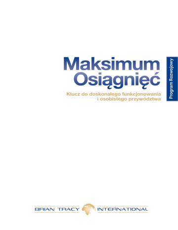 Klucz do doskonałego funkcjonowania i osobistego przywództwa Program Rozwojowy Maksimum Osiągnięć Maksimum Osiągnięć Klucz do doskonałego funkcjonowania i osobistego przywództwa Od czego zależy sukces? Sukces zależy w 80 procentach od psychiki. To, co osiągasz, wynika przede wszystkim z tego, jak myślisz o sobie samym, o swoim życiu i o otaczających cię ludziach. Zmieniając sposób myślenia zmienisz wszystko to, co robisz! Potencjał przeciętnego człowieka to jak niezbadany ocean, dziewiczy kontynent, cały wszechświat możliwości, które czekają na uwolnienie i zastosowanie do jakiegoś ważnego, dobrego celu. Tajemnice sukcesu… Tak zwane tajemnice sukcesu nie mają w sobie niczego tajemniczego. To odwieczne prawdy i działania, zgodnie z którymi od wieków postępują osiągający sukcesy ludzie. Kiedy je poznasz i zastosujesz, zaczniesz cieszyć się takimi samymi wynikami, do jakich dochodzą najlepiej radzący sobie ludzie w społeczeństwie. Mało jest rzeczy, których nie będziesz w stanie osiągnąć, jeśli będziesz ich naprawdę pragnął. Dlaczego niektórzy ludzie osiągają więcej sukcesów niż inni? Najmądrzejsi ludzie wszystkich cywilizacji szukają odpowiedzi na pytanie od ponad 2500 lat. W XX wieku na poszukiwanie tej odpowiedzi przeznaczono niezliczone miliony dolarów i tysiące godzin. Napisano na ten temat tysiące książek i artykułów. Dziś o tym, jak osiągać sukces w różnych dziedzinach, wiemy więcej, niż kiedykolwiek wcześniej. Sukces stał się przewidywalny. Najlepsze rozwiązania w zasięgu ręki Maksimum Osiągnięć – to najbardziej znany program szkoleniowy Briana Tracy, brało w nim udział ponad milion osób na całym świecie. Oceniany jest jako najlepszy w dziejach program na temat rozwoju zawodowego i osobistego. „Szczęście w życiu jest dość przewidywalne. Jeśli chcesz mieć więcej szczęścia, częściej podejmuj ryzyko, bądź bardziej aktywny, częściej włączaj się do działania.” – Brian Tracy A co na szkoleniu? A co na szkoleniu? Nauczysz się, jak możesz w sposób systematyczny i celowy przejąć kontrolę nad własnymi myślami i uczuciami i jak możesz zacząć budować swoje poczucie własnej wartości i pewności siebie, aż staniesz się bardziej efektywny we wszystkim, co robisz. Dowiesz się, jak możesz wyłączyć większość swoich negatywnych emocji. Nauczysz się uwalniaćod uczucia gniewu, strachu, winy, i niechęci, które cię dotąd powstrzymywały. Poznasz szereg sprawdzonych technik, które możesz wykorzystać do wyzwolenia umysłu, zwolnienia hamulców i odblokowania swojego potencjału. Poznasz najważniejsze koncepcje z dziedziny wyznaczania celów. Nauczysz się pytań, które przez całe życie możesz sobie zadawać, aby być wciąż skupiony na osiąganiu tego, co jest dla ciebie ważne. Nauczysz się formułować własną misję, dzięki której będziesz się ze sobą wspaniale czuł i osiągniesz więcej niż kiedykolwiek wcześniej. Poznasz siedem zasad związanych ze zmianami i to, jak można je stosować, aby lepiej panować nad własnym życiem i mieć lepsze samopoczucie. Najefektywniej działający ludzie to w każdej dziedzinie ci, którzy stosują szereg metod i strategii postępowania ze zmianami, których nie mogą spowolnić ani nawet przewidzieć. Kiedy je poznasz i zaczniesz wykorzystywać, będziesz czuł się lepiej i pewniej we wszystkich obszarach życia. Dowiesz się jakie są pierwotne przyczyny co najmniej 95% wszystkich stresów, niepokojów i napięć, z którymi masz do czynienia. Nauczysz się prostych, skutecznych, sprawdzonych technik eliminacji tych źródeł stresu i zapewniania sobie większego poczucia panowania i siły. Poznasz najważniejsze techniki kreatywnego myślenia. Pomogły one osiągnąć sukces większej liczbie osób, niż jakiekolwiek inne techniki. Umiejętność rozwiązywania problemów, podejmowania decyzji i osiągania wyników to podstawowy czynnik wpływający na twój sukces i szczęście w życiu. Dowiesz się, jak wzmacniać poczucie własnej wartości u innych ludzi, jak sprawić, by ludzie się lubili i jak dobrze i efektywnie postępować we wszystkich relacjach z innymi – w domu i w pracy. Umiejętność postępowania z ludźmi wpływa na twoje szczęście i sukces bardziej, niż jakikolwiek inny czynnik. To, jak bardzo lubisz innych i jak inni lubią ciebie, ma wielkie znaczenie dla twojej zdolności do wpływania na ludzi, negocjowania, przekonywania i dobrego postępowania w pracy i w życiu osobistym. A ponadto – udzial Briana Tracy (video), warsztaty grupowe, ćwiczenia indywidualne, duża dawka inspiracji, motywacji i dobrej zabawy! BRIAN TRACY – Jeden z czołówki światowej sławy autorytetów w dziedzinie budowania sukcesu w biznesie i życiu osobistym. Z jego szkoleń skorzystało wielu liderów znanych światowych firm, doradza największym korporacjom na świecie. Porywające wykłady Briana Tracy, seminaria, szkolenia i książki zmieniły życie wielu ludzi i pomogły osiągnąć szczęście i sukces. Twórca Brian Tracy International połączył wiedzę pochodzącą z czołowych ośrodków naukowych i badawczych zajmujących się takimi dziedzinami takich jak zarządzanie czy psychologia, i stworzył jedyne w swoim rodzaju programy uczące planowania ścieżki kariery, motywowania, zarządzania czasem, skutecznej sprzedaży i wiele innych. MAKSIMUM OSIĄGNIĘĆ Program Rozwojowy Poznasz najbardziej przełomowe odkrycie XX wieku w dziedzinie potencjału ludzkiego. Dowiesz się, jak samokoncept – to, jak o sobie myślisz i czujesz – decyduje o wszystkim, comówisz, robisz i w co wierzysz. Program Szkolenia | Dzień I 1. Metody skutecznego działania i osobistego przywództwa Dlaczego niektórzy ludzie osiągają więcej sukcesów niż inni? Najmądrzejsi ludzie wszystkich cywilizacji szukają odpowiedzi na to pytanie od ponad 2500 lat. W XX wieku na poszukiwanie tej odpowiedzi