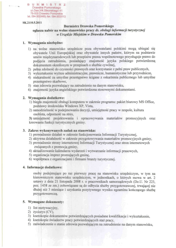 B U R M I S T R Z Drawska Pomorskiego ul.Gen.Wł.Sikorskiego 41 78-500 Drawsko Pomorskie tel. 094-3633485; fax. 094-3633113 SK.2110.5.2011 Burmistrz Drawska Pomorskiego ogłasza nabór na wolne stanowisko pracy ds. obsługi informacji w Urzędzie Miejskim w Drawsku Pomorskim turystycznej 1. Wymagania niezbędne: 1) na wolne stanowisko urzędnicze poza obywatelami polskimi mogą ubiegać się obywatele Unii Europejskiej oraz obywatele innych państw, którym na podstawie umów międzynarodowych lub przepisów prawa wspólnotowego przysługuje prawo do podjęcia zatrudnienia, posiadający znajomość języka polskiego potwierdzoną dokumentem określonym w przepisach o służbie cywilnej, 2) pełna zdolność do czynności prawnych oraz korzystanie z pełni praw publicznych, 3) wykształcenie wyższe administracyjne, prawnicze, humanistyczne lub przyrodnicze, 4) niekaralność za umyślne przestępstwo ścigane z oskarżenia publicznego lub umyślne przestępstwo skarbowe, 5) stan zdrowia pozwalający na zatrudnienie na danym stanowisku, 6) znajomość języka angielskiego potwierdzona stosownymi dokumentami. 2. Wymagania dodatkowe: 1) biegła znajomość obsługi komputera w zakresie programu: pakiet biurowy MS Office, podstawy środowiska Windows XP, Vista, 2) samodzielność w podejmowaniu decyzji, umiejętność pracy w zespole, kultura osobista, odporność na stres, 3) umiejętność projektowania i opracowywania materiałów promocyjnych oraz kreowania funkcji turystycznych gminy. 3. Zakres wykonywanych zadań na stanowisku: 1) prowadzenie działań w zakresie funkcjonowania Informacji Turystycznej, 2) aktywna działalność w zakresie przygotowywania materiałów promocyjnych gminy, 3) prowadzenie strony internetowej Informacji Turystycznej oraz stron internetowych związanych z promocją gminy, 4) aktualizowanie kalendarza wydarzeń i wytwarzanie informacji prasowych, 5) organizacja imprez promujących gminę, 6) współpraca z organizacjami i firmami branży turystycznej. 4. Informacje dodatkowe: osoby podejmujące po raz pierwszy pracę na stanowisku urzędniczym, w tym na kierowniczym stanowisku urzędniczym, w jednostkach, o których mowa w art. 2 ustawy z dnia 21 listopada 2008 r. o pracownikach samorządowych (Dz.U. Nr 223, póz. 1458 ze zm.) zobowiązane są do odbycia służby przygotowawczej, trwającej nie dłużej niż 3 miesiące i uzyskania pozytywnego wyniku egzaminu kończącego służbę przygotowawczą. 5. Wymagane dokumenty: 1) 2) 3) 4) 5) list motywacyjny, życiorys (CV), kserokopie dokumentów potwierdzających posiadane kwalifikacje i wykształcenie, kserokopie świadectw pracy potwierdzających staż pracy, zaświadczenie o stanie zdrowia pozwalającym na zatrudnienie na danym stanowisku, 6) kwestionariusz osobowy, 7) oświadczenie o treści: „Posiadani pełną zdolność do czynności prawnych oraz korzystam w pełni z praw publicznych, nie byłam (byłem) karany (-a) za przestępstwo popełnione umyślnie lub umyślne przestępstwo skarbowe", 8) opis doświadczenia zawodowego i umiejętności zawodowych (w dowolnej formie), 9) inne dodatkowe dokumenty o posiadanych kwalifikacjach i umiejętnościach, opinie, referencje. 6. Termin, sposób i miejsce składania dokumentów: Wymagane dokumenty potwierdzone za zgodność z oryginałem, w zaklejonej kopercie z dopiskiem: „Dotyczy naboru na stanowisko d.s. obsługi informacji turystycznej" należy złożyć w siedzibie urzędu, w sekretariacie (pokój 210) w godzinach pracy urzędu lub przesłać listem poleconym na adres: Urząd Miejski, ul. Sikorskiego 41 78-500 Drawsko Pomorskie w terminie do dnia 18 października 2011 r. Oferty, które wpłyną do urzędu po wyżej określonym terminie nie będą rozpatrywane. Informacja o wyniku naboru będzie umieszczona w Biuletynie Informacji Publicznej pod adresem www.umig.drawskopomorskie.ibip.pl oraz na tablicy ogłoszeń w siedzibie tut. urzędu. Kandydaci spełniający wymogi formalne zostaną powiadomieni o terminie przeprowadzenia rozmowy kwalifikacyjnej. Wymagane dokumenty aplikacyjne należy opatrzyć klauzulą: „Wyrażam zgodę na przetwarzanie moich danych osobowych zawartych w ofercie pracy dla potrzeb niezbędnych do realizacji procesu rekrutacji zgodnie z ustawą z dnia 29 sierpnia 1997 r. o ochronie danych osobowych (Dz.U. z 2002 r. Nr 101, póz. 926 ze zm.) i ustawą z dnia 21 listopada 2008 r. o pracownikach samorządowych (Dz.U. z 2008 r. Nr 223, póz. 1458 ze zm.)" oraz własnoręcznym podpisem. Drawsko Pomorskie, dnia 05 października 2011 r.