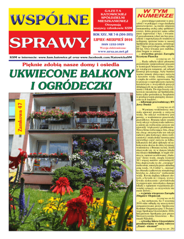 WSPÓLNE SPRAWY GAZETA KATOWICKIEJ SPÓ£DZIELNI MIESZKANIOWEJ Otrzymuj¹ wszyscy cz³onkowie KSM ROK XXV, NR 7-8 (304-305) LIPIEC-SIERPIEŃ 2016 ISSN 1232-5929 Wersja elektroniczna: www.ursa.as.net.pl KSM w internecie: www.ksm.katowice.pl oraz www.facebook.com/KatowickaSM Pięknie zdobią nasze domy i osiedla Zamkowa 47 Ukwiecone balkony i ogródeczki (Ciąg dalszy na str. 3) W TYM NUMERZE … przewidujące patrzenie w przyszłość i wynikające z tego działania prorozwojowe, są moim zdaniem immanentną cechą całej spółdzielczości, która przecież sama sobie musi zapewniać i byt, i trwanie. Z powodzeniem (choć nie bez przeszkód i napotykanych trudności) usiłujemy sprostać temu w naszej Spółdzielni od jej zarania, od którego już 7 lipca przyszłego roku upłynie 60 lat. Owo trwanie jest stabilne, choć bogate w zmiany... – stwierdza prezes Zarządu Krystyna Piasecka (czytaj na str. 5) ... Rada odbyła także plenarne posiedzenie (poprzedzone pracami w komisjach branżowych), którego wiodącym tematem, od zebrań komisji poczynając, były bardzo ważne tematy dotyczące zużycia i kosztów wody zimnej, ciepłej i ciepła do celów ogrzewania. Są to pozycje o największym ciężarze kosztowym z wszystkich pozycji składających się na opłaty za korzystanie z lokalu. Do tego koszty całkowicie niezależne od Spółdzielni, która tylko pośredniczy bezpłatnie w przekazywaniu pieniędzy dostawcom tych mediów... – informuje przewodniczący RN Jerzy Doniec (czytaj na str.4) ... Wymiana wodomierzy musiała ujawnić prawdę o zużyciu wody, bo odczyt wzrokowy jest pewny, a wodomierze pracowały prawidłowo. Brunata także ostatni swój odczyt wykonywała radiowo, a zatem jej rozliczenia jeszcze nie ujawniły większości problemów. Nowa firma rozliczająca: Ista, chcąc nie chcąc otrzymywała ten odczyt radiowy jako kończący okres rozliczeniowy i miała dodać (teoretycznie niewielką) część zużycia za kilka, kilkanaście dni jakie upłynęły od zakończenia okresu do dnia wymiany wodomierzy z Brunaty na Ista. Jeżeli okazywało się, że w danym lokalu ma miejsce kumulacja, to nagle różnica ta, zamiast oczekiwanej „śladowej” ilości wody, mogła wynieść 50 i więcej metrów sześciennych! Ista dopisywała to do „swojego” rozliczenia, mnożyła przez aktualną cenę wody, 14,11zł/m3 i... nierzadko zbierała (całkowicie nienależną) krytykę za „fałszywe” rozliczenie wody. Kwota dopłaty kilkuset złotych, a bywało że i więcej, wywoływała zaskoczenie i powodowała występowanie mieszkańca danego lokalu z żądaniem wyjaśnienia powstałej sytuacji, co oczywiście nie może dziwić... – wyjaśnia wiceprezes Zarządu Zbigniew Olejniczak (czytaj na str.6) ... Już niebawem, bo 3 września 2016 roku odbędą się uroczystości zorganizowane przez Społeczny Komitet Organizacyjny I Światowego Spotkania Giszowioków 2016. Inicjatorem Spotkania jest prezes Stowarzyszenia Giszowiec – Romuald Pękalski... – sylwetkę lidera Giszowioków przedstawiamy w stałej rubryce „Znani - nieznani” (czytaj na str. 28) Obowiązuje także naszą Spółdzielnię JEDNOLITY PLIK KONTROLNY NARZĘDZIEM KONTROLI PODATKOWEJ W szystkie duże przedsiębiorstwa, do których zalicza się także nasza Spółdzielnia, od 1 lipca 2016 r. muszą udostępniać Urzędowi Skarbowemu szczegółowe dane finansowo-księgowe w formie elektronicznej, w postaci ujednoliconego schematu zwanego Jednolitym Plikiem Kontrolnym (JPK), określonym przez Ministerstwo Finansów. Podstawą prawną wdrożenia JPK jest zmiana ustawy Ordynacja podatkowa (Dz. U. z 2015 r. poz. 1649). Po co plik JPK? Wprowadzono go z myślą o wykorzystaniu jako formy udostępniania danych księgowych w ramach postępowania podatkowego, kontroli podatkowej lub skarbowej oraz czynności sprawdzających (w tym kontroli krzyżowej). Generowanie danych w formie JPK nie wiąże się ze zmianami w zasadach prowadzenia ksiąg rachunkowych (czyli nowych obowiązków ewidencyjnych), bo ich zakres jest pochodną ewidencji określoną ustawą o rachunkowości, ale wymaga dostosowania systemów finansowo-księgowych do nowych wymogów. Muszą one zawierać funkcję umożliwiającą zapisywanie danych w odpowiednim formacie i zgodnie z wymaganymi strukturami, określonymi przez Ministerstwo Finansów. Obecnie wprowadzony JPK został podzielony na 7 struktur, czyli obszarów kontrolnych, tj.: księgi rachunkowe, wyciągi bankowe, magazyny, ewidencja zakupu i sprzedaży VAT, faktury VAT, podatkowe księgi przychodów i rozchodów oraz ewidencja przychodów. Celem tych struktur jest odzwierciedlenie danych finansowo-księgowych podatników i danych wynikających z dokumentów źródłowych. Zatem urzędy skarbowe będą miały u siebie bieżący dostęp do wszelkich danych z ewidencji zakupów i sprzedaży, o wpływach i płatnościach, z wyciągów bankowych wszystkich objętych obowiązkiem wdrożenia JPK przedsiębiorstw - dzięki którym, według przewidywań, ma to usprawnić proces kontroli i ściągalność podatków, a w konsekwencji wpłynąć na tańsze funkcjonowanie administracji skarbowej. Natomiast podatnicy wdrażający jednolity plik kontrolny (JPK) muszą ponieść pewne nakłady ekonomiczne obejmujące między innymi: szkolenia zewnętrzne przeprowadzane z zakresu JPK, stworzenie grupy pracowniczej odpowiedzialnej za wdrożenie JPK, koszty pracy poświęcone na wypracowanie optymalnej metodologii ewidencji faktur zakupowych, koszty dopasowania funkcjonalności JPK przez producentów oprogramowania, a także koszty indywidualnych rozwiązań umożliwiających sprawne raportowanie danych i testowania oraz koszty czasu pracy wdrożenia nowych zasad zamykania ksiąg (nie wykluczając kosztu ewentualnych zakupów nowego sprzętu np. komputerów). Dodatkowymi kosztami mogą być także sankcje karno-skarbowe, do których nakładania jest w pełni umocowany organ podatkowy za niestosowanie się do żąd