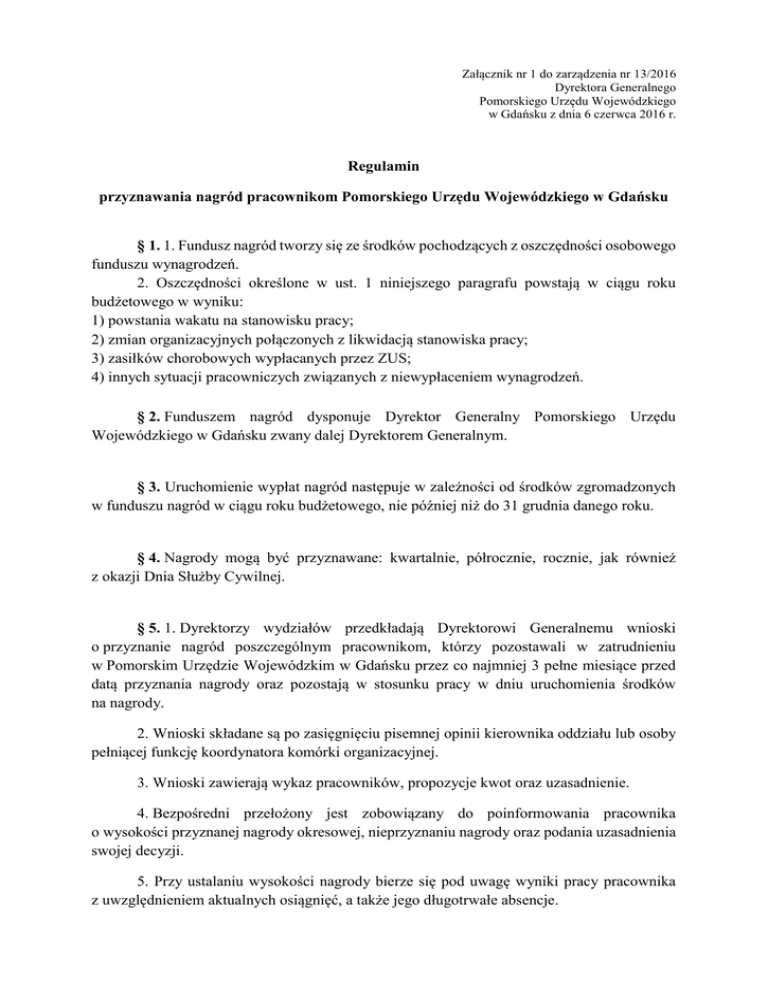Załącznik nr 1 do zarządzenia nr 13/2016 Dyrektora Generalnego Pomorskiego Urzędu Wojewódzkiego w Gdańsku z dnia 6 czerwca 2016 r. Regulamin przyznawania nagród pracownikom Pomorskiego Urzędu Wojewódzkiego w Gdańsku § 1. 1. Fundusz nagród tworzy się ze środków pochodzących z oszczędności osobowego funduszu wynagrodzeń. 2. Oszczędności określone w ust. 1 niniejszego paragrafu powstają w ciągu roku budżetowego w wyniku: 1) powstania wakatu na stanowisku pracy; 2) zmian organizacyjnych połączonych z likwidacją stanowiska pracy; 3) zasiłków chorobowych wypłacanych przez ZUS; 4) innych sytuacji pracowniczych związanych z niewypłaceniem wynagrodzeń. § 2. Funduszem nagród dysponuje Dyrektor Generalny Pomorskiego Urzędu Wojewódzkiego w Gdańsku zwany dalej Dyrektorem Generalnym. § 3. Uruchomienie wypłat nagród następuje w zależności od środków zgromadzonych w funduszu nagród w ciągu roku budżetowego, nie później niż do 31 grudnia danego roku. § 4. Nagrody mogą być przyznawane: kwartalnie, półrocznie, rocznie, jak również z okazji Dnia Służby Cywilnej. § 5. 1. Dyrektorzy wydziałów przedkładają Dyrektorowi Generalnemu wnioski o przyznanie nagród poszczególnym pracownikom, którzy pozostawali w zatrudnieniu w Pomorskim Urzędzie Wojewódzkim w Gdańsku przez co najmniej 3 pełne miesiące przed datą przyznania nagrody oraz pozostają w stosunku pracy w dniu uruchomienia środków na nagrody. 2. Wnioski składane są po zasięgnięciu pisemnej opinii kierownika oddziału lub osoby pełniącej funkcję koordynatora komórki organizacyjnej. 3. Wnioski zawierają wykaz pracowników, propozycje kwot oraz uzasadnienie. 4. Bezpośredni przełożony jest zobowiązany do poinformowania pracownika o wysokości przyznanej nagrody okresowej, nieprzyznaniu nagrody oraz podania uzasadnienia swojej decyzji. 5. Przy ustalaniu wysokości nagrody bierze się pod uwagę wyniki pracy pracownika z uwzględnieniem aktualnych osiągnięć, a także jego długotrwałe absencje. § 6. Przed podjęciem decyzji o uruchomieniu wypłat nagród Dyrektor Wydziału Administracyjno-Gospodarczego przedkłada Dyrektorowi Generalnemu szczegółowe rozliczenie posiadanego funduszu nagród oraz uzyskanych oszczędności z osobowego funduszu płac w celu określenia wysokości środków przeznaczonych do rozdysponowania. § 7. Po uzyskaniu rozliczenia, o którym mowa w § 6, na podstawie otrzymanych wniosków lub z własnej inicjatywy Dyrektor Generalny podejmuje decyzję o przyznaniu i wysokości nagród dla poszczególnych pracowników. § 8. 1. Dyrektor Generalny wydziela ze środków przeznaczonych na nagrody, kwoty przeznaczone dla dyrektorów wydziałów i ich zastępców oraz dla pracowników zatrudnionych na stanowiskach równorzędnych. 2. Podziału nagród dla pracowników, o których mowa w ust. 1, dokonuje Wojewoda w porozumieniu z Dyrektorem Generalnym. 3. Wysokość nagrody, o której mowa w ust. 2, nie może być większa niż czterokrotność średniej nagrody. 4. Wojewoda przyznaje nagrodę Dyrektorowi Generalnemu. § 9. Nagroda nie może być przyznana pracownikowi, który w okresie ostatniego roku został ukarany karą upomnienia lub nagany. § 10. Informacja o przyznaniu nagrody udostępniana jest za pośrednictwem systemu Sente eHRM, a także składana do akt osobowych. pracownikowi § 11. Wysokość średniej kwoty nagrody w przeliczeniu na pełen etat udostępnia się do wiadomości pracowników na stronie intranetowej Pomorskiego Urzędu Wojewódzkiego w Gdańsku. § 12. Skargi w sprawach dotyczących przyznawania nagród rozpatruje Dyrektor Generalny. DYREKTOR GENERALNY Krzysztof Maciej Retyk