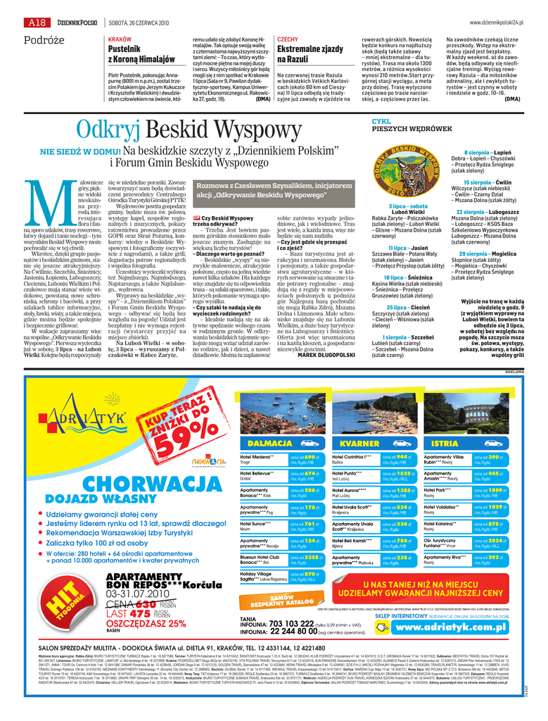 A18 www.dziennikpolski24.pl SOBOTA, 26 CZERWCA 2010 Podróże KRAKÓW Pustelnik z Koroną Himalajów Piotr Pustelnik, pokonując Annapurnę (8091 m n.p.m.), został trzecim Polakiem (po Jerzym Kukuczce i Krzysztofie Wielickim) i dwudziestym człowiekiem na świecie, któ- remu udało się zdobyć Koronę Himalajów. Tak opisuje swoją walkę z czternastoma najwyższymi szczytami ziemi: – To czas, który wytłoczył mocne piętno na mojej duszy i sercu. Wszyscy miłośnicy gór będą mogli się z nim spotkać w Krakowie 1 lipca (Sala nr 9, Pawilon dydaktyczno–sportowy, Kampus Uniwersytetu Ekonomicznego ul. Rakowic(DMA) ka 27, godz. 19). CZECHY Ekstremalne zjazdy na Razuli Na czerwonej trasie Razula w beskidzkich Velkich Karlovicach (około 80 km od Cieszyna) 11 lipca odbędą się tradycyjne już zawody w zjeździe na rowerach górskich. Nowością będzie konkurs na najdłuższy skok (będą także zabawy – mniej ekstremalne – dla turystów). Trasa ma około 1300 metrów, a różnica wysokości wynosi 210 metrów.Start przygórnej stacji wyciągu, a meta przy dolnej. Trasę wytyczono częściowo po trasie narciarskiej, a częściowo przez las. Na zawodników czekają liczne przeszkody. Wstęp na ekstremalny zjazd jest bezpłatny. W każdy weekend, aż do zawodów, będą odbywały się nieoficjalne treningi. Wyciąg rowerowy Razula – dla miłośników adrenaliny, ale i zwykłych turystów – jest czynny w soboty i niedziele w godz. 10–16. (DMA) CYKL PIESZYCH WĘDRÓWEK Odkryj Beskid Wyspowy NIE SIEDŹ W DOMU! Na beskidzkie szczyty z „Dziennikiem Polskim” i Forum Gmin Beskidu Wyspowego M alownicze góry, piękne widoki nieskażona przyroda, interesująca flora i fauna, sporo szlaków, trasy rowerowe, łatwy dojazd i tanie noclegi – tym wszystkim Beskid Wyspowy może pochwalić się w tej chwili. Wkrótce, dzięki grupie pasjonatów i beskidzkim gminom, stanie się jeszcze atrakcyjniejszy. Na Ćwilinie, Szczeblu, Śnieżnicy, Jasieniu, Łopieniu, Lubogoszczy, Ciecieniu, Luboniu Wielkim i Polczakówce mają stanąć wieże widokowe, powstaną nowe schroniska, schrony i bacówki, a przy szlakach tablice informacyjne, stoły, ławki, wiaty, a także miejsca, gdzie można będzie spokojnie i bezpiecznie grillować. W wakacje zapraszamy więc na wspólne „Odkrywanie Beskidu Wyspowego”. Pierwsza wycieczka już w sobotę, 3 lipca – na Luboń Wielki. Kolejne będą rozpoczynały się w niedzielne poranki. Zawsze towarzyszyć nam będą doświadczeni przewodnicy Centralnego Ośrodka Turystyki Górskiej PTTK! Wędrowców powita gospodarz gminy, będzie msza św. polowa, występy kapel, zespołów regionalnych i muzycznych, pokazy ratownictwa prowadzone przez GOPR oraz Straż Pożarną, konkursy: wiedzy o Beskidzie Wyspowym i fotograficzny (oczywiście z nagrodami), a także grill, degustacja potraw regionalnych i wspólna fotografia. Uczestnicy wycieczki wybiorą też Najmilszego, Najmłodszego, Najstarszego, a także Najdalszego... wędrowca. Wyprawy na beskidzkie „wyspy” – z „Dziennikiem Polskim” i Forum Gmin Beskidu Wyspowego – odbywać się będą bez względu na pogodę! Udział jest bezpłatny i nie wymaga rejestracji (wystarczy przyjść na miejsce zbiórki). Na Luboń Wielki – w sobotę, 3 lipca – wyruszamy z Polczakówki w Rabce Zaryte. 8 sierpnia – Łopień Dobra – Łopień – Chyszówki – Przełęcz Rydza Śmigłego (szlak zielony) Rozmowa z Czesławem Szynalikiem, inicjatorem akcji „Odkrywanie Beskidu Wyspowego” Czy Beskid Wyspowy trzeba odkrywać? – Trzeba. Jest bowiem pasmem górskim stosunkowo mało jeszcze znanym. Zasługuje na większą liczbę turystów! – Dlaczego warto go poznać? – Beskidzkie „wyspy” są niezwykle malownicze, atrakcyjnie położone, często na jedną wiedzie nawet kilka szlaków. Dla każdego więc znajdzie się tu odpowiednia trasa – są szlaki spacerowe, i takie, których pokonanie wymaga sporego wysiłku. – Czy szlaki te nadają się do wycieczek rodzinnych? – Idealnie nadają się na aktywne spędzanie wolnego czasu w rodzinnym gronie. W odkrywaniu beskidzkich tajemnic spokojnie mogą wziąć udział zarówno rodzice, jak i dzieci, a nawet dziadkowie. Można tu zaplanować DP sobie zarówno wypady jednodniowe, jak i wielodniowe. Tras jest wiele, a każda inna, więc nie będzie się nam nudziło. – Czy jest gdzie się przespać i co zjeść? – Baza turystyczna jest atrakcyjna i urozmaicona. Hotele i pensjonaty, a także gospodarstwa agroturystyczne – w których serwowane są smaczne i tanie potrawy regionalne – znajdują się z reguły w miejscowościach położonych u podnóża gór. Najlepszą bazą pochwalić się mogą Rabka Zdrój, Mszana Dolna i Limanowa. Małe schronisko znajduje się na Luboniu Wielkim, a duże bazy turystyczne na Lubogoszczy i Śnieżnicy. Oferta jest więc urozmaicona i na każdą kieszeń, a gospodarze niezwykle gościnni. MAREK DŁUGOPOLSKI 3 lipca – sobota Luboń Wielki Rabka Zaryte – Polczakówka (szlak zielony) – Luboń Wielki – Glisne – Mszana Dolna (szlak czerwony) 11 lipca – Jasień Szczawa Białe – Polana Wały (szlak zielony) – Jasień – Przełęcz Przysłop (szlak żółty) 18 lipca – Śnieżnica Kasina Wielka (szlak niebieski) – Śnieżnica – Przełęcz Gruszowiec (szlak zielony) 15 sierpnia – Ćwilin Wilczyce (szlak niebieski) – Ćwilin – Czarny Dział – Mszana Dolna (szlak żółty) 22 sierpnia – Lubogoszcz Mszana Dolna (szlak zielony) – Lubogoszcz – KSOS Baza Szkoleniowo Wypoczynkowa Lubogoszcz – Mszana Dolna (szlak czerwony) 29 sierpnia – Mogielica Słopnice (szlak żółty) – Mogielica – Chyszówki – Przełęcz Rydza Śmigłego (szlak zielony) 25 lipca – Ciecień Szczyrzyc (szlak zielony) – Ciecień – Wiśniowa (szlak zielony) 1 sierpnia – Szczebel Lubień (szlak czarny) – Szczebel – Mszana Dolna (szlak czarny) Wyjście na trasę w każdą niedzielę o godz. 9 (z wyjątkiem wypraw