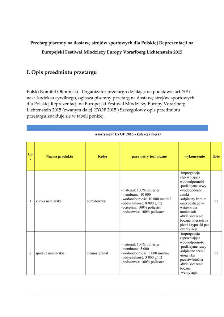 Przetarg pisemny na dostawę strojów sportowych dla Polskiej Reprezentacji na Europejski Festiwal Młodzieży Europy Vorarlberg Lichtenstein 2015 I. Opis przedmiotu przetargu Polski Komitet Olimpijski - Organizator przetargu działając na podstawie art. 701 i nast. kodeksu cywilnego, ogłasza pisemny przetarg na dostawę strojów sportowych dla Polskiej Reprezentacji na Europejski Festiwal Młodzieży Europy Vorarlberg Lichtenstein 2015 (zwanym dalej EYOF 2015 ) Szczegółowy opis przedmiotu przetargu znajduje się w tabeli poniżej. Asortyment EYOF 2015 - kolekcja męska Lp . 1 2 Nazwa produktu kurtka narciarska spodnie narciarskie Kolor parametry techniczne pomidorowy -materiał: 100% poliester -membrana: 10 000 -wodoodporność: 10 000 mm/m2 -oddychalność: 8 000 g/m2 -ocieplina: 100% poliester -podszewka: 100% poliester ciemny granat -materiał: 100% poliester -membrana: 5 000 -wodoodporność: 5 000 mm/m2 -oddychalność: 3 000 g/m2 -podszewka: 100% poliester wykończenie -impregnacja zapewniająca wodoodporność -podklejane szwy -wodoopdorne zamki -odpinany kaptur -antypoślizgowe wstawki na ramionach -dwie kieszenie boczne, kieszeń na piersi i typu ski pas -wentylacja -impregnacja zapewniająca wodoodporność -podklejane szwy -odpinane szelki -nogawka przeciwśnieżna -dwie kieszenie boczne -wentylacja ____________________________________________________________________________________________________ ilość 51 51 3 4 polar spodnie trekkingowe niebieski -materiał: 100% poliester polar -gramatura: 200 gsm -dwie kieszenie boczne -zapinany na zamek -mikropolar czarny -materiał: 95% poliester, 5% elastan -membrana: 3 000 -wodoodporność: 3 000 mm/m2 -oddychalność: 2 000 g/m2 -gramatura: 310 gsm -impregnacja zapewniająca wodoodporność -dwie kieszenie boczne -zintegrowany kaptur -materiał: 60% poliester, 40% -zapinana na bawełna zamek -dwie zewnętrzne kieszenie boczne -dwie kieszenie -materiał: 60% poliester, 40% boczne bawełna -ściągacz u dołu nogawki -wykończenie zapewniające odpowiednią -materiał: 100% poliester wentylacje i -gramatura: 120 gsm utzymanie suchej powierzchni skóry -bezszwowe wykończenie -mikropolar -materiał:90% poliester, 10% elastan -kieszeń boczna na -gramatura: 220gsm piersi 51 51 5 bluza dresowa szary 6 spodnie dresowe szary 7 bielizna termiczna (koszula z długim rękawem+ getry) czarny 8 męska koszula funkcyjna z długim rękawem turkusowy 9 męska koszula bawełniana z długim rękawem jasny melanż -materiał: 100% bawełna -gramatura: 180 gsm 10 koszulka polo biały -materiał: 100% bawełna 11 koszulka polo biały -materiał: 100% bawełna 12 t-shirt bawełniany biały -materiał: 100% bawełna -gramatura: 180 gsm -brak nadruku 51 13 t-shirt bawełniany niebieski -materiał: 100% bawełna -gramatura: 180 gsm -brak nadruku 51 czarny -cholewka: 100% poliester softshell, 100% poliuretan -podeszwa: 100% phylon, 100% guma -membrana zapewniająca ochronę przed wodą, jednocześnie zapewniająca oddychalność -lekka konstrukcja -wkładka dostosowująca się do kształtu stopy 51 turkusowy -materiał: 100% Duralon -pojemność: 30 litrów -rozmiar: 50x30x20 cm -waga: 620 g -system wentylacji pleców -pas piersiowy -pas biodrowy -pasy kompresyjne -boczne kieszenie siatkowe -organizer 51 14 buty trekkingowe 15 plecak -brak nadruku -zapinana pod szyją na 3 guziki -zapinana pod szyją na 3 guziki ____________________________________________________________________________________________________ 51 51 51 51 51 51 51 niebiesko pomarańczowy 16 czapka 17 chusta/szalik multikolor 18 rękawiczki narciarskie niebieski 19 skarpety grube biały 20 skarpety grube czarny 21 skarpety grube czarny -materiał: 100% akryl -podszewka: 100% poliester (polar) 51 -otwór wentylacyjny -materiał: 100% poliester -możliwość -wewnętrzny polar wykorzystania jako szalik, opaska, maska -materiał zewnętrzny: 100% -ściągacz rekawicy poliester, 100% poliuretan ze stoperem -podszewka: 100% poliester (trykot) -rękaw -ocieplina: cienki materiał wewnętrzny ocieplający -spinacz do -membrana zapewniająca ochronę łączenia rękawic przed wiatrem i wilgocią, -pasek do regulacji jednocześnie odprowadzająca pot na szerokości w zewnątrz nadgarstku -materiał: 50% poliester, 45% polipropylen, 5% elastan -bezuciskowy -włókna zapewniające odpowiednią ściągacz wentylacje i utrzymujące suchą -ściągacz na powierzchnię skóry śródstopiu -jony srebra -materiał: 50% poliester, 45% polipropylen, 5% elastan -bezuciskowy -włókna zapewniające odpowiednią ściągacz wentylacje i utrzymujące suchą -ściągacz na powierzchnię skóry śródstopiu -jony srebra -materiał: 50% poliester, 45% polipropylen, 5% elastan -bezuciskowy -włókna zapewniające odpowiednią ściągacz wentylacje i utrzymujące suchą -ściągacz na powierzchnię skóry śródstopiu -jony srebra 22 okulary przeciwsłoneczne czarny -materiał oprawy: poliwęglan -materiał soczewki: poliwęglan -kolor soczewki: złoty/zielony -powłoka: revo -kategoria filtra:3 -filtr UV 400 23 klapki czarny -materiał: 100% PVC 51 51 51 51 51 -pokrowiec -elastyczna wymienna taśma 51 -ergonomiczna wyściółka 51 Asortyment EYOF 2015 - kolekcja damska Lp. Nazwa produktu Kolor parametry techniczne wykończenie ____________________________________________________________________________________________________ ilość 1 kurtka narciarska turkusowy -materiał: 100% poliester -membrana: 10 000 -wodoodporność: 10 000 mm/m2 -oddychalność: 8 000 g/m2 -ocieplina: 100% poliester -podszewka: 100% poliester 2 spodnie narciarskie ciemny granat -materiał: 90% poliester, 10% elastan -membrana: 10 000 -wodoodporność: 10 000 mm/m2 -oddychalność: 8 000 g/m2 3 polar turkusowy -materiał: 100% poliester polar -gramatura: 240 gsm czarny -materiał: 85% poliester, 15% elastan -membrana: 3 000 -wodoodporność: 3 000 mm/m2 -oddychalność: 2 000 g/m2 -gramatura: 310 gsm 4 spodnie trekkingowe -impregnacja za