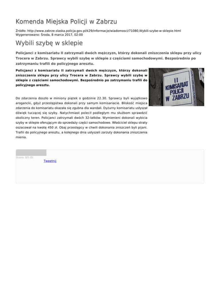 Komenda Miejska Policji w Zabrzu Źródło: http://www.zabrze.slaska.policja.gov.pl/k29/informacje/wiadomosci/71080,Wybili-szybe-w-sklepie.html Wygenerowano: Środa, 8 marca 2017, 02:00 Wybili szybę w sklepie Policjanci z komisariatu II zatrzymali dwóch mężczyzn, którzy dokonali zniszczenia sklepu przy ulicy Trocera w Zabrzu. Sprawcy wybili szybę w sklepie z częściami samochodowymi. Bezpośrednio po zatrzymaniu trafili do policyjnego aresztu. Policjanci z komisariatu II zatrzymali dwóch mężczyzn, którzy dokonali zniszczenia sklepu przy ulicy Trocera w Zabrzu. Sprawcy wybili szybę w sklepie z częściami samochodowymi. Bezpośrednio po zatrzymaniu trafili do policyjnego aresztu. Do zdarzenia doszło w miniony piątek o godzinie 22.30. Sprawcy byli wyjątkowo arogancki, gdyż przestępstwa dokonali przy samym komisariacie. Bliskość miejsca zdarzenia do komisariatu okazała się zgubna dla wandali. Dyżurny komisariatu usłyszał dźwięk tuczącej się szyby. Natychmiast polecił podległym mu służbom sprawdzić okoliczny teren. Policjanci zatrzymali dwóch 32-latków. Wymienieni dokonali wybicia szyby w sklepie oferującym do sprzedaży części samochodowe. Właściciel sklepu straty oszacował na kwotę 450 zł. Obaj przestępcy w chwili dokonania zniszczeń byli pijani. Trafili do policyjnego aresztu, a kolejnego dnia usłyszeli zarzuty dokonania zniszczenia mienia. Ocena: 0/5 (0) Tweetnij
