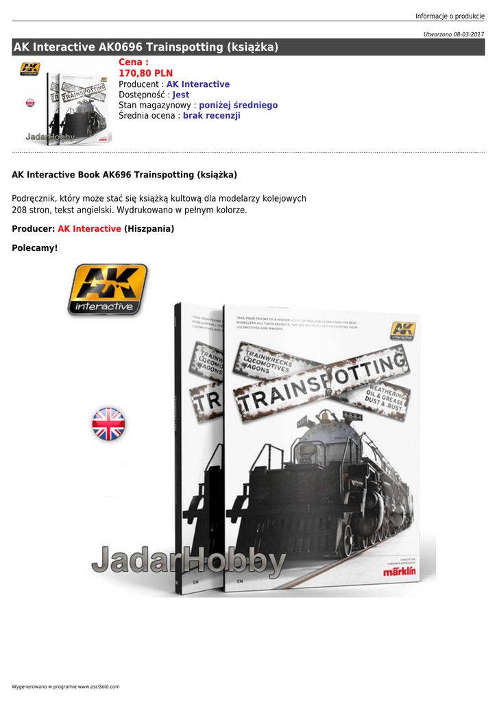 Informacje o produkcie Utworzono 08-03-2017 AK Interactive AK0696 Trainspotting (książka) Cena : 170,80 PLN Producent : AK Interactive Dostępność : Jest Stan magazynowy : poniżej średniego Średnia ocena : brak recenzji AK Interactive Book AK696 Trainspotting (książka) Podręcznik, który może stać się książką kultową dla modelarzy kolejowych 208 stron, tekst angielski. Wydrukowano w pełnym kolorze. Producer: AK Interactive (Hiszpania) Polecamy! Wygenerowano w programie www.oscGold.com Informacje o produkcie Wygenerowano w programie www.oscGold.com