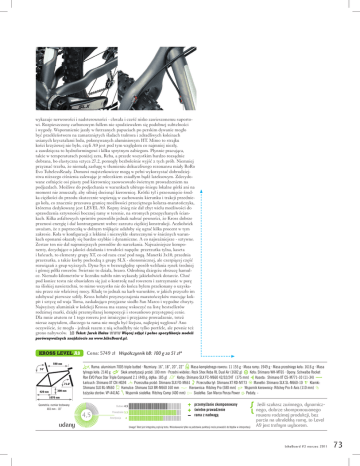 wykazuje nerwowości i nadsterowności - chwała i cześć nisko zawieszonemu suportowi. Rozpieszczony carbonowym fullem nie spodziewałem się podobnej subtelności i wygody. Wspomnienie jazdy w futrzanych papuciach po perskim dywanie mogło być przekleństwem na zamarzniętych śladach traktora i zdradliwych koleinach usianych kryształami lodu, pokonywanych aluminiowym HT. Mimo to strajku kości krzyżowej nie było, czyli A9 jest pod tym względem co najmniej niezły, a zawdzięcza to hydroformingowi i kilku sprytnym zabiegom. Płynnie pracująca, także w temperaturach poniżej zera, Reba, a przede wszystkim bardzo rozsądnie dobrana, bo elastyczna sztyca 27.2, pomogły bezboleśnie wyjść z tych prób. Niemniej przyznać trzeba, że niemałą zasługę w tłumieniu dokuczliwego rezonansu miały RoRo Evo TubelessReady. Domowi majsterkowicze mogą w pełni wykorzystać dobrodziejstwa niższego ciśnienia zalewając je mleczkiem zsiadłym bądź lateksowym. Zdecydowane cofnięcie osi piasty pod kierownicę zaowocowało świetnym prowadzeniem na podjazdach. Możliwe do podjechania w warunkach ubitego śniegu lokalne górki ani na moment nie zmuszały, aby silniej docisnąć kierownicę. Krótki tył i przesunięcie środka ciężkości do przodu skutecznie wspierają w zachowaniu kierunku i trakcji przedniego koła, co znacznie przesuwa granicę możliwości przeciętnego kolarza-maratończyka, któremu dedykowany jest LEVEL A9. Kopny śnieg nie dał zbyt wielu możliwości do sprawdzenia sztywności bocznej ramy w terenie, na stromych przepychanych ściankach. Kilka asfaltowych sprintów pozwoliło jednak nabrać pewności, że Kross dobrze przenosi energię i dać kontrargument wobec zarzutu ciężkiej konstrukcji. Aczkolwiek uważam, że z poprzeczką w dolnym trójkącie udałoby się ugrać kilka procent w tym zakresie. Koła w konfiguracji z lekkimi i niezwykle skutecznymi w śnieżnych warunkach oponami okazały się bardzo szybkie i dynamiczne. A co najważniejsze - sztywne. Zestaw ten nie dał najmniejszych powodów do narzekania. Najważniejsze komponenty, decydujące o jakości działania i trwałości napędu: przerzutka tylna, kaseta i łańcuch, to elementy grupy XT, co od razu czuć pod nogą. Manetki 3x10, przednia przerzutka, a także korby pochodzą z grupy SLX - ekonomicznej, ale czerpiącej część rozwiązań z grup wyższych. Dyna-Sys w bezwzględny sposób wchłania rynek średniej i górnej półki rowerów. Świetnie to działa, brawo. Odrobiną dziegciu obrzucę hamulce. Niemało kilometrów w liczniku nabiło nim wykazały jakiekolwiek dotarcie. Choć pod koniec testu nie obawiałem się już o kontrolę nad rowerem i zatrzymanie w porę na śliskiej nawierzchni, to mimo wszystko nie do końca byłem przekonany o uzyskaniu przez nie właściwej mocy. Kładę to jednak na karb warunków, w jakich przyszło im zdobywać pierwsze szlify. Kross hołubi przyzwyczajenia maratończyków mocując kokpit i sztycę od wuja Toma, zaskakująco przyjazne siodło San Marco i wygodne chwyty. Najwyższy aluminiak w kolekcji Krossa ma szansę wskoczyć na listę bestsellerów rodzimej marki, dzięki przemyślanej kompozycji i stosunkowo przystępnej cenie. Dla mnie atutem nr 1 tego roweru jest intuicyjne i przyjazne prowadzenie, toteż nieraz zapytałem, dlaczego ta rama nie mogła być lżejsza, najlepiej węglowa? Ano oczywiście, że mogła - jednak razem z nią schudłyby nie tylko portfele, ale pewnie też grono nabywców. Tekst: Jarek Hałas Więcej zdjęć i pełne specyfikacje modeli porównywalnych znajdziecie na www.bikeBoard.pl. KROSS LEVEL A9 590 mm 74° 71.6° 420 mm 300 mm Cena: 5749 zł Współczynnik bB: 100 g za 51 zł* Rama: aluminium 7005 triple butted · Rozmiary: 16”, 18”, 20”, 22” Masa kompletnego roweru: 11 155 g · Masa ramy: 1949 g · Masa przedniego koła: 1616 g · Masa Skok amortyzacji przód: 100 mm · Przedni widelec: Rock Shox Reba RL Dual Air (1682 g) Koła: Shimano WH-MT65 · Opony: Schwalbe Rocket tylnego koła: 2140 g Ron EVO Pace Star Triple Compound 2.1 (440 g, dętka: 185 g) Korby: Shimano SLX FC-M660 42/32/24T (175 mm) Kaseta: Shimano XT CS-M771-10 (11-34) Łańcuch: Shimano XT CN-HG94 Przerzutka przód: Shimano SLX FD-M661 Przerzutka tył: Shimano XT RD-M773 Manetki: Shimano SLX SL-M660-10 Klamki: Hamulce: Shimano SLX BR-M660 160 mm Kierownica: Ritchey Pro (580 mm) Wspornik kierownicy: Ritchey Pro 4-Axis (110 mm) Shimano SLX BL-M660 Łożyska sterów: VP-A41AC Wspornik siodełka: Ritchey Comp (400 mm) Siodełko: San Marco Ponza Power Pedały: - 1070 mm Geometria: rozmiar testowany: 465 mm - 18” Budowa 4,5 4,5 udany Prowadzenie 5,5 Amortyzacja 4 przemyślanie skomponowany świetne prowadzenie rama z nadwagą Uwaga! Tekst jest integralną częścią testu. Wnioskowanie tylko na podstawie punktacji może prowadzić do błędów w interpretacji Jeśli szukasz zwinnego, dynamicznego, dobrze skomponowanego roweru rodzimej produkcji, bez parcia na ultralekką ramę, to Level A9 jest trafnym wyborem. b i keB o a r d # 3 ma r zec 2 011 73