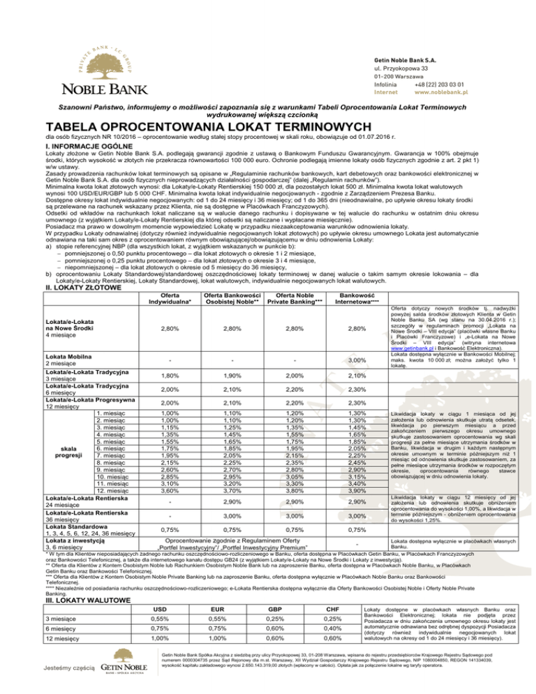 Szanowni Państwo, informujemy o możliwości zapoznania się z warunkami Tabeli Oprocentowania Lokat Terminowych wydrukowanej większą czcionką TABELA OPROCENTOWANIA LOKAT TERMINOWYCH dla osób fizycznych NR 10/2016 – oprocentowanie według stałej stopy procentowej w skali roku, obowiązuje od 01.07.2016 r. I. INFORMACJE OGÓLNE Lokaty złożone w Getin Noble Bank S.A. podlegają gwarancji zgodnie z ustawą o Bankowym Funduszu Gwarancyjnym. Gwarancja w 100% obejmuje środki, których wysokość w złotych nie przekracza równowartości 100 000 euro. Ochronie podlegają imienne lokaty osób fizycznych zgodnie z art. 2 pkt 1) w/w ustawy. Zasady prowadzenia rachunków lokat terminowych są opisane w „Regulaminie rachunków bankowych, kart debetowych oraz bankowości elektronicznej w Getin Noble Bank S.A. dla osób fizycznych nieprowadzących działalności gospodarczej” (dalej „Regulamin rachunków”). Minimalna kwota lokat złotowych wynosi: dla Lokaty/e-Lokaty Rentierskiej 150 000 zł, dla pozostałych lokat 500 zł. Minimalna kwota lokat walutowych wynosi 100 USD/EUR/GBP lub 5 000 CHF. Minimalna kwota lokat indywidualnie negocjowanych - zgodnie z Zarządzeniem Prezesa Banku. Dostępne okresy lokat indywidualnie negocjowanych: od 1 do 24 miesięcy i 36 miesięcy; od 1 do 365 dni (nieodnawialne, po upływie okresu lokaty środki są przelewane na rachunek wskazany przez Klienta, nie są dostępne w Placówkach Franczyzowych). Odsetki od wkładów na rachunkach lokat naliczane są w walucie danego rachunku i dopisywane w tej walucie do rachunku w ostatnim dniu okresu umownego (z wyjątkiem Lokaty/e-Lokaty Rentierskiej dla której odsetki są naliczane i wypłacane miesięcznie). Posiadacz ma prawo w dowolnym momencie wypowiedzieć Lokatę w przypadku niezaakceptowania warunków odnowienia lokaty. W przypadku Lokaty odnawialnej (dotyczy również indywidualnie negocjowanych lokat złotowych) po upływie okresu umownego Lokata jest automatycznie odnawiana na taki sam okres z oprocentowaniem równym obowiązującej/obowiązującemu w dniu odnowienia Lokaty: a) stopie referencyjnej NBP (dla wszystkich lokat, z wyjątkiem wskazanych w punkcie b): − pomniejszonej o 0,50 punktu procentowego – dla lokat złotowych o okresie 1 i 2 miesiące, − pomniejszonej o 0,25 punktu procentowego – dla lokat złotowych o okresie 3 i 4 miesiące, − niepomniejszonej – dla lokat złotowych o okresie od 5 miesięcy do 36 miesięcy, b) oprocentowaniu Lokaty Standardowej/standardowej oszczędnościowej lokaty terminowej w danej walucie o takim samym okresie lokowania – dla Lokaty/e-Lokaty Rentierskiej, Lokaty Standardowej, lokat walutowych, indywidualnie negocjowanych lokat walutowych. II. LOKATY ZŁOTOWE Oferta Indywidualna* Oferta Bankowości Osobistej Noble** Oferta Noble Private Banking*** Bankowość Internetowa**** Lokata/e-Lokata na Nowe Środki 4 miesiące 2,80% 2,80% 2,80% 2,80% Lokata Mobilna 2 miesiące - - - 3,00% 1,80% 1,90% 2,00% 2,10% 2,00% 2,10% 2,20% 2,30% 2,00% 2,10% 2,20% 2,30% 1,00% 1,00% 1,15% 1,35% 1,55% 1,75% 1,95% 2,15% 2,60% 2,85% 3,10% 3,60% 1,10% 1,10% 1,25% 1,45% 1,65% 1,85% 2,05% 2,25% 2,70% 2,95% 3,20% 3,70% 1,20% 1,20% 1,35% 1,55% 1,75% 1,95% 2,15% 2,35% 2,80% 3,05% 3,30% 3,80% 1,30% 1,30% 1,45% 1,65% 1,85% 2,05% 2,25% 2,45% 2,90% 3,15% 3,40% 3,90% - 2,90% 2,90% 2,90% - 3,00% 3,00% 3,00% 0,75% 0,75% 0,75% 0,75% Lokata/e-Lokata Tradycyjna 3 miesiące Lokata/e-Lokata Tradycyjna 6 miesięcy Lokata/e-Lokata Progresywna 12 miesięcy 1. miesiąc 2. miesiąc 3. miesiąc 4. miesiąc 5. miesiąc 6. miesiąc skala progresji 7. miesiąc 8. miesiąc 9. miesiąc 10. miesiąc 11. miesiąc 12. miesiąc Lokata/e-Lokata Rentierska 24 miesiące Lokata/e-Lokata Rentierska 36 miesięcy Lokata Standardowa 1, 3, 4, 5, 6, 12, 24, 36 miesięcy Lokata z inwestycją 3, 6 miesięcy Oprocentowanie zgodnie z Regulaminem Oferty „Portfel Inwestycyjny”/ „Portfel Inwestycyjny Premium” Oferta dotyczy nowych środków tj. nadwyżki powyżej salda środków złotowych Klienta w Getin Noble Banku SA (wg stanu na 30.04.2016 r.); szczegóły w regulaminach promocji „Lokata na Nowe Środki – VIII edycja” (placówki własne Banku i Placówki Franczyzowe) i „e-Lokata na Nowe Środki – VIII edycja” (witryna internetowa www.getinbank.pl i Bankowość Elektroniczna). Lokata dostępna wyłącznie w Bankowości Mobilnej; maks. kwota 10 000 zł; można założyć tylko 1 lokatę. Likwidacja lokaty w ciągu 1 miesiąca od jej założenia lub odnowienia skutkuje utratą odsetek, likwidacja po pierwszym miesiącu a przed zakończeniem pierwszego okresu umownego skutkuje zastosowaniem oprocentowania wg skali progresji za pełne miesiące utrzymania środków w Banku, likwidacja w drugim i każdym następnym okresie umownym w terminie późniejszym niż 1 miesiąc od odnowienia skutkuje zastosowaniem, za pełne miesiące utrzymania środków w rozpoczętym okresie, oprocentowania równego stawce obowiązującej w dniu odnowienia lokaty. Likwidacja lokaty w ciągu 12 miesięcy od jej założenia lub odnowienia skutkuje obniżeniem oprocentowania do wysokości 1,00%, a likwidacja w terminie późniejszym - obniżeniem oprocentowania do wysokości 1,25%. Lokata dostępna wyłącznie w placówkach własnych Banku. * W tym dla Klientów nieposiadających żadnego rachunku oszczędnościowo-rozliczeniowego w Banku, oferta dostępna w Placówkach Getin Banku, w Placówkach Franczyzowych oraz Bankowości Telefonicznej, a także dla internetowego kanału dostępu GB24 (z wyjątkiem Lokaty/e-Lokaty na Nowe Środki i Lokaty z inwestycją). ** Oferta dla Klientów z Kontem Osobistym Noble lub Rachunkiem Osobistym Noble Bank lub na zaproszenie Banku, oferta dostępna w Placówkach Noble Banku, w Placówkach Getin Banku oraz Bankowości Telefonicznej. *** Oferta dla Klientów z Kontem Osobistym Noble Private Banking lub na zaproszenie Banku, oferta dostępna wyłącznie w Placówkach Noble Banku oraz Bankow
