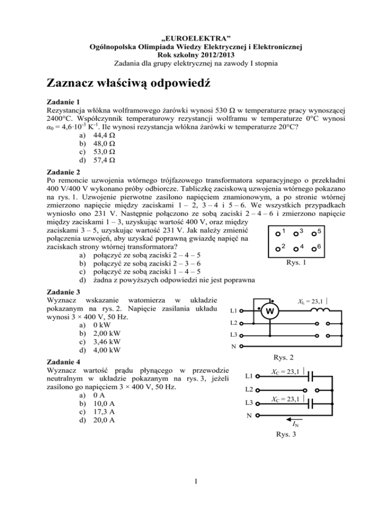 „EUROELEKTRA” Ogólnopolska Olimpiada Wiedzy Elektrycznej i Elektronicznej Rok szkolny 2012/2013 Zadania dla grupy elektrycznej na zawody I stopnia Zaznacz właściwą odpowiedź Zadanie 1 Rezystancja włókna wolframowego żarówki wynosi 530 Ω w temperaturze pracy wynoszącej 2400°C. Współczynnik temperaturowy rezystancji wolframu w temperaturze 0°C wynosi α0 = 4,6·10-3 K-1. Ile wynosi rezystancja włókna żarówki w temperaturze 20°C? a) 44,4 Ω b) 48,0 Ω c) 53,0 Ω d) 57,4 Ω Zadanie 2 Po remoncie uzwojenia wtórnego trójfazowego transformatora separacyjnego o przekładni 400 V/400 V wykonano próby odbiorcze. Tabliczkę zaciskową uzwojenia wtórnego pokazano na rys. 1. Uzwojenie pierwotne zasilono napięciem znamionowym, a po stronie wtórnej zmierzono napięcie między zaciskami 1 – 2, 3 – 4 i 5 – 6. We wszystkich przypadkach wyniosło ono 231 V. Następnie połączono ze sobą zaciski 2 – 4 – 6 i zmierzono napięcie między zaciskami 1 – 3, uzyskując wartość 400 V, oraz między zaciskami 3 – 5, uzyskując wartość 231 V. Jak należy zmienić 1 3 5 połączenia uzwojeń, aby uzyskać poprawną gwiazdę napięć na 2 4 6 zaciskach strony wtórnej transformatora? a) połączyć ze sobą zaciski 2 – 4 – 5 Rys. 1 b) połączyć ze sobą zaciski 2 – 3 – 6 c) połączyć ze sobą zaciski 1 – 4 – 5 d) żadna z powyższych odpowiedzi nie jest poprawna Zadanie 3 Wyznacz wskazanie watomierza w układzie pokazanym na rys. 2. Napięcie zasilania układu wynosi 3 × 400 V, 50 Hz. a) 0 kW b) 2,00 kW c) 3,46 kW d) 4,00 kW Zadanie 4 Wyznacz wartość prądu płynącego w przewodzie neutralnym w układzie pokazanym na rys. 3, jeżeli zasilono go napięciem 3 × 400 V, 50 Hz. a) 0 A b) 10,0 A c) 17,3 A d) 20,0 A XL = 23,1 Ω W L1 L2 L3 N Rys. 2 L1 XC = 23,1 Ω L2 L3 XC = 23,1 Ω N IN Rys. 3 1 Zadanie 5 Którymi bezpiecznikami topikowymi zabezpiecza się przed skutkami zwarcia elementy IGBT w niskonapięciowych układach energoelektronicznych (do 1 kV), wykorzystujących te tranzystory? a) za pomocą bezpieczników topikowych typu gL b) za pomocą bezpieczników topikowych typu gG c) za pomocą bezpieczników szybkich do zabezpieczania elementów energoelektronicznych typu Btp +U d) żadna z powyższych odpowiedzi nie jest poprawna R Zadanie 6 Jaką funkcję logiczną realizuje układ pokazany na rys. 4? a) AND b) NAND c) NOR d) OR Zadanie 7 Dwa transformatory jednofazowe o przekładni 400 V/100 V przyłączono do sieci trójfazowej 3 × 400 V w sposób pokazany na rys. 5. Wyznacz wskazanie idealnego woltomierza elektromagnetycznego. a) 100 V b) 150 V c) 173 V d) 200 V Zadanie 8 Wyznacz energię zgromadzoną w indukcyjnościach transformatora powietrznego, którego schemat pokazano na rys. 6. a) 20 Ws b) 100 Ws c) 140 Ws d) 180 Ws D1 we1 D2 we2 wy Rys. 4 L1 L2 L3 V Rys. 5 I1 = 10 A k = 0,80 I2 = 10 A L1 = 1,0 H L2 = 1,0 H Rys. 6 Zadanie 9 Trzy grzałki połączone w gwiazdę bez przewodu neutralnego (rys. 7) przy zasilaniu symetrycznym 3 × 400 V, 50 Hz pobierają z sieci moc B R 3,0 kW. Jaką moc będzie pobierał zespół grzałek po L1 zadziałaniu bezpiecznika w fazie L2? R B L2 a) 1,0 kW R B b) 1,5 kW L3 c) 1,7 kW Rys. 7 d) 2,0 kW Zadanie 10 Prądy w układzie pokazanym na rys. 8 opisane są równaniami: i1 = 2 ·3·sinωt oraz i2 i1 i2 = 2 ·4·cosωt. Jaka moc wydzieli się na rezystorze R = 1,0 Ω? a) 1 W b) 5 W R c) 25 W d) 49 W Rys. 8 2 3 Zadanie 11 Jaka jest wartość natężenia prądu w gałęzi 1 przy przyjętym jak na rys. 9 kierunku tego prądu? a) –4 A b) 4 A c) 10 A d) 16 A 6A I1 1 -2 A 4 2A -1 A Zadanie 12 Wyznacz wartość skuteczną napięcia przemiennego symetrycznego o przebiegu pokazanym na rys. 10. a) 14,2 V b) 14,8 V c) 15,3 V d) 20,9 V 24 22 20 18 16 14 12 10 8 6 4 2 0 -2 -4 -6 -8 -10 -12 2 5A 6 5 Rys. 9 u [V] 0 0.1 0.2 0.3 0.4 0.5 t [s] 0.6 Rys. 10 Zadanie 13 Jednofazowy transformator trakcyjny stosowany sieć w lokomotywach przystosowanych do pracy z dwoma trakcyjna różnymi napięciami przemiennymi sieci trakcyjnej pantograf (rys. 11) ma uzwojenie strony pierwotnej przystosowane do zasilania z sieci trakcyjnych 15 kV, 16 ⅔ Hz oraz 25 kV, 50 Hz (dopasowanie wartości Tr napięcia wtórnego do wymagań układu napędowego odbywa się przez przełączanie zaczepów uzwojenia strony wtórnej). Co można powiedzieć o wartości strumienia magnetycznego w rdzeniu tego szyny transformatora? a) osiąga największą wartość przy Rys. 11 zasilaniu 15 kV, 16 ⅔ Hz b) osiąga największą wartość przy zasilaniu 25 kV, 50 Hz c) przy obu napięciach zasilania strumień magnetyczny ma tę samą wartość d) żadna z powyższych odpowiedzi nie jest poprawna Zadanie 14 Zmierzono prąd pierwszego zwarcia doziemnego urządzenia zainstalowanego w trójfazowej sieci 3 × 400 V typu IT bez przewodu neutralnego (rys. 12). Wyniósł on 55 mA. Ile powinien wynosić znamionowy prąd różnicowy I∆N wyłącznika różnicowoprądowego RCD, który zainstalowano w rozdzielni, blisko transformatora, jeżeli powinien on zadziałać już przy 3 pierwszym zwarciu doziemnym urządzenia. Należy przyjąć, że wymagany czas odłączenia zasilania zapewni prąd pierwszego zwarcia doziemnego równy 5I∆N. Prądy znamionowe wyłączników różnicowoprądowych wynoszą: 0,006 A, 0,01 A, 0,03 A, 0,1 A, 0,3 A i 0,5 A. a) 0,1 A b) 0,3 A c) 0,5 A d) żadna z powyższych odpowiedzi nie jest poprawna RCD odb Rys. 12 Zadanie 15 W układzie pokazanym na rys. 13 przy zasilaniu napięciem U = 20,0 V prąd IC wynosi 10,0 mA. Ile wyniesie prąd IC, jeżeli napięcie U zmniejszy się do 15,0 V. Przyjąć, że prąd IB = const. a) 2,5 mA b) 5,0 mA c) 7,5 mA d) 10,0 mA Zadanie 16 Ile wyniesie napięcie wyjściowe układu pokazanego na rys. 14, jeżeli Uwe = 2,0 V. a) 2,0 V b) 8,0 V c) 10,0 V d) 12,0 V IC RC = 900 Ω IB U RE = 100 Ω Rys. 13 40 Ω 10 Ω 8Ω + Uwy Uwe Rys. 14 Opracował Sprawdził dr inż. Mirosław Miszewski. PESA Bydgoszcz dr inż. Sławomir Cieśli