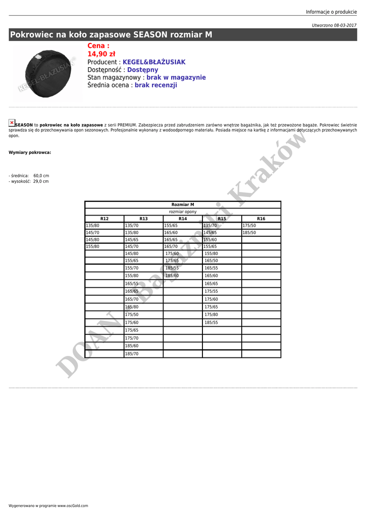 Informacje o produkcie Utworzono 08-03-2017 Pokrowiec na koło zapasowe SEASON rozmiar M Cena : 14,90 zł Producent : KEGEL&BŁAŻUSIAK Dostępność : Dostępny Stan magazynowy : brak w magazynie Średnia ocena : brak recenzji ra kó w SEASON to pokrowiec na koło zapasowe z serii PREMIUM. Zabezpiecza przed zabrudzeniem zarówno wnętrze bagażnika, jak też przewożone bagaże. Pokrowiec świetnie sprawdza się do przechowywania opon sezonowych. Profesjonalnie wykonany z wodoodpornego materiału. Posiada miejsce na kartkę z informacjami dotyczących przechowywanych opon. Wymiary pokrowca: K - średnica: 60,0 cm - wysokość: 29,0 cm Rozmiar M R12 R13 R14 135/70 155/65 145/70 135/80 165/60 145/80 145/65 165/65 155/80 145/70 155/65 D O AN 155/80 Wygenerowano w programie www.oscGold.com 145/65 185/50 155/60 155/65 175/60 155/80 175/65 165/50 185/55 165/55 185/60 165/60 165/55 165/65 165/65 175/55 165/70 175/60 165/80 175/65 175/50 175/80 175/60 185/55 175/65 175/70 185/60 185/70 R16 175/50 165/70 -B ag 155/70 R15 135/70 aż n 135/80 145/80 ik i rozmiar opony