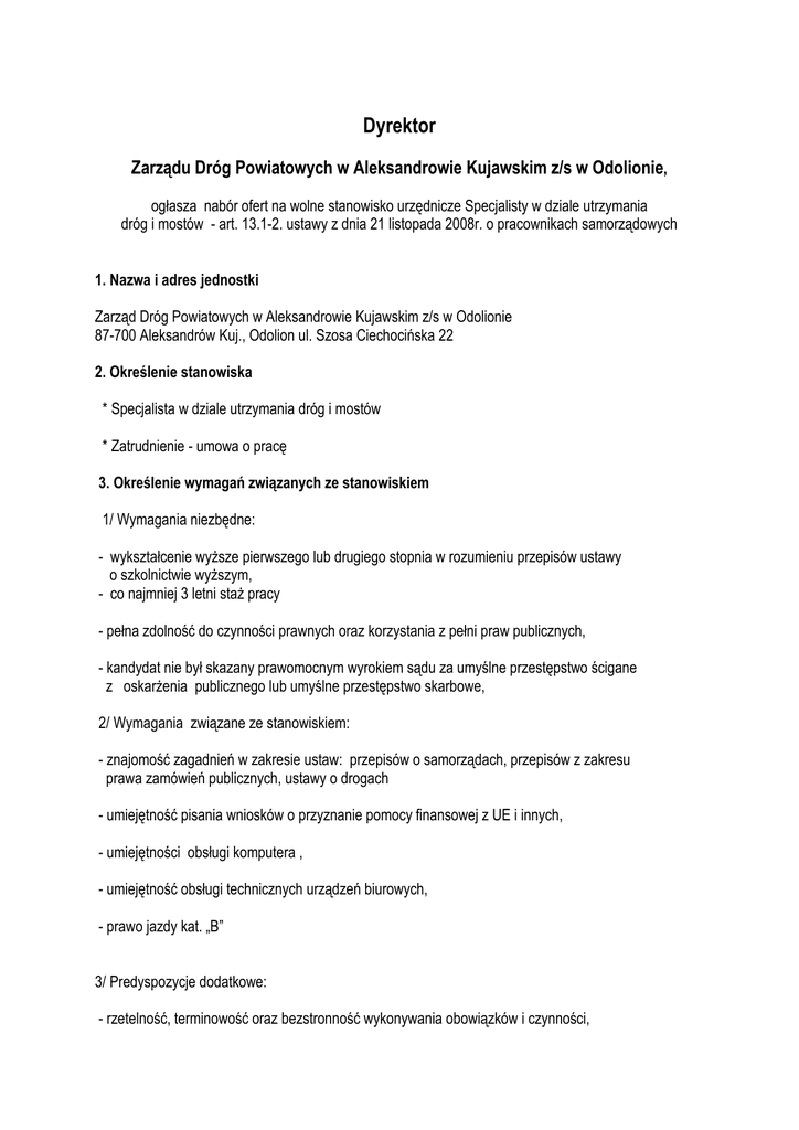 Dyrektor Zarządu Dróg Powiatowych w Aleksandrowie Kujawskim z/s w Odolionie, ogłasza nabór ofert na wolne stanowisko urzędnicze Specjalisty w dziale utrzymania dróg i mostów - art. 13.1-2. ustawy z dnia 21 listopada 2008r. o pracownikach samorządowych 1. Nazwa i adres jednostki Zarząd Dróg Powiatowych w Aleksandrowie Kujawskim z/s w Odolionie 87-700 Aleksandrów Kuj., Odolion ul. Szosa Ciechocińska 22 2. Określenie stanowiska * Specjalista w dziale utrzymania dróg i mostów * Zatrudnienie - umowa o pracę 3. Określenie wymagań związanych ze stanowiskiem 1/ Wymagania niezbędne: - wykształcenie wyŜsze pierwszego lub drugiego stopnia w rozumieniu przepisów ustawy o szkolnictwie wyŜszym, - co najmniej 3 letni staŜ pracy - pełna zdolność do czynności prawnych oraz korzystania z pełni praw publicznych, - kandydat nie był skazany prawomocnym wyrokiem sądu za umyślne przestępstwo ścigane z oskarŜenia publicznego lub umyślne przestępstwo skarbowe, 2/ Wymagania związane ze stanowiskiem: - znajomość zagadnień w zakresie ustaw: przepisów o samorządach, przepisów z zakresu prawa zamówień publicznych, ustawy o drogach - umiejętność pisania wniosków o przyznanie pomocy finansowej z UE i innych, - umiejętności obsługi komputera , - umiejętność obsługi technicznych urządzeń biurowych, - prawo jazdy kat. „B” 3/ Predyspozycje dodatkowe: - rzetelność, terminowość oraz bezstronność wykonywania obowiązków i czynności, - umiejętność zarządzania informacją, - umiejętności pracy w zespole, komunikacji werbalnej i interpersonalnej, kreatywność i dyspozycyjność, - umiejętności analityczne, 4. Zakres zadań wykonywanych na stanowisku - nadzór i opracowywanie bieŜących planów utrzymania i remontów dróg - prowadzenie, gromadzenie i archiwizowanie dokumentacji, - przygotowywanie dokumentacji przetargowej związanej z drogami, - rejestracja i przygotowywanie korespondencji oraz bieŜąca obsługa sekretariatu ZDP, - przygotowywanie dokumentacji analitycznej w zakresie sprawozdań i meldunków bieŜącej działalności w dziale utrzymania dróg i mostów 5. Wymagane dokumenty 1/ Wymagane niezbędne dokumenty - list motywacyjny, - Ŝyciorys kandydata /CV/, - kopie dokumentów potwierdzające wykształcenie, - kopie dokumentów potwierdzających staŜ pracy /świadectwa pracy, zaświadczenia o zatrudnieniu/, - kopie dokumentów potwierdzające dodatkowe kwalifikacje, - oświadczenie kandydata o pełnej zdolności do czynności prawnych oraz korzystania z pełni praw publicznych*, - oświadczenie kandydata, Ŝe nie był skazany prawomocnym wyrokiem sądu za umyślne przestępstwa ścigane z oskarŜenia publicznego lub umyślne przestępstwo skarbowe*, - oświadczenie, Ŝe przeciwko kandydatowi nie toczy się postępowanie karne, dyscyplinarne lub o ubezwłasnowolnienie*, * Oświadczenie zawiera klauzulę -„Jestem świadomy(a) odpowiedzialności karnej za złoŜenie fałszywego oświadczenia” 2/ Wymagane dokumenty aplikacyjne: list motywacyjny i CV, powinny być opatrzone klauzulą: „WyraŜam zgodę na przetwarzanie moich danych osobowych, zawartych w ofercie pracy dla potrzeb niezbędnych rekrutacji na stanowisko urzędnicze pracownika samorządowego, zgodnie z ustawą z dnia 29 sierpnia 1997r. o ochronie danych osobowych /tj.Dz.Uz 2002r.Nr101,poz.926 z późn.zm./ oraz ustawą o pracownikach samorządowych /Dz.U.z 2008r.Nr 223,poz.1458 z późn.zm./”. 6. Termin i miejsce składania dokumentów Komplet dokumentów w zamkniętej kopercie z dopiskiem ”Nabór Ofert–Specjalista ZDP” w terminie do dnia 28 listopada 2011r. godz. 1000 w siedzibie Zarządu Dróg Powiatowych w Aleksandrowie Kujawskim z/s w Odolionie, 87-700 Aleksandrów Kujawski, Odolion ul.Szosa Ciechocińska 22, lub listownie – data wpływu do dnia 28 listopada 2011r. godz. 1000 > Aplikacje, zawierające niekompletne dokumenty lub doręczone po wyznaczonym terminie, nie będą rozpatrywane. > Informacji na temat ogłoszonego naboru udziela: Inspektor ds. księgowo kadrowych w ZDP tel.54/282/2745 > Z osobami, które przejdą do II tury naboru będą przeprowadzone rozmowy kwalifikacyjne, o której kandydaci zostaną powiadomieni telefonicznie. > Informacja o wynikach naboru, będzie niezwłocznie umieszczona w Biuletynie Informacji Publicznej ZDP oraz na tablicy ogłoszeń w siedzibie ZDP. Dyrektor Zarządu Dróg Powiatowych Jacek Kowalewski Odolion, dnia 16 listopada 2011r