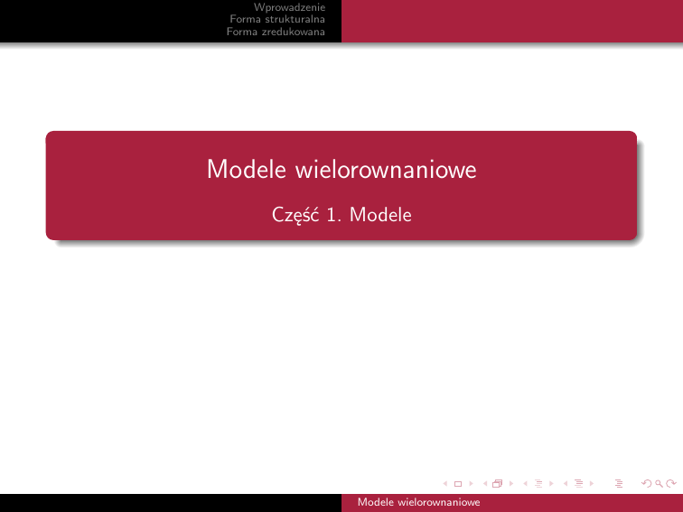 Wprowadzenie Forma strukturalna Forma zredukowana Modele wielorownaniowe Część 1. Modele Modele wielorownaniowe Wprowadzenie Forma strukturalna Forma zredukowana Modele jednorównaniowe są znacznym uproszczeniem rzeczywistości gospodarczej Modele wielorownaniowe Wprowadzenie Forma strukturalna Forma zredukowana Modele jednorównaniowe są znacznym uproszczeniem rzeczywistości gospodarczej Modele makroekonomiczne z reguły składają się z większej liczby równań Modele wielorownaniowe Wprowadzenie Forma strukturalna Forma zredukowana Modele jednorównaniowe są znacznym uproszczeniem rzeczywistości gospodarczej Modele makroekonomiczne z reguły składają się z większej liczby równań Z reguły zmienne w nich występująca są zmiennymi współzależnymi Modele wielorownaniowe Wprowadzenie Forma strukturalna Forma zredukowana Modele jednorównaniowe są znacznym uproszczeniem rzeczywistości gospodarczej Modele makroekonomiczne z reguły składają się z większej liczby równań Z reguły zmienne w nich występująca są zmiennymi współzależnymi Do matematycznego opisu takich modeli wykorzystuje się modele wielorównaniowe o równaniach współzależnych Simultaneous Equation Models Modele wielorownaniowe Wprowadzenie Forma strukturalna Forma zredukowana Model Zmienne endogeniczne o egzogeniczne Model wielorównaniowy w formie strukturalnej opisuje strukturę zależności w gospodarce Modele wielorownaniowe Wprowadzenie Forma strukturalna Forma zredukowana Model Zmienne endogeniczne o egzogeniczne Model wielorównaniowy w formie strukturalnej opisuje strukturę zależności w gospodarce Model o G równaniach zapisujemy w postaci macierzowej AYt = BXt + ut Modele wielorownaniowe Wprowadzenie Forma strukturalna Forma zredukowana Model Zmienne endogeniczne o egzogeniczne Model wielorównaniowy w formie strukturalnej opisuje strukturę zależności w gospodarce Model o G równaniach zapisujemy w postaci macierzowej AYt = BXt + ut gdzie: Yt = [y 1, . . . , yG ] to wektor zmiennych endogenicznych Modele wielorownaniowe Wprowadzenie Forma strukturalna Forma zredukowana Model Zmienne endogeniczne o egzogeniczne Model wielorównaniowy w formie strukturalnej opisuje strukturę zależności w gospodarce Model o G równaniach zapisujemy w postaci macierzowej AYt = BXt + ut gdzie: Yt = [y 1, . . . , yG ] to wektor zmiennych endogenicznych AG ×G oraz BG ×G są nieosobliwe Modele wielorownaniowe Wprowadzenie Forma strukturalna Forma zredukowana Model Zmienne endogeniczne o egzogeniczne Model wielorównaniowy w formie strukturalnej opisuje strukturę zależności w gospodarce Model o G równaniach zapisujemy w postaci macierzowej AYt = BXt + ut gdzie: Yt = [y 1, . . . , yG ] to wektor zmiennych endogenicznych AG ×G oraz BG ×G są nieosobliwe Xt to wektor zmiennych objaśniających nieskorelowanych ze składnikiem losowym u Modele wielorownaniowe Wprowadzenie Forma strukturalna Forma zredukowana Model Zmienne endogeniczne o egzogeniczne Model wielorównaniowy w formie strukturalnej opisuje strukturę zależności w gospodarce Model o G równaniach zapisujemy w postaci macierzowej AYt = BXt + ut gdzie: Yt = [y 1, . . . , yG ] to wektor zmiennych endogenicznych AG ×G oraz BG ×G są nieosobliwe Xt to wektor zmiennych objaśniających nieskorelowanych ze składnikiem losowym u ut = [u1 , . . . , uG ] Modele wielorownaniowe Wprowadzenie Forma strukturalna Forma zredukowana Model Zmienne endogeniczne o egzogeniczne Model wielorównaniowy w formie strukturalnej opisuje strukturę zależności w gospodarce Model o G równaniach zapisujemy w postaci macierzowej AYt = BXt + ut gdzie: Yt = [y 1, . . . , yG ] to wektor zmiennych endogenicznych AG ×G oraz BG ×G są nieosobliwe Xt to wektor zmiennych objaśniających nieskorelowanych ze składnikiem losowym u ut = [u1 , . . . , uG ] E (u) = 0, Var (ut ) = Σ, ∀t 6= s E (ut us ) = 0 Modele wielorownaniowe Wprowadzenie Forma strukturalna Forma zredukowana Model Zmienne endogeniczne o egzogeniczne Zmienne Xt nazywamy zmiennymi z góry ustalonymi. Są nimi zarówno zmienne egzogeniczne, jak również opóźnione wartości zmiennych endogenicznych Modele wielorownaniowe Wprowadzenie Forma strukturalna Forma zredukowana Model Zmienne endogeniczne o egzogeniczne Zmienne Xt nazywamy zmiennymi z góry ustalonymi. Są nimi zarówno zmienne egzogeniczne, jak również opóźnione wartości zmiennych endogenicznych W jednym równaniu może występować więcej niż jedna zmienna endogeniczna Modele wielorownaniowe Wprowadzenie Forma strukturalna Forma zredukowana Model Zmienne endogeniczne o egzogeniczne Zmienne Xt nazywamy zmiennymi z góry ustalonymi. Są nimi zarówno zmienne egzogeniczne, jak również opóźnione wartości zmiennych endogenicznych W jednym równaniu może występować więcej niż jedna zmienna endogeniczna Liczba zmiennych endogenicznych w modelu jest równa liczbie równań G Modele wielorownaniowe Wprowadzenie Forma strukturalna Forma zredukowana Model Zmienne endogeniczne o egzogeniczne Zmienne Xt nazywamy zmiennymi z góry ustalonymi. Są nimi zarówno zmienne egzogeniczne, jak również opóźnione wartości zmiennych endogenicznych W jednym równaniu może występować więcej niż jedna zmienna endogeniczna Liczba zmiennych endogenicznych w modelu jest równa liczbie równań G Przejęto konwencję zapisu modelu według której w każdym równaniu po lewej stronie znajduje się inna zmienna endogeniczna Modele wielorownaniowe Wprowadzenie Forma strukturalna Forma zredukowana Model Zmienne endogeniczne o egzogeniczne Zmienne Xt nazywamy zmiennymi z góry ustalonymi. Są nimi zarówno zmienne egzogeniczne, jak również opóźnione wartości zmiennych endogenicznych W jednym równaniu może występować więcej niż jedna zmienna endogeniczna Liczba zmiennych endogenicznych w modelu jest równa liczbie równań G Przejęto konwencję zapisu modelu według której w każdym równaniu po lewej stronie znajduje się inna zmien