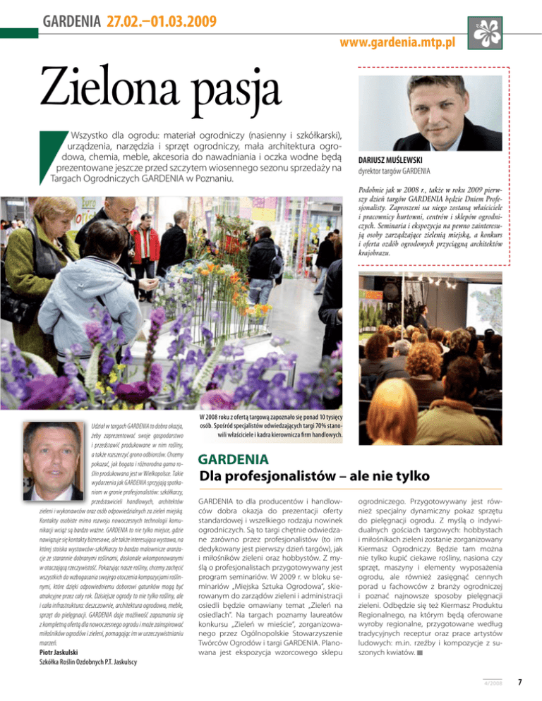 GARDENIA 27.02.–01.03.2009 www.gardenia.mtp.pl Zielona pasja Wszystko dla ogrodu: materiał ogrodniczy (nasienny i szkółkarski), urządzenia, narzędzia i sprzęt ogrodniczy, mała architektura ogrodowa, chemia, meble, akcesoria do nawadniania i oczka wodne będą prezentowane jeszcze przed szczytem wiosennego sezonu sprzedaży na Targach Ogrodniczych GARDENIA w Poznaniu. Dariusz Muślewski dyrektor targów GARDENIA Podobnie jak w 2008 r., także w roku 2009 pierwszy dzień targów GARDENIA będzie Dniem Profesjonalisty. Zaproszeni na niego zostaną właściciele i pracownicy hurtowni, centrów i sklepów ogrodniczych. Seminaria i ekspozycja na pewno zainteresują osoby zarządzające zielenią miejską, a konkurs i oferta ozdób ogrodowych przyciągną architektów krajobrazu. Udział w targach GARDENIA to dobra okazja, żeby zaprezentować swoje gospodarstwo i przedstawić produkowane w nim rośliny, a także rozszerzyć grono odbiorców. Chcemy pokazać, jak bogata i różnorodna gama roślin produkowana jest w Wielkopolsce. Takie wydarzenia jak GARDENIA sprzyjają spotkaniom w gronie profesjonalistów: szkółkarzy, przedstawicieli handlowych, architektów zieleni i wykonawców oraz osób odpowiedzialnych za zieleń miejską. Kontakty osobiste mimo rozwoju nowoczesnych technologii komunikacji wciąż są bardzo ważne. GARDENIA to nie tylko miejsce, gdzie nawiązuje się kontakty biznesowe, ale także interesująca wystawa, na której stoiska wystawców-szkółkarzy to bardzo malownicze aranżacje ze starannie dobranymi roślinami, doskonale wkomponowanymi w otaczającą rzeczywistość. Pokazując nasze rośliny, chcemy zachęcić wszystkich do wzbogacania swojego otoczenia kompozycjami roślinnymi, które dzięki odpowiedniemu doborowi gatunków mogą być atrakcyjne przez cały rok. Dzisiejsze ogrody to nie tylko rośliny, ale i cała infrastruktura: deszczownie, architektura ogrodowa, meble, sprzęt do pielęgnacji. GARDENIA daje możliwość zapoznania się z kompletną ofertą dla nowoczesnego ogrodu i może zainspirować miłośników ogrodów i zieleni, pomagając im w urzeczywistnianiu marzeń. Piotr Jaskulski Szkółka Roślin Ozdobnych P.T. Jaskulscy W 2008 roku z ofertą targową zapoznało się ponad 10 tysięcy osób. Spośród specjalistów odwiedzających targi 70% stanowili właściciele i kadra kierownicza firm handlowych. GARDENIA Dla profesjonalistów – ale nie tylko GARDENIA to dla producentów i handlowców dobra okazja do prezentacji oferty standardowej i wszelkiego rodzaju nowinek ogrodniczych. Są to targi chętnie odwiedzane zarówno przez profesjonalistów (to im dedykowany jest pierwszy dzień targów), jak i miłośników zieleni oraz hobbystów. Z myślą o profesjonalistach przygotowywany jest program seminariów. W 2009 r. w bloku seminariów „Miejska Sztuka Ogrodowa”, skierowanym do zarządów zieleni i administracji osiedli będzie omawiany temat „Zieleń na osiedlach”. Na targach poznamy laureatów konkursu „Zieleń w mieście”, zorganizowanego przez Ogólnopolskie Stowarzyszenie Twórców Ogrodów i targi GARDENIA. Planowana jest ekspozycja wzorcowego sklepu ogrodniczego. Przygotowywany jest również specjalny dynamiczny pokaz sprzętu do pielęgnacji ogrodu. Z myślą o indywidualnych gościach targowych: hobbystach i miłośnikach zieleni zostanie zorganizowany Kiermasz Ogrodniczy. Będzie tam można nie tylko kupić ciekawe rośliny, nasiona czy sprzęt, maszyny i elementy wyposażenia ogrodu, ale również zasięgnąć cennych porad u fachowców z branży ogrodniczej i poznać najnowsze sposoby pielęgnacji zieleni. Odbędzie się też Kiermasz Produktu Regionalnego, na którym będą oferowane wyroby regionalne, przygotowane według tradycyjnych receptur oraz prace artystów ludowych: m.in. rzeźby i kompozycje z suszonych kwiatów. 4/2008 7