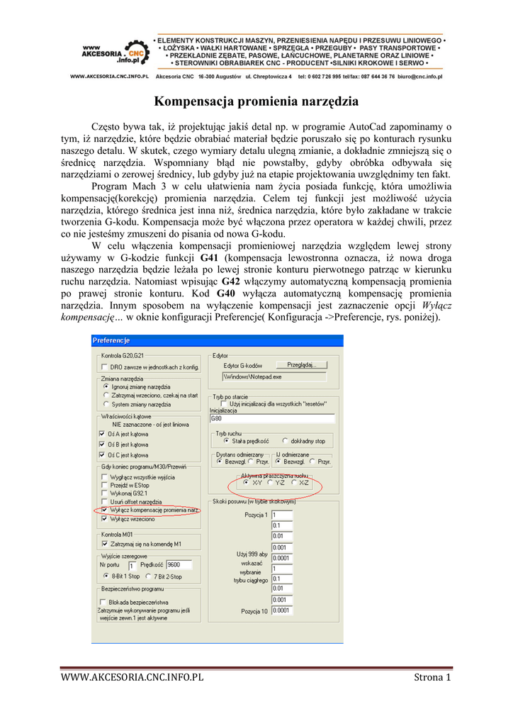 Kompensacja promienia narzędzia Często bywa tak, iż projektując jakiś detal np. w programie AutoCad zapominamy o tym, iż narzędzie, które będzie obrabiać materiał będzie poruszało się po konturach rysunku naszego detalu. W skutek, czego wymiary detalu ulegną zmianie, a dokładnie zmniejszą się o średnicę narzędzia. Wspomniany błąd nie powstałby, gdyby obróbka odbywała się narzędziami o zerowej średnicy, lub gdyby już na etapie projektowania uwzględnimy ten fakt. Program Mach 3 w celu ułatwienia nam życia posiada funkcję, która umożliwia kompensację(korekcję) promienia narzędzia. Celem tej funkcji jest możliwość użycia narzędzia, którego średnica jest inna niż, średnica narzędzia, które było zakładane w trakcie tworzenia G-kodu. Kompensacja może być włączona przez operatora w każdej chwili, przez co nie jesteśmy zmuszeni do pisania od nowa G-kodu. W celu włączenia kompensacji promieniowej narzędzia względem lewej strony używamy w G-kodzie funkcji G41 (kompensacja lewostronna oznacza, iż nowa droga naszego narzędzia będzie leżała po lewej stronie konturu pierwotnego patrząc w kierunku ruchu narzędzia. Natomiast wpisując G42 włączymy automatyczną kompensacją promienia po prawej stronie konturu. Kod G40 wyłącza automatyczną kompensację promienia narzędzia. Innym sposobem na wyłączenie kompensacji jest zaznaczenie opcji Wyłącz kompensację… w oknie konfiguracji Preferencje( Konfiguracja ->Preferencje, rys. poniżej). WWW.AKCESORIA.CNC.INFO.PL Strona 1 Ruch kompensowany jest prosty w programowaniu, newralgicznym momentem jest jednak jego rozpoczęcie i zakończenie. Przejście z ruchu nieskompensowanego na kompensowany i odwrotnie nie może odbywać się nagle, i związane jest ono z tzw. ruchem przejściowym. W uproszczeniu mówiąc, maszyna przed rozpoczęciem pracy musi najpierw ustawić zadaną głębokość pracy narzędzia. Następnie następuje wspomniany ruch przejściowy, który powinien rozpoczynać się od konturu obrabianego detalu, co najmniej o średnicę narzędzia, którym będziemy pracować. Rozpoczynanie pracy powinno rozpoczynać się w miejscu materiału, który będzie traktowany jako odpad. Polecenia, którymi możemy włączyć kompensację mają w swojej składni składnik, który odpowiada za wybór narzędzia, które możemy zdefiniować w oknie Magazyn Narzędzi(Zakładka Konfiguracja ->Magazyn narzędzi), bądź możemy to zrobić bezpośrednio w głównym oknie programu polu dotyczącym Danych Narzędzia. Możemy tam wybrać numer oraz średnicę narzędzia. Składnia polecenia wygląda następująco G41 Dx, gdzie x jest to numer narzędzia. Jeżeli pominiemy składnik Dx, wówczas program użyje narzędzia o numerze ‘0’. Podczas działania automatycznej kompensacji narzędzia mogą wystąpić błędy wówczas, gdy: 1. Płaszczyznę ruchu ustawimy inną niż XY (patrz rysunek wyżej) 2. Będziemy usiłowali przy pomocy komend G41 lub G42 włączyć kompensację w momencie, gdy jest ona już aktywna, 3. Użyty w G-kodzie numer narzędzia nie będzie liczbą całkowitą, będzie to wartość ujemna, lub większa niż liczba dostępnych slotów narzędzi. Wchodząc do zakładki Opcje frezowania w oknie konfiguracji Porty i Piny możemy zaznaczyć opcję Zawansowana analiza kompensacji. Opcja ta włączy bardziej zaawansowane obliczenia, które mają na celu zmniejszenie ryzyka powstania błędu przy bardziej skomplikowanych kształtach obrabianego detalu. WWW.AKCESORIA.CNC.INFO.PL Strona 2