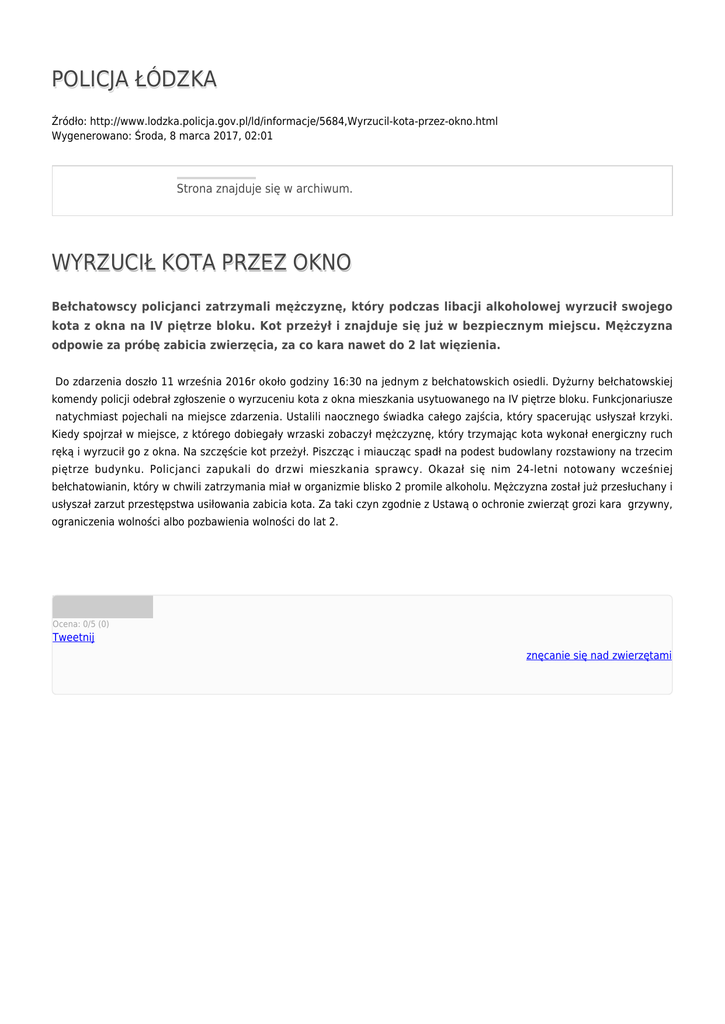 POLICJA ŁÓDZKA Źródło: http://www.lodzka.policja.gov.pl/ld/informacje/5684,Wyrzucil-kota-przez-okno.html Wygenerowano: Środa, 8 marca 2017, 02:01 Strona znajduje się w archiwum. WYRZUCIŁ KOTA PRZEZ OKNO Bełchatowscy policjanci zatrzymali mężczyznę, który podczas libacji alkoholowej wyrzucił swojego kota z okna na IV piętrze bloku. Kot przeżył i znajduje się już w bezpiecznym miejscu. Mężczyzna odpowie za próbę zabicia zwierzęcia, za co kara nawet do 2 lat więzienia. Do zdarzenia doszło 11 września 2016r około godziny 16:30 na jednym z bełchatowskich osiedli. Dyżurny bełchatowskiej komendy policji odebrał zgłoszenie o wyrzuceniu kota z okna mieszkania usytuowanego na IV piętrze bloku. Funkcjonariusze natychmiast pojechali na miejsce zdarzenia. Ustalili naocznego świadka całego zajścia, który spacerując usłyszał krzyki. Kiedy spojrzał w miejsce, z którego dobiegały wrzaski zobaczył mężczyznę, który trzymając kota wykonał energiczny ruch ręką i wyrzucił go z okna. Na szczęście kot przeżył. Piszcząc i miaucząc spadł na podest budowlany rozstawiony na trzecim piętrze budynku. Policjanci zapukali do drzwi mieszkania sprawcy. Okazał się nim 24-letni notowany wcześniej bełchatowianin, który w chwili zatrzymania miał w organizmie blisko 2 promile alkoholu. Mężczyzna został już przesłuchany i usłyszał zarzut przestępstwa usiłowania zabicia kota. Za taki czyn zgodnie z Ustawą o ochronie zwierząt grozi kara grzywny, ograniczenia wolności albo pozbawienia wolności do lat 2. Ocena: 0/5 (0) Tweetnij znęcanie się nad zwierzętami