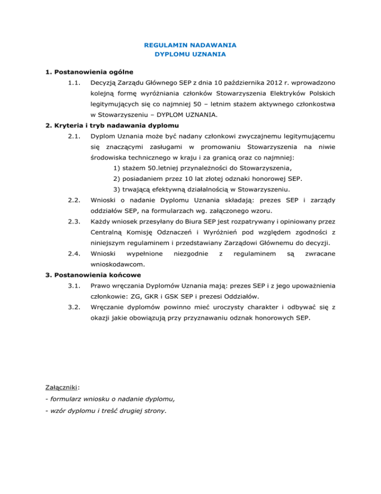 REGULAMIN NADAWANIA DYPLOMU UZNANIA 1. Postanowienia ogólne 1.1. Decyzją Zarządu Głównego SEP z dnia 10 października 2012 r. wprowadzono kolejną formę wyróżniania członków Stowarzyszenia Elektryków Polskich legitymujących się co najmniej 50 – letnim stażem aktywnego członkostwa w Stowarzyszeniu – DYPLOM UZNANIA. 2. Kryteria i tryb nadawania dyplomu 2.1. Dyplom Uznania może być nadany członkowi zwyczajnemu legitymującemu się znaczącymi zasługami w promowaniu Stowarzyszenia na niwie środowiska technicznego w kraju i za granicą oraz co najmniej: 1) stażem 50.letniej przynależności do Stowarzyszenia, 2) posiadaniem przez 10 lat złotej odznaki honorowej SEP. 3) trwającą efektywną działalnością w Stowarzyszeniu. 2.2. Wnioski o nadanie Dyplomu Uznania składają: prezes SEP i zarządy oddziałów SEP, na formularzach wg. załączonego wzoru. 2.3. Każdy wniosek przesyłany do Biura SEP jest rozpatrywany i opiniowany przez Centralną Komisję Odznaczeń i Wyróżnień pod względem zgodności z niniejszym regulaminem i przedstawiany Zarządowi Głównemu do decyzji. 2.4. Wnioski wypełnione niezgodnie z regulaminem są zwracane wnioskodawcom. 3. Postanowienia końcowe 3.1. Prawo wręczania Dyplomów Uznania mają: prezes SEP i z jego upoważnienia członkowie: ZG, GKR i GSK SEP i prezesi Oddziałów. 3.2. Wręczanie dyplomów powinno mieć uroczysty charakter i odbywać się z okazji jakie obowiązują przy przyznawaniu odznak honorowych SEP. Załączniki: - formularz wniosku o nadanie dyplomu, - wzór dyplomu i treść drugiej strony.