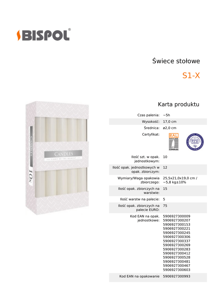 Świece stołowe S1-X Karta produktu Czas palenia: ~5h Wysokość: 17,0 cm Średnica: ø2,0 cm Certyfikat: Ilość szt. w opak. jednostkowym: 10 Ilość opak. jednostkowych w opak. zbiorczym: 12 Wymiary/Waga opakowia zbiorczego: 25,5x21,0x19,0 cm / ~5,8 kg±10% Ilość opak. zbiorczych na warstwie: 15 Ilość warstw na palecie: Ilość opak. zbiorczych na palecie EURO: 5 75 Kod EAN na opak. jednostkowe: 5906927300009 5906927300207 5906927300153 5906927300221 5906927300245 5906927300306 5906927300337 5906927300269 5906927300283 5906927300412 5906927300528 5906927300481 5906927300467 5906927300603 Kod EAN na opakowanie 5906927300993 Powered by TCPDF (www.tcpdf.org) zbiorcze: 5906927300962 5906927300979 5906927300955 5906927300948 5906927300917 5906927300900 5906927300931 5906927300924 5906927300863 5906927300825 5906927300849 5906927300856 5906927300818 Kod EAN na palete: 5906927904825 5906927904856 5906927904849 5906927904863 5906927904870 5906927904887 5906927904894 5906927904931 5906927904979 5906927904955 5906927904948 5906927904986