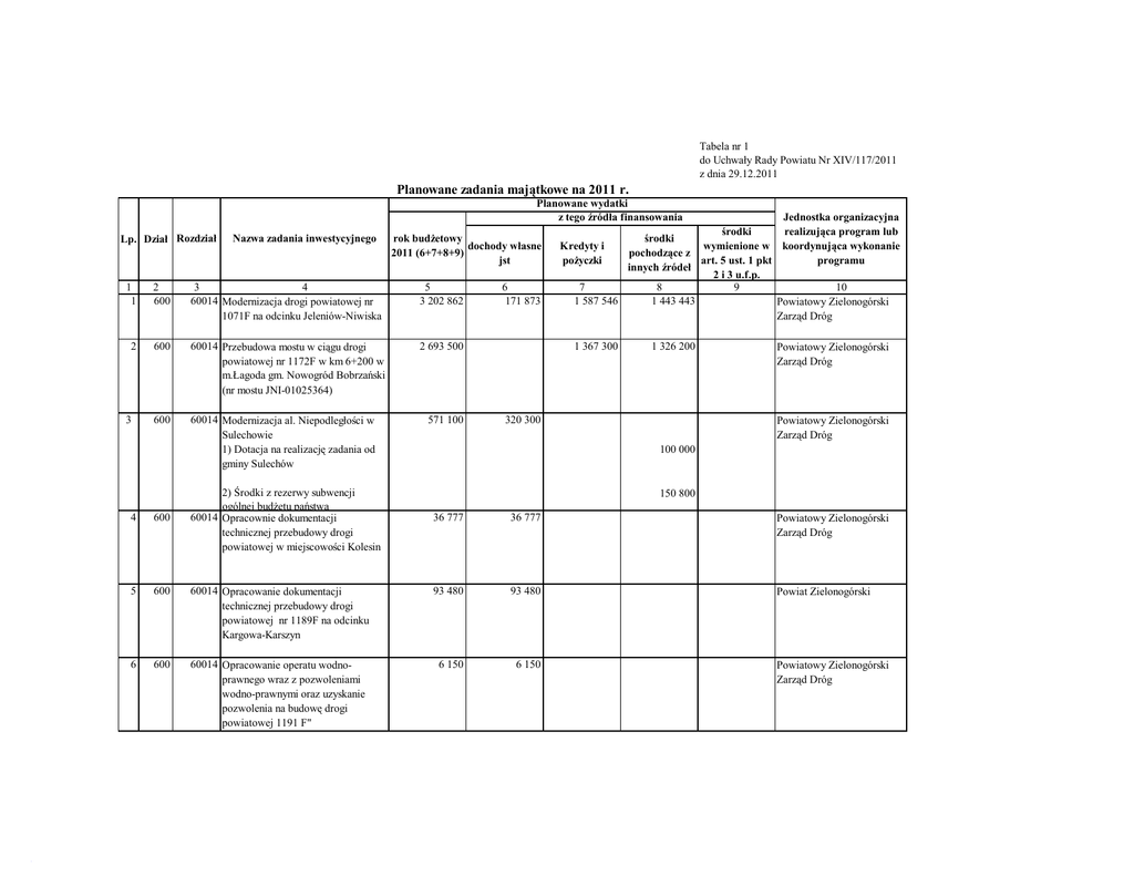 Tabela nr 1 do Uchwały Rady Powiatu Nr XIV/117/2011 z dnia 29.12.2011 Planowane zadania majątkowe na 2011 r. Planowane wydatki z tego źródła finansowania Lp. Dział Rozdział Nazwa zadania inwestycyjnego rok budżetowy dochody własne 2011 (6+7+8+9) jst 1 1 2 600 3 4 60014 Modernizacja drogi powiatowej nr 1071F na odcinku Jeleniów-Niwiska 5 3 202 862 2 600 60014 Przebudowa mostu w ciągu drogi powiatowej nr 1172F w km 6+200 w m.Łagoda gm. Nowogród Bobrzański (nr mostu JNI-01025364) 2 693 500 600 60014 Modernizacja al. Niepodległości w Sulechowie 1) Dotacja na realizację zadania od gminy Sulechów 3 4 600 5 600 6 600 2) Środki z rezerwy subwencji ogólnej budżetu państwa 60014 Opracownie dokumentacji technicznej przebudowy drogi powiatowej w miejscowości Kolesin 571 100 6 171 873 Jednostka organizacyjna środki realizująca program lub środki Kredyty i wymienione w koordynująca wykonanie pochodzące z programu pożyczki art. 5 ust. 1 pkt innych źródeł 2 i 3 u.f.p. 7 8 9 10 1 587 546 1 443 443 Powiatowy Zielonogórski Zarząd Dróg 1 367 300 1 326 200 320 300 Powiatowy Zielonogórski Zarząd Dróg Powiatowy Zielonogórski Zarząd Dróg 100 000 150 800 36 777 36 777 Powiatowy Zielonogórski Zarząd Dróg 60014 Opracowanie dokumentacji technicznej przebudowy drogi powiatowej nr 1189F na odcinku Kargowa-Karszyn 93 480 93 480 Powiat Zielonogórski 60014 Opracowanie operatu wodnoprawnego wraz z pozwoleniami wodno-prawnymi oraz uzyskanie pozwolenia na budowę drogi powiatowej 1191 F" 6 150 6 150 Powiatowy Zielonogórski Zarząd Dróg 7 600 60014 Zakup głowicy do pogłębiania rowów 30 000 30 000 Powiatowy Zielonogórski Zarząd Dróg 8 700 12 300 12 300 Powiat Zielonogórski 9 710 70005 Wykonanie dokumentacji technicznej modernizacji dachu budynku zlokalizowanego w Sulechowie przy al.. Niepodległości 15 inwentaryzacja 71014 Opracowanie studium wykonalności do Projektu pn. "e-Geodezja Powiatu Zielonogórskiego" 15 000 2 250 12 750 Powiat Zielonogórski 10 710 71014 Zakup skanera A3 oraz zestawu komputerowego z oprogramowaniem Windows i Office 10 000 10 000 Powiatowy Ośrodek Dokumentacji Geodezyjnej i Kartograficznej 11 710 71014 Zakup licencji GEO-INFO V Mapa oraz GEO-INFO V Mapa LT z modułem R z edytorami graficznymi 30 000 30 000 Powiatowy Ośrodek Dokumentacji Geodezyjnej i Kartograficznej 12 750 75095 Projekt "Lubuski e-Urząd" 69 503 69 503 Powiat Zielonogórski 13 801 80120 Wymiana kotła centralnego ogrzewania w budynku szkoły 28 369 28 369 Liceum Ogólnokształcace w Sulechowie 14 801 80195 Zakup maszyny do mycia naczyń 10 400 10 400 15 801 80195 Zakup programu komputerowego wspomagającego zarządzanie powiatową oświatą 5 280 5 280 Zespół Szkół Ponadgimnazjalnych w Sulechowie Powiat Zielonogórski 16 851 85111 Przebudowa kanalizacji sanitarnej w SPZOZ w Sulechowie 30 000 30 000 Powiat Zielonogórski 17 852 85202 Modernizacja budynku administracyjno-mieszkalnego w Domu Pomocy Społecznej w Trzebiechowie 18 852 19 852 85202 Modernizacja windy w budynku głównym 85202 Dokumentacja techniczna modernizacji drenażu opaskowego wraz z przedmiarem i kosztorysem inwestorskim oraz pozwoleniem na budowę 20 852 85202 Modernizacja drenażu opaskowego wraz z udrożnieniem trzech studzienek 21 853 85333 Instalacja systemu alarmowego w filii Powiatowego Urzędu Pracy w Sulechowie 22 854 85421 Zakup samochodu osobowego typu VAN 23 854 85495 Zakup wyparzacza do naczyń 126 034 126 034 Dom Pomocy Społecznej w Trzebiechowie 5 400 5 400 16 000 16 000 Dom Pomocy Społecznej w Bełczu Dom Pomocy Społecznej w Bełczu 13 379 13 379 4 896 4 896 103 000 103 000 5 350 5 350 Dom Pomocy Społecznej w Bełczu Powiatowy Urząd Pracy Powiat Zielonogórski Młodzieżowy Ośrodek Socjoterapii w Przytoku 24 854 85495 Zakup kosiarki do trawy 25 900 90005 Termomodernizacja budynku Szpitala w Wojnowie - wymiana części dachu oraz 2 szt. Drzwi zewnętrznych od strony frontowej i od strony jeziora i przebudowa pomieszczeń sanitarnych dla osób niepełnosprawnych 9 800 9 800 205 673 150 000 Młodzieżowy Ośrodek Socjoterapii w Przytoku Powiat Zielonogórski 55 673 1) Wydatki związane z rozbiórką dachu i remontem łazienek w budynku Szpitala (finansowanie ze środków własnych budżetu Powiatu) 26 27 900 900 90005 Dokumentacja techniczna Termomodernizacji budynku w Sulechowie przy al. Niepodległości 15 (finansowanie ze środków własnych budżetu Powiatu) 48 600 90005 Termomodernizacja budynku ZSP w Sulechowie przy ul. Piaskowej 53 282 587 Powiat Zielonogórski 900 90005 Wykonanie nowej instalacji c.o.i instalacji wod.-kan. w pomieszczeniach terapii zajęciowej w budynku głównym Domu Pomocy Społecznej w Trzebiechowie (finansowanie ze środków własnych budżetu Powiatu) 230 273 Powiat Zielonogórski 1)wydatki finansowane ze środków własnych budżetu Powiatu 28 48 600 52 314 14 298 14 298 Powiat Zielonogórski 29 30 900 900 90005 Modernizacja instalacji wentylacyjnej w kuchni oraz wykonanie nowej wentylacji pomieszczeń terapii zajęciowej i relaksacji zdrowotnej w budynku głównym Domu Pomocy Społecznej w Trzebiechowie (finansowanie ze środków własnych budżetu Powiatu) 27 645 90005 Modernizacja instalacji centralnego ogrzewania w budynkach DPS w Trzebiechowie (finansowanie ze środków własnych budżetu Powiatu) 108 759 626 526 626 526 Powiat Zielonogórski 9 000 9 000 Powiat Zielonogórski 8 451 668 2 463 629 31 921 92118 Projekt "Rewitalizacja budynku Lubuskiego Muzeum Wojskowego w Drzonowie" 32 921 92118 Zakup i wymiana centrali telefonicznej w Lubuskim Muzeum Wojskowym w Drzonowie Ogółem 27 645 Powiat Zielonogórski 108 759 Powiat Zielonogórski 2 954 846 3 020 443 12 750 x