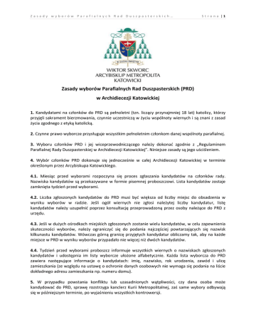 Zasady wyborów Parafialnych Rad Duszpasterskich… S t r o n a |1 Zasady wyborów Parafialnych Rad Duszpasterskich (PRD) w Archidiecezji Katowickiej 1. Kandydatami na członków do PRD są pełnoletni (tzn. liczący przynajmniej 18 lat) katolicy, którzy przyjęli sakrament bierzmowania, czynnie uczestniczą w życiu wspólnoty wiernych i są znani z zasad życia zgodnego z etyką katolicką. 2. Czynne prawo wyborcze przysługuje wszystkim pełnoletnim członkom danej wspólnoty parafialnej. 3. Wyboru członków PRD i jej wiceprzewodniczącego należy dokonać zgodnie z „Regulaminem Parafialnej Rady Duszpasterskiej w Archidiecezji Katowickiej”. Niniejsze zasady są jego uściśleniem. 4. Wybór członków PRD dokonuje się jednocześnie w całej Archidiecezji Katowickiej w terminie określonym przez Arcybiskupa Katowickiego. 4.1. Miesiąc przed wyborami rozpoczyna się proces zgłaszania kandydatów na członków rady. Nazwiska kandydatów są przekazywane w formie pisemnej proboszczowi. Lista kandydatów zostaje zamknięta tydzień przed wyborami. 4.2. Liczba zgłoszonych kandydatów do PRD musi być większa od liczby miejsc do obsadzenia w wyniku wyborów w radzie. Jeśli ogół wiernych nie zgłosi należytej liczby kandydatur, listę kandydatów należy uzupełnić poprzez konsultację przeprowadzoną przez osoby należące do PRD z urzędu. 4.3. Jeśli w dużych ośrodkach miejskich zgłoszonych zostanie wielu kandydatów, w celu zapewnienia skuteczności wyborów, należy ograniczyć się do podania najczęściej powtarzających się nazwisk kilkunastu kandydatów. Wówczas górną granicę przyjętych kandydatur obliczamy tak, aby na każde miejsce w PRD w wyniku wyborów przypadało nie więcej niż dwóch kandydatów. 4.4. Tydzień przed wyborami proboszcz informuje wszystkich wiernych o nazwiskach zgłoszonych kandydatów i udostępnia im listy wyborcze ułożone alfabetycznie. Każda lista wyborcza do PRD zawiera następujące informacje o kandydatach: imię, nazwisko, rok urodzenia, zawód i ulicę zamieszkania (ze względu na ustawę o ochronie danych osobowych nie wymaga się podania na liście dokładnego adresu zamieszkania np. numeru domu). 5. W przypadku powstania konfliktu lub uzasadnionych wątpliwości, czy dana osoba może kandydować do PRD, sprawę rozstrzyga kanclerz Kurii Metropolitalnej, zaś same wybory odbywają się w późniejszym terminie, po wyjaśnieniu wszystkich kontrowersji. Zasady wyborów Parafialnych Rad Duszpasterskich… S t r o n a |2 6. W dniu wyborów przeprowadzanych po każdej Mszy św., w myśl punktu 4.3, każdy z głosujących wybiera spośród przedstawionych na karcie wyborczej kandydatów dwa nazwiska, stawiając przy nich znak „X”. Jeśli na karcie wyborczej wierny zaznaczy więcej niż dwa nazwiska, tylko dwa pierwsze będą uwzględnione przy podsumowaniu wyników wyborów. 7. Po oddaniu głosu, wierni składają karty wyborcze do przygotowanych koszyków (np. przy wyjściu z kościoła) albo do urn wyborczych, wystawionych w odpowiednim pomieszczeniu parafii. 8. Głosy oddane na kandydatów, którzy wcześniej nie znaleźli się na liście osób zgłoszonych do kandydowania są uznane za nieważne. 9. Podliczenia głosów dokonuje specjalna komisja wyborcza złożona z 2 – 5 osób wyznaczonych przez proboszcza. Komisja sporządza protokół z wyborów i zachowuje oddane karty wyborcze przez miesiąc. 10. Podanie wyników wyborów oraz pełnego składu PRD do publicznej wiadomości następuje po upływie tygodnia od dnia wyborów, w ramach ogłoszeń duszpasterskich. 11. W przypadkach uzasadnionych zastrzeżeń co do formalnej poprawności przeprowadzonych wyborów, odwołanie do kanclerza Kurii Metropolitalnej można złożyć w ciągu dwóch tygodni od dnia wyborów. 12. Po ogłoszeniu wyników wyborów do PRD, jej nowi członkowie zastępują dotychczasowych członków rady. 13. Arcybiskup Katowicki może odłożyć w czasie wybory do PRD w danej wspólnocie, jeśli za utrzymaniem kadencji dotychczasowej PRD przemawiają uzasadnione racje duszpasterskie. W takiej sytuacji z wnioskiem do kanclerza Kurii Metropolitalnej występuje proboszcz. Katowice, 4 kwietnia 2012 r. VA I – 7119/12 ks. dr Grzegorz Olszowski †Wiktor Skworc Kanclerz Arcybiskup Metropolita Kurii Metropolitalnej Katowicki