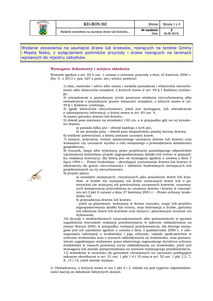 KD-ROS.102 Wydanie zezwolenia na usunięcie drzew lub krzewów... Strona Strona 1 z 4 Nr wydania Data 3 28.08.2015r. Wydanie zezwolenia na usunięcie drzew lub krzewów, rosnących na terenie Gminy i Miasta Nisko, z wyłączeniem pomników przyrody i drzew rosnących na terenach wpisanych do rejestru zabytków. Wymagane dokumenty i miejsce składania Wniosek zgodnie z art. 83 b ust. 1 ustawy o ochronie przyrody z dnia 16 kwietnia 2004 r. (Dz. U. z 2013 r, poz. 627 z poźn. zm.) winien zawierać: 1) imię, nazwisko i adres albo nazwę i siedzibę posiadacza i właściciela nieruchomości albo właściciela urządzeń, o których mowa w art. 49 § 1 Kodeksu cywilne go, 2) oświadczenie o posiadanym tytule prawnym władania nieruchomością albo oświadczenie o posiadanym prawie własności urządzeń, o których mowa w art. 49 § 1 Kodeksu cywilnego, 3) zgodę właściciela nieruchomości, jeżeli jest wymagana, lub oświadczenie o udostępnieniu informacji, o której mowa w art. 83 ust. 4, 4) nazwę gatunku drzewa lub krzewu, 5) obwód pnia mierzony na wysokości 130 cm, a w przypadku gdy na tej wysoko ści drzewo: a) posiada kilka pni – obwód każdego z tych pni, b) nie posiada pnia – obwód pnia bezpośrednio poniżej korony drzewa, 6) wielkość powierzchni, z której zostanie usunięty krzew, 7) miejsce, przyczynę, termin zamierzonego usunięcia drzewa lub krzewu oraz wskazanie czy usunięcie wynika z celu związanego z prowadzeniem działalności gospodarczej, 8) rysunek, mapę albo wykonany przez projektanta posiadającego odpowiednie uprawnienia budowlane projekt zagospodarowania działki lub terenu w przypadku realizacji inwestycji, dla której jest on wymagany zgodnie z ustawą z dnia 7 lipca 1994 r. - Prawo budowlane – określające usytuowanie drzewa lub krzewu w odniesieniu do granic nieruchomości i obiektów budowlanych istniejących lub projektowanych na tej nieruchomości, 9) projekt planu: a) nasadzeń zastępczych, rozumianych jako posadzenie drzew lub krzewów, w liczbie nie mniejszej niż liczba usuwanych drzew lub o powierzchni nie mniejszej niż powierzchnia usuwanych krzewów, stanowiących kompensację przyrodniczą za usuwane drzewa i krzewy w rozumieniu art.3 pkt 8 ustawy z dnia 27 kwietnia 2001 r. - Prawo ochrony środo wiska lub b) przesadzenia drzewa lub krzewu - jeżeli są planowane, wykonany w formie rysunku, mapy lub projektu zagospodarowania działki lub terenu, oraz informację o liczbie, gatunku lub odmianie drzew lub krzewów oraz miejscu i planowanym terminie ich wykonania, 10) decyzję o środowiskowych uwarunkowaniach albo postanowienie w sprawie uzgodnienia warunków realizacji przedsięwzięcia w zakresie oddziaływania na obszar Natura 2000, w przypadku realizacji przedsięwzięcia, dla którego wymagane jest ich uzyskanie zgodnie z ustawą z dnia 3 października 2008 r. o udo stępnianiu informacji o środowisku i jego ochronie, udziale społeczeństwa w ochronie środowiska oraz o ocenach oddziaływania na środowisko, oraz postanowienie uzgadniające wydawane przez właściwego regionalnego dyrektora ochrony środowiska w ramach ponownej oceny oddziaływania na środowisko, jeżeli jest wymagana lub została przeprowadzona na wniosek realizującego przedsięwzięcie, 11) zezwolenie w stosunku do gatunków chronionych na czynności podlegające zakazom określonym w art. 51 ust. 1 pkt 1-4 i 10 oraz w art. 52 ust. 1 pkt 1,3, 7, 8, 13 i 15, jeżeli zostało wydane, 2. Oświadczenia, o których mowa w ust.1 pkt 2 i 3, składa się pod rygorem odpowiedzial ności karnej za składanie fałszywych zeznań. KD-ROS.102 Wydanie zezwolenia na usunięcie drzew lub krzewów... Strona Strona 2 z 4 Nr wydania Data 3 28.08.2015r. Dokumenty należy składać w biurze obsługi Urzędu Gminy i Miasta Pl. Wolności 14, po kój nr 7 (poniedziałek - piątek godz, 7:30 – 15:30) Termin i sposób załatwienia sprawy Decyzję wydaje się w ciągu 30 dni od dnia wpłynięcia kompletnego wniosku, wniosek rozpatruje sie bez zbędnej zwłoki – zgodnie z art. 35 §1 kpa. Po złożeniu wniosku przeprowadza się na miejscu wnioskowanego do wycięcia drzewa rozprawę administracyjną celem przeprowadzenia oględzin i złożenia wyjaśnień przez strony postępowania. Opłaty Nie obowiązuje opłata skarbowa od wydanego zezwolenia, jeżeli wnioskodawca działa przez pełnomocnika wówczas obowiązuje opłata skarbowa w kwocie 17,00 zł od udzielonego pełnomocnictwa. Sposób odwołania Wnioskodawcy przysługuje prawo złożenia odwołania, za pośrednictwem Burmistrza Gminy i Miasta Nisko, do Samorządowego Kolegium Odwoławczego w Tarnobrzegu ul. Św. Barbary 12, w terminie 14 dni od doręczenia decyzji – zezwolenia. Podstawa prawna Ustawa z dnia 16 kwietnia 2004 o ochronie przyrody (Dz. U. z 2013 r., poz. 627 z poźn. zm.). Rozporządzenie Ministra Środowiska z dnia 13 października 2004r w sprawie stawek opłat dla poszczególnych rodzajów i gatunku drzew (Dz. U. Nr 228, poz. 2206 z poźn. zm.). Obwieszczenie Ministra Środowiska z dnia 18 października 2008 r. w sprawie stawek opłat za usunięcie drzew i krzewów oraz kar za zniszczenie zieleni na rok 2009 (M.P. Z 2008 r. Nr 82, poz. 725). Miejsce załatwienia sprawy Urząd Gminy i Miasta w Nisku – Referat Ochrony Środowiska pok. nr 13, tel. (0-15) 8415724 e-mail: [email protected] Osoba odpowiedzialna – Stanisław Radewicz. inspektor d/s. utrzymania zieleni i czystości w gminie. Informacje dodatkowe W przypadku usuwania drzew lub krzewów z terenu nieruchomości wpisanej do rejestru zabytków wniosek należy złożyć do Wojewódzkiego Konserwatora Zabytków w Przemyślu Delegatura w Tarnobrzegu. KD-ROS.102 Wydanie zezwolenia na usunięcie drzew lub krzewów... Strona Strona 3 z 4 Nr wydania Data 3 28.08.2015r. Nisko, dn. .................... r. Na podstawie art. 83 a, art. 83 b ust. 1 ustawy z dnia 16 kwietnia 2004 r. o ochronie przyrody (Dz. U. 2013.627) WNIOSEK O WYDANIE ZEZWOLENIA NA USUNIĘCIE 