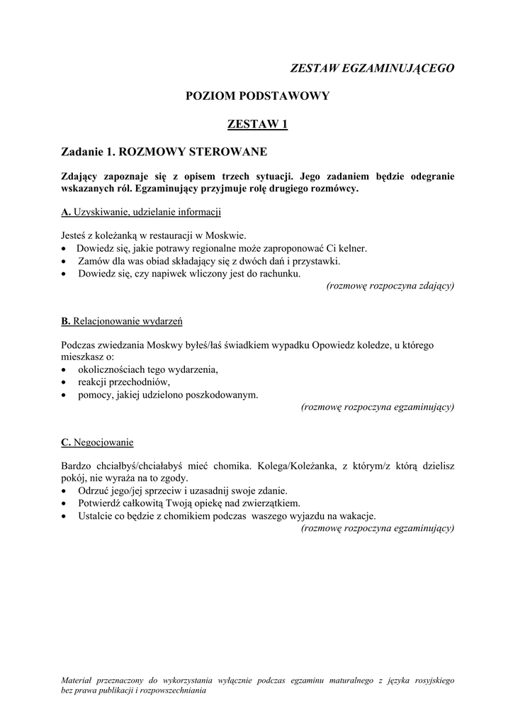 ZESTAW EGZAMINUJĄCEGO POZIOM PODSTAWOWY ZESTAW 1 Zadanie 1. ROZMOWY STEROWANE Zdający zapoznaje się z opisem trzech sytuacji. Jego zadaniem będzie odegranie wskazanych ról. Egzaminujący przyjmuje rolę drugiego rozmówcy. A. Uzyskiwanie, udzielanie informacji Jesteś z koleżanką w restauracji w Moskwie. • Dowiedz się, jakie potrawy regionalne może zaproponować Ci kelner. • Zamów dla was obiad składający się z dwóch dań i przystawki. • Dowiedz się, czy napiwek wliczony jest do rachunku. (rozmowę rozpoczyna zdający) B. Relacjonowanie wydarzeń Podczas zwiedzania Moskwy byłeś/łaś świadkiem wypadku Opowiedz koledze, u którego mieszkasz o: • okolicznościach tego wydarzenia, • reakcji przechodniów, • pomocy, jakiej udzielono poszkodowanym. (rozmowę rozpoczyna egzaminujący) C. Negocjowanie Bardzo chciałbyś/chciałabyś mieć chomika. Kolega/Koleżanka, z którym/z którą dzielisz pokój, nie wyraża na to zgody. • Odrzuć jego/jej sprzeciw i uzasadnij swoje zdanie. • Potwierdź całkowitą Twoją opiekę nad zwierzątkiem. • Ustalcie co będzie z chomikiem podczas waszego wyjazdu na wakacje. (rozmowę rozpoczyna egzaminujący) Materiał przeznaczony do wykorzystania wyłącznie podczas egzaminu maturalnego z języka rosyjskiego bez prawa publikacji i rozpowszechniania ZESTAW EGZAMINUJĄCEGO POZIOM PODSTAWOWY ZESTAW 1 Zadanie 2. ROZMOWA NA PODSTAWIE ILUSTRACJI Zdający opisuje poniższą ilustrację i odpowiada na pytania egzaminującego. Pytania do ilustracji: 1. Куда, по-твоему, ехали эти люди и почему они остановились на мосту? 2. Каким человеком должен быть твой будущий муж/должна быть твоя будущая жена? www.rambler.ru fot.87/960 Materiał przeznaczony do wykorzystania wyłącznie podczas egzaminu maturalnego z języka rosyjskiego bez prawa publikacji i rozpowszechniania